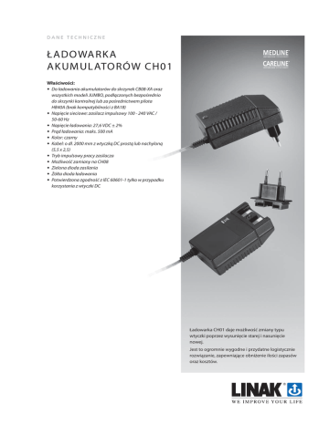 DANE TECHNICZNE ŁADOWARKA AKUMULATORÓW CH01 Właściwości: • Do ładowania akumulatorów do skrzynek CB08-XA oraz wszystkich modeli JUMBO, podłączonych bezpośrednio do skrzynki kontrolnej lub za pośrednictwem pilota HB40A (brak kompatybilności z BA18) • Napięcie sieciowe: zasilacz impulsowy 100 - 240 VAC / 50-60 Hz • Napięcie ładowania: 27,6 VDC ± 2% • Prąd ładowania: maks. 500 mA • Kolor: czarny • Kabel: o dł. 2000 mm z wtyczką DC prostą lub nachyloną (5,5 x 2,5) • Tryb impulsowy pracy zasilacza • Możliwość zamiany na CH08 • Zielona dioda zasilania • Żółta dioda ładowania • Potwierdzona zgodność z IEC 60601-1 tylko w przypadku korzystania z wtyczki DC Ładowarka CH01 daje możliwość zmiany typu wtyczki poprzez wysunięcie starej i nasunięcie nowej. Jest to ogromnie wygodne i przydatne logistycznie rozwiązanie, zapewniające obniżenie ilości zapasów oraz kosztów. Wtyczka europejska Wtyczka angielska Wtyczka golarki Wtyczka amerykańska/japońska Wtyczka australijska Moduł ładowania Moduł ładowania: Numer części: 10CH01S-00 (wtyczka prosta) 10CH01A-00 (wtyczka nachylona) Adapter wtyczki: Numer części: Wtyczka angielska 00CH01UK-00 Wtyczka australijska 00CH01AUS-00 Wtyczka europejska 00CH01EU-00 Wtyczka amerykańska/japońska/UL 00CH01US-00 Wtyczka golarki 00CH01IEC-00 Copyright © LINAK 2009.05 . MA M9-13-213-A . Rozdział 10.17 Prosimy zamawiać po 69 sztuk, ponieważ tyle sztuk znajduje się w opakowaniu. Warunki Użytkowania Za określenie przydatności produktów firmy LINAK do konkretnych zastosowań odpowiada użytkownik. Firma LINAK dołożyła wszelkich starań, aby dostarczyć dokładne i aktualne informacje o swoich produktach. Z uwagi na ciągły rozwój produkty firmy LINAK ulegają częstym zmianom, co odbywa się bez wcześniejszego zawiadomienia. Z tego powodu firma LINAK nie może zagwarantować, że powyższe informacje są prawdziwe i aktualne. Firma LINAK dokłada wszelkich starań, aby realizować wszystkie zamówienia. Niemniej z tych samych powodów, które podano wyżej, nie może zagwarantować pełnej dostępności każdego z wymienionych produktów. Z tego względu firma LINAK zastrzega sobie prawo do wstrzymania sprzedaży niektórych produktów, zamieszczonych na stronie internetowej lub w katalogach i innych wydanych przez siebie materiałach. Całość sprzedaży podlega standardowym warunkom sprzedaży i dostaw firmy LINAK. W celu uzyskania kopii powyższego dokumentu, prosimy o kontakt z firmą LINAK.