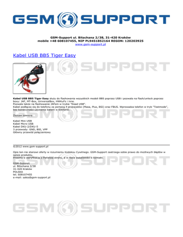 GSM-Support ul. Bitschana 2/38, 31-420 Kraków mobile +48 608107455, NIP PL9451852164 REGON: 120203925 www.gsm-support.pl Kabel USB BB5 Tiger Easy Kabel USB BB5 Tiger Easy służy do flashowania wszystkich modeli BB5 poprzez USB i pozwala na flash/unlock poprzez boxy: JAF, MT-Box, UniversalBox, HWKuFs i inne. Pozwala także na flashowanie JAFem w trybie "Dead USB". Kabel podłącza się do telefonu za pomocą 4 przewodów (Masa, Plus, BSI) oraz FBUS. Wprowadza telefon w tryb "Testmode", bez konieczności używania baterii w telefonie. Zestaw zawiera: Kabel Mini USB Kabel Micro USB Kabel DKU-2/DKU-5 3 przewody: GND, BSI, VPP Główny przewód połączeniowy ©2012 www.gsm-support.pl Opis ten nie stanowi oferty w rozumieniu Kodeksu Cywilnego. GSM-Support zastrzega sobie prawo do możliwych błędów w opisie produktu. Prosimy o weryfikację z Państwa strony, a w razie wątpliwości o kontakt. GSM-Support ul. Bitschana 2/38 31-420 Kraków POLSKA tel. 608107455 e-mail: [email protected] Powered by TCPDF (www.tcpdf.org)