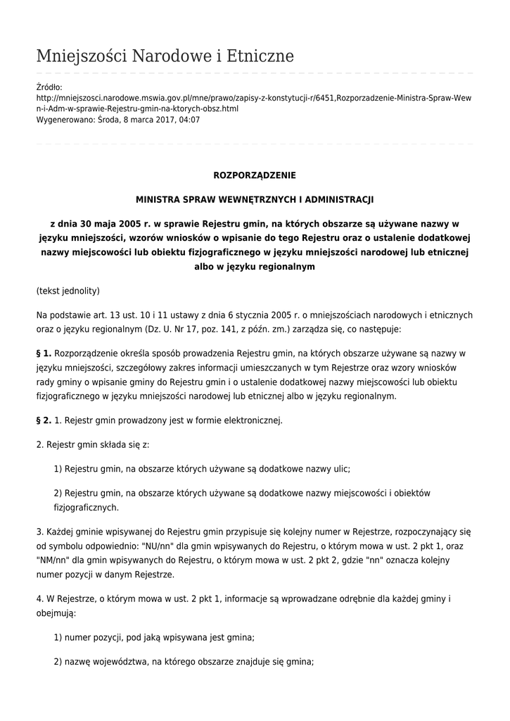 Mniejszości Narodowe i Etniczne Źródło: http://mniejszosci.narodowe.mswia.gov.pl/mne/prawo/zapisy-z-konstytucji-r/6451,Rozporzadzenie-Ministra-Spraw-Wew n-i-Adm-w-sprawie-Rejestru-gmin-na-ktorych-obsz.html Wygenerowano: Środa, 8 marca 2017, 04:07 ROZPORZĄDZENIE MINISTRA SPRAW WEWNĘTRZNYCH I ADMINISTRACJI z dnia 30 maja 2005 r. w sprawie Rejestru gmin, na których obszarze są używane nazwy w języku mniejszości, wzorów wniosków o wpisanie do tego Rejestru oraz o ustalenie dodatkowej nazwy miejscowości lub obiektu fizjograficznego w języku mniejszości narodowej lub etnicznej albo w języku regionalnym (tekst jednolity) Na podstawie art. 13 ust. 10 i 11 ustawy z dnia 6 stycznia 2005 r. o mniejszościach narodowych i etnicznych oraz o języku regionalnym (Dz. U. Nr 17, poz. 141, z późn. zm.) zarządza się, co następuje: § 1. Rozporządzenie określa sposób prowadzenia Rejestru gmin, na których obszarze używane są nazwy w języku mniejszości, szczegółowy zakres informacji umieszczanych w tym Rejestrze oraz wzory wniosków rady gminy o wpisanie gminy do Rejestru gmin i o ustalenie dodatkowej nazwy miejscowości lub obiektu fizjograficznego w języku mniejszości narodowej lub etnicznej albo w języku regionalnym. § 2. 1. Rejestr gmin prowadzony jest w formie elektronicznej. 2. Rejestr gmin składa się z: 1) Rejestru gmin, na obszarze których używane są dodatkowe nazwy ulic; 2) Rejestru gmin, na obszarze których używane są dodatkowe nazwy miejscowości i obiektów fizjograficznych. 3. Każdej gminie wpisywanej do Rejestru gmin przypisuje się kolejny numer w Rejestrze, rozpoczynający się od symbolu odpowiednio: "NU/nn" dla gmin wpisywanych do Rejestru, o którym mowa w ust. 2 pkt 1, oraz "NM/nn" dla gmin wpisywanych do Rejestru, o którym mowa w ust. 2 pkt 2, gdzie "nn" oznacza kolejny numer pozycji w danym Rejestrze. 4. W Rejestrze, o którym mowa w ust. 2 pkt 1, informacje są wprowadzane odrębnie dla każdej gminy i obejmują: 1) numer pozycji, pod jaką wpisywana jest gmina; 2) nazwę województwa, na którego obszarze znajduje się gmina; 3) nazwę powiatu, na którego obszarze znajduje się gmina; 4) nazwę gminy; 5) ogólną liczbę mieszkańców gminy; 6) ustaloną na podstawie wyników ostatniego spisu powszechnego liczbę mieszkańców gminy należących do mniejszości narodowej lub etnicznej, w języku której są proponowane dodatkowe nazwy, albo liczbę mieszkańców gminy posługujących się językiem regionalnym; 7) datę podjęcia oraz numer uchwały rady gminy w sprawie nadania dodatkowych nazw ulic; 8) datę podjęcia oraz numer uchwały rady gminy w sprawie złożenia wniosku o wpisanie gminy do Rejestru gmin, na obszarze których używane są dodatkowe nazwy; 9) datę wpisania gminy do Rejestru gmin. 5. W Rejestrze, o którym mowa w ust. 2 pkt 2, informacje są wprowadzane odrębnie dla każdej dodatkowej nazwy miejscowości lub obiektu fizjograficznego. Każdej dodatkowej nazwie przypisuje się numer składający się z numeru gminy, o którym mowa w ust. 3, oraz numeru pozycji, wynikającej z kolejności ustalania dodatkowych nazw w danej gminie. 6. Zakres informacji wprowadzanych do Rejestru, o którym mowa w ust. 2 pkt 2, obejmuje: 1) numer przypisany dodatkowej nazwie miejscowości lub obiektu fizjograficznego; 1a) identyfikator Państwowego Rejestru Nazw Geograficznych; 2) nazwę województwa, na którego obszarze znajduje się gmina; 3) nazwę powiatu, na którego obszarze znajduje się gmina; 4) nazwę gminy; 5) datę podjęcia oraz numer uchwały rady gminy w sprawie złożenia wniosku o wpisanie gminy do Rejestru gmin, na obszarze których używane są dodatkowe nazwy; 6) oznaczenie rodzaju nazwy (nazwa miejscowości, nazwa obiektu fizjograficznego); 7) ogólną liczbę mieszkańców gminy; 8) ustaloną na podstawie wyników ostatniego spisu powszechnego liczbę mieszkańców gminy należących do mniejszości narodowej lub etnicznej, w języku której są proponowane dodatkowe nazwy, albo liczbę mieszkańców gminy posługujących się językiem regionalnym; 9) w przypadku miejscowości zamieszkanej - liczbę mieszkańców tej miejscowości biorących udział w konsultacjach oraz liczbę mieszkańców miejscowości biorących udział w konsultacjach, którzy opowiedzieli się za wprowadzeniem dodatkowej nazwy miejscowości; 10) urzędową nazwę miejscowości lub obiektu fizjograficznego; 11) dodatkową nazwę miejscowości lub obiektu fizjograficznego, zapisaną w języku mniejszości; 11a) język, w którym została ustalona dodatkowa nazwa; 12) adnotacje dotyczące opinii: a) zarządów województw, na których terenie znajduje się obiekt fizjograficzny, dla którego ustalana jest dodatkowa nazwa w języku mniejszości lub w języku regionalnym, b) wojewody, c) Komisji Nazw Miejscowości i Obiektów Fizjograficznych; 13) datę wpisu dodatkowej nazwy miejscowości lub obiektu fizjograficznego do Rejestru gmin; 14) datę wykreślenia dodatkowej nazwy miejscowości lub obiektu fizjograficznego z Rejestru gmin. § 3. Wzór wniosku rady gminy o wpisanie gminy do Rejestru gmin określa załącznik nr 1 do rozporządzenia. § 4. Wzór wniosku rady gminy o ustalenie dodatkowej nazwy miejscowości lub obiektu fizjograficznego w języku mniejszości narodowej lub etnicznej albo w języku regionalnym określa załącznik nr 2 do rozporządzenia. § 5. Rozporządzenie wchodzi w życie po upływie 14 dni od dnia ogłoszenia. ZAŁĄCZNIKI ZAŁĄCZNIK Nr 1 WZÓR WNIOSEK o wpisanie gminy do Rejestru gmin, na obszarze których używane są dodatkowe nazwy miejscowości lub obiektów fizjograficznych albo ulic A. Dane ogólne Gmina ......................................................................................................................................................... (nazwa) Powiat ..............................................................................................................................................