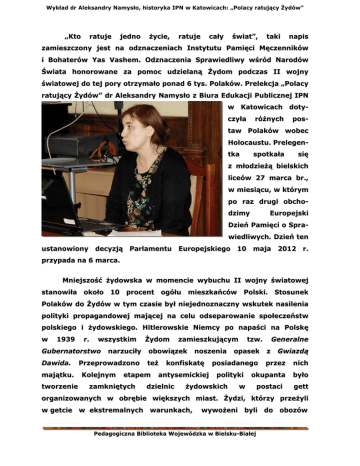 Wykład dr Aleksandry Namysło, historyka IPN w Katowicach: „Polacy ratujący Żydów” „K t o ratuje jedno życie, ratuje cały świat”, taki napis zamieszczony jest na odznaczeniach Instytutu Pamięci Męczenników i Bohaterów Yas Vashem. Odznaczenia Sprawiedliwy wśród Narodów Świata honorowane za pomoc udzielaną Żydom podczas II wojny światowej do tej pory otrzymało ponad 6 tys. Polaków. Prelekcja „Polacy ratujący Żydów” dr Aleksandry Namysło z Biura Edukacji Publicznej IPN w Katowicach dotyczyła różnych pos- taw Polaków wobec Holocaustu. Prelegentk a spotkała się z młodzieżą bielskich liceów 27 marca br., w miesiącu, w którym po raz drugi obchodzimy Europejski Dzień Pamięci o Sprawiedliwych. Dzień ten ustanowiony decyzją Parlamentu Europejskiego 10 maja 2012 r. przypada na 6 marca. Mniejszość żydowska w momencie wybuchu II wojny światowej stanowiła około 10 procent ogółu mieszkańców Polski. Stosunek Polaków do Żydów w tym czasie był niejednoznaczny wskutek nasilenia polityki propagandowej mającej na celu odseparowanie społeczeństw polskiego i żydowskiego. Hitlerowskie Niemcy po napaści na Polskę w 1939 r. wszystkim Gubernatorstwo Dawida. majątku. tworzenie narzuciły Przeprowadzono Kolejnym Żydom obowiązek też etapem zamkniętych zamieszkującym noszenia konfiskatę antysemickiej dzielnic tzw. opasek posiadanego polityki żydowskich Generalne z Gwiazdą przez nich okupanta było postaci gett w organizowanych w obrębie większych miast. Żydzi, którzy przeżyli w getcie w ekstremalnych warunkach, wywożeni byli do obozów Pedagogiczna Biblioteka Wojewódzka w Bielsku-Białej Wykład dr Aleksandry Namysło, historyka IPN w Katowicach: „Polacy ratujący Żydów” pracy, inni znacznie słabsi do obozów zagłady, tzw. fabryk śmierci. Holocaust mający na celu całkowite wyniszczenia narodu żydowskiego wzbudzał wśród Polaków współczucie i chęć niesienia pomocy, ale nierzadko też spotykał się z obojętnością, a wręcz niechęcią. Zachowania te wynikały często z lęku przed śmiercią, która wymierzana była przez okupanta za pomoc i ukrywanie Żydów. Stosowana jeszcze przed wojną propaganda mówiąca o zagrożeniu ekonomicznym i ideologicznym Żydów wobec Polski miała na celu odizolowanie obu narodowości. W świadomości laków to zaowocowało niechęcią Żydów. ków Po- wobec Wśród Polamożna było spotkać również postawy interesowne, mające na celu względy finansowe, a wręcz materialne, korzyści odnoszone przy tzw. szmuglerstwie, czyli wydawaniu Żydów Niemcom w zamian za pieniądze czy konfiskatę ich majątków. W przeciwieństwie do tych postaw wielu Polaków z narażeniem własnego życia pomagała Żydom ukrywając uciekinierów czy wręcz pomagając w ucieczce z getta. Formą pomocy było dostarczenie broni, żywności i lekarstw do getta funkcjonu- jącego w warunkach ekstremalnych, gdzie głód i choroby zabijały miliony osób. Dorota Pająk Pedagogiczna Biblioteka Wojewódzka w Bielsku-Białej