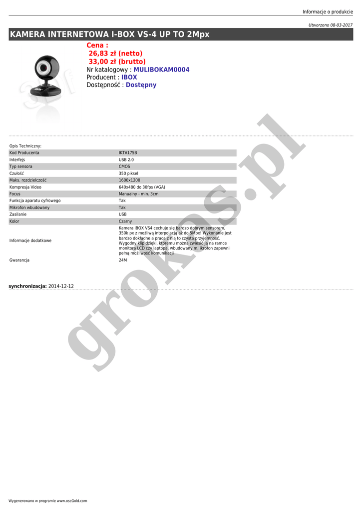 Informacje o produkcie Utworzono 08-03-2017 KAMERA INTERNETOWA I-BOX VS-4 UP TO 2Mpx Cena : 26,83 zł (netto) 33,00 zł (brutto) Opis Techniczny: .p l Nr katalogowy : MULIBOKAM0004 Producent : IBOX Dostępność : Dostępny IKTA175B Interfejs USB 2.0 Typ sensora CMOS Czułość 350 piksel Maks. rozdzielczość 1600x1200 Kompresja Video 640x480 do 30fps (VGA) Focus Manualny - min. 3cm Funkcja aparatu cyfrowego Tak Mikrofon wbudowany Tak Zasilanie USB Kolor Czarny Informacje dodatkowe Kamera iBOX VS4 cechuje się bardzo dobrym sensorem, 350k px z możliwą interpolacją aż do 5Mpx! Wykonanie jest bardzo dokładne a praca z nią to czysta przyjemność. Wygodny klip dźięki, któremu można zwiesić ją na ramce monitora LCD czy laptopa, wbudowany m, ikrofon zapewni pełną możliwość komunikacji 24M gr synchronizacja: 2014-12-12 ok Gwarancja as Kod Producenta Wygenerowano w programie www.oscGold.com