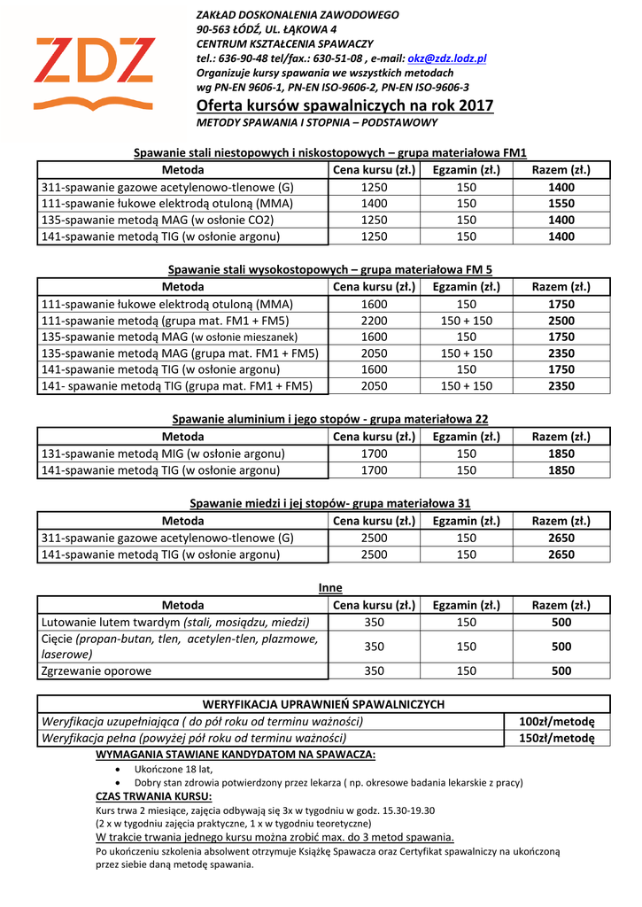 ZAKŁAD DOSKONALENIA ZAWODOWEGO 90-563 ŁÓDŹ, UL. ŁĄKOWA 4 CENTRUM KSZTAŁCENIA SPAWACZY tel.: 636-90-48 tel/fax.: 630-51-08 , e-mail: [email protected] Organizuje kursy spawania we wszystkich metodach wg PN-EN 9606-1, PN-EN ISO-9606-2, PN-EN ISO-9606-3 Oferta kursów spawalniczych na rok 2017 METODY SPAWANIA I STOPNIA – PODSTAWOWY Spawanie stali niestopowych i niskostopowych – grupa materiałowa FM1 Metoda Cena kursu (zł.) Egzamin (zł.) Razem (zł.) 311-spawanie gazowe acetylenowo-tlenowe (G) 1250 150 1400 111-spawanie łukowe elektrodą otuloną (MMA) 1400 150 1550 135-spawanie metodą MAG (w osłonie CO2) 1250 150 1400 141-spawanie metodą TIG (w osłonie argonu) 1250 150 1400 Spawanie stali wysokostopowych – grupa materiałowa FM 5 Metoda Cena kursu (zł.) Egzamin (zł.) 111-spawanie łukowe elektrodą otuloną (MMA) 1600 150 111-spawanie metodą (grupa mat. FM1 + FM5) 2200 150 + 150 135-spawanie metodą MAG (w osłonie mieszanek) 1600 150 135-spawanie metodą MAG (grupa mat. FM1 + FM5) 2050 150 + 150 141-spawanie metodą TIG (w osłonie argonu) 1600 150 141- spawanie metodą TIG (grupa mat. FM1 + FM5) 2050 150 + 150 Razem (zł.) 1750 2500 1750 2350 1750 2350 Spawanie aluminium i jego stopów - grupa materiałowa 22 Metoda Cena kursu (zł.) Egzamin (zł.) 131-spawanie metodą MIG (w osłonie argonu) 1700 150 141-spawanie metodą TIG (w osłonie argonu) 1700 150 Razem (zł.) 1850 1850 Spawanie miedzi i jej stopów- grupa materiałowa 31 Metoda Cena kursu (zł.) Egzamin (zł.) 311-spawanie gazowe acetylenowo-tlenowe (G) 2500 150 141-spawanie metodą TIG (w osłonie argonu) 2500 150 Razem (zł.) 2650 2650 Inne Metoda Cena kursu (zł.) Lutowanie lutem twardym (stali, mosiądzu, miedzi) 350 Cięcie (propan-butan, tlen, acetylen-tlen, plazmowe, 350 laserowe) Zgrzewanie oporowe 350 Egzamin (zł.) 150 Razem (zł.) 500 150 500 150 500 WERYFIKACJA UPRAWNIEŃ SPAWALNICZYCH Weryfikacja uzupełniająca ( do pół roku od terminu ważności) Weryfikacja pełna (powyżej pół roku od terminu ważności) 100zł/metodę 150zł/metodę WYMAGANIA STAWIANE KANDYDATOM NA SPAWACZA: Ukończone 18 lat, Dobry stan zdrowia potwierdzony przez lekarza ( np. okresowe badania lekarskie z pracy) CZAS TRWANIA KURSU: Kurs trwa 2 miesiące, zajęcia odbywają się 3x w tygodniu w godz. 15.30-19.30 (2 x w tygodniu zajęcia praktyczne, 1 x w tygodniu teoretyczne) W trakcie trwania jednego kursu można zrobić max. do 3 metod spawania. Po ukończeniu szkolenia absolwent otrzymuje Książkę Spawacza oraz Certyfikat spawalniczy na ukończoną przez siebie daną metodę spawania. ZAKŁAD DOSKONALENIA ZAWODOWEGO W ŁODZI 90-563 ŁÓDŹ, UL. ŁĄKOWA 4 tel.: 636-90-48 tel/fax.: 630-51-08 e-mail: [email protected] OFERTA KURSÓW NA 2017 r. NAZWA KURSU CZAS TRWANIA KURSU KOSZT/OS. 1. Kucharz małej gastronomii z elementami organizacji przyjęć okolicznościowych 2-3 miesiące 1750,00 2. Podstawy gotowania 1 miesiąc 900,00 3. Fryzjer - przyuczenie 2 miesiące 1680,00 4. Manicure-pedicure z elementami stylizacji paznokci (żel, akryl, hybryda) 1 miesiąc 900,00 5. Wizaż z elementami analizy kolorystycznej 2-3 tygodnie 450,00 6. Bukieciarstwo-florystyka 1-2 miesiące 1000,00 7. Decoupage 1 miesiąc 720,00 8. BHP dla inspektorów (okresowe) 1-2 tygodni 320,00 9. BHP – pracodawca, kadra kierownicza, admin-biur. (okresowe) 1-2 tygodni 170,00 10. BHP - stanowiska robotnicze 1-2 tygodni 120,00 11. Eksploatacja urządzeń elektroenergetycznych (SEP) – E gr.1 1-2 tygodni 500 w tym egz. 200,00 12. Eksploatacja urządzeń energetycznych (palacz c.o.) – E gr.2 1-2 tygodni 500 w tym egz. 200,00 13. Eksploatacja urządzeń gazowych – E gr.3 1-2 tygodni 500 w tym egz. 200,00 L.p. 15. Kierowca wózków jezdniowych 1 miesiąc 16. Magazynier z obsługą programów magazynowych 2 miesiące 380 w tym egz. 200,00 590 w tym egz. 152,00 UDT 840,00 2-3 miesiące 1330,00 18. Programowanie i obsługa CNC 2-3 miesiące 3450,00 19. Księgowość z elementami kadr, płac, ZUS 2-3 miesiące 1200,00 20. Pracownik administracyjno-biurowy 1 miesiąc 600,00 21. ABC własnej firmy 1 miesiąc 600,00 22. Komputer i internet dla seniora 1 miesiąc 240,00 23. Obsługa kas fiskalnych 1 miesiąc 200,00 24. Profesjonalny sprzedawca z obsługą kas fiskalnych 2 miesiące 990,00 25. Pracownik robót wykończeniowych 2-3 miesiące 2160,00 26. Opiekun osób zależnych 2-3 miesiące 1650,00 27. Pedagogiczny dla instruktorów praktycznej nauki zawodu 2 miesiące 800,00 28. Wychowawca kolonijny 1 miesiąc 200,00 29. Kierownik wypoczynku 1 tydzień 100,00 14. Autoklawy 17. Magazynier z obsługą programów magazynowych + obsługa wózków jezdniowych 2 dni