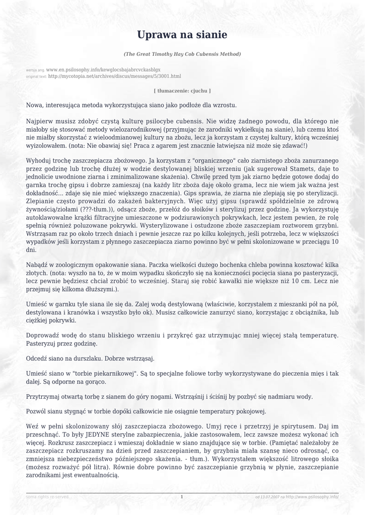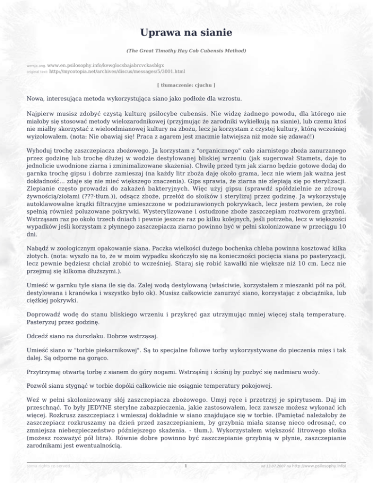 Uprawa na sianie (The Great Timothy Hay Cob Cubensis Method) wersja ang. www.en.psilosophy.info/kewglocsbajabrcvckasblgx original text: http://mycotopia.net/archives/discus/messages/5/3001.html [ tłumaczenie: cjuchu ] Nowa, interesująca metoda wykorzystująca siano jako podłoże dla wzrostu. Najpierw musisz zdobyć czystą kulturę psilocybe cubensis. Nie widzę żadnego powodu, dla którego nie miałoby się stosować metody wielozarodnikowej (przyjmując że zarodniki wykiełkują na sianie), lub czemu ktoś nie miałby skorzystać z wieloodmianowej kultury na zbożu, lecz ja korzystam z czystej kultury, którą wcześniej wyizolowałem. (nota: Nie obawiaj się! Praca z agarem jest znacznie łatwiejsza niż może się zdawać!) Wyhoduj trochę zaszczepiacza zbożowego. Ja korzystam z "organicznego" cało ziarnistego zboża zanurzanego przez godzinę lub trochę dłużej w wodzie destylowanej bliskiej wrzeniu (jak sugerował Stamets, daje to jednolicie uwodnione ziarna i zminimalizowane skażenia). Chwilę przed tym jak ziarno będzie gotowe dodaj do garnka trochę gipsu i dobrze zamieszaj (na każdy litr zboża daję około grama, lecz nie wiem jak ważna jest dokładność... zdaje się nie mieć większego znaczenia). Gips sprawia, że ziarna nie zlepiają się po sterylizacji. Zlepianie często prowadzi do zakażeń bakteryjnych. Więc użyj gipsu (sprawdź spółdzielnie ze zdrową żywnością/ziołami (???-tłum.)), odsącz zboże, przełóż do słoików i sterylizuj przez godzinę. Ja wykorzystuję autoklawowalne krążki filtracyjne umieszczone w podziurawionych pokrywkach, lecz jestem pewien, że rolę spełnią również poluzowane pokrywki. Wysterylizowane i ostudzone zboże zaszczepiam roztworem grzybni. Wstrząsam raz po około trzech dniach i pewnie jeszcze raz po kilku kolejnych, jeśli potrzeba, lecz w większości wypadków jeśli korzystam z płynnego zaszczepiacza ziarno powinno być w pełni skolonizowane w przeciągu 10 dni. Nabądź w zoologicznym opakowanie siana. Paczka wielkości dużego bochenka chleba powinna kosztować kilka złotych. (nota: wyszło na to, że w moim wypadku skończyło się na konieczności pocięcia siana po pasteryzacji, lecz pewnie będziesz chciał zrobić to wcześniej. Staraj się robić kawałki nie większe niż 10 cm. Lecz nie przejmuj się kilkoma dłuższymi.). Umieść w garnku tyle siana ile się da. Zalej wodą destylowaną (właściwie, korzystałem z mieszanki pół na pół, destylowana i kranówka i wszystko było ok). Musisz całkowicie zanurzyć siano, korzystając z obciążnika, lub ciężkiej pokrywki. Doprowadź wodę do stanu bliskiego wrzeniu i przykręć gaz utrzymując mniej więcej stałą temperaturę. Pasteryzuj przez godzinę. Odcedź siano na durszlaku. Dobrze wstrząsaj. Umieść siano w "torbie piekarnikowej". Są to specjalne foliowe torby wykorzystywane do pieczenia mięs i tak dalej. Są odporne na gorąco. Przytrzymaj otwartą torbę z sianem do góry nogami. Wstrząśnij i ściśnij by pozbyć się nadmiaru wody. Pozwól sianu stygnąć w torbie dopóki całkowicie nie osiągnie temperatury pokojowej. Weź w pełni skolonizowany słój zaszczepiacza zbożowego. Umyj ręce i przetrzyj je spirytusem. Daj im przeschnąć. To były JEDYNE sterylne zabazpieczenia, jakie zastosowałem, lecz zawsze możesz wykonać ich więcej. Rozkrusz zaszczepiacz i wmieszaj dokładnie w siano znajdujące się w torbie. (Pamiętać należałoby że zaszczepiacz rozkruszamy na dzień przed zaszczepianiem, by grzybnia miała szansę nieco odrosnąć, co zmniejsza niebezpieczeństwo późniejszego skażenia. - tłum.). Wykorzystałem większość litrowego słoika (możesz rozważyć pół litra). Równie dobre powinno być zaszczepianie grzybnią w płynie, zaszczepianie zarodnikami jest ewentualnością. soma rights re-served 1 od 13.07.2007 na http://www.psilosophy.info/ uprawa na sianie www.psilosophy.info/kewglocsbajabrcvckasblgx Pozwól sianu poleżeć w torbie przez trzy, cztery dni. Torba powinna być luźno zakręcona, lecz nie uszczelniona bądź zawiązana. Trzeba pozwolić na pewne oddychanie, zatrzymując jednocześnie większość wilgotności. Grzybnia powinna bujnie rozrosnąć się na sianie po 3-4 dniach. Pomiędzy wstrząśnięciami rozgniataj i rozrywaj siano w torbie, dotykając jej zewnętrznej powierzchni. Trzeba rozbijać większe zbitki grzybni i rozmieszczać je po całym sianie. Możesz również uchylić torbę i zadziałać na zasadzie miecha, by pomóc w wymianie powietrza. Może być tak, że siano zrobi w torbie wiele małych otworków. To nawet dobrze, gdyż pomoże to w oddychaniu. W kilku miejscach zrosiłem siano kilka razy destylowaną wodą, robiąc mgiełkę spryskiwaczem, w obawie, że mogłoby wyschnąć. Lecz wątpię by było to konieczne, pomimo bardzo suchego klimatu. Co kilka dni, powtarzaj procedurę rozrywania, mieszania i napowietrzania. NIE martw się zakażeniami. Jeśli właściwie spasteryzowałeś siano, powinno minąć kilka tygodni zanim coś innego, naprawdę będzie miało szansę konkurować z grzybnią. Gdy siano wygląda tak, że na każdym jego calu widać grzybnię, pozostaw go w spokoju do całkowitej kolonizacji. Cały proces powinien zająć trochę poniżej czternastu dni. Jeśli całe siano pokrywa przynajmniej rzadka grzybnia (i jeśli dobrze ją rozprowadzałeś przy mieszaniu), gotowe jest do rozłożenia. Możesz wykorzystać jakikolwiek układ terrariumowy używany przy ciastkach PF, lub skorzystać z poniższego opisu wykorzystującego niskobudżetowe , tradycyjne rozwiązania techniczne. 1. Weź jakiś duży plastikowy pojemnik przechowalniczy, arkusz folii i trochę gęstej, sztywnej siatki ogrodzeniowej. W jednym z rogów pojemnika wypal otwór. Dobrze go wymyj. 2. Dotnij kawałek siatki i pozaginaj krawędzie, tak by utworzyć platformę, której powierzchnia znajdzie się co najmniej 2 cm ponad dnem pojemnika. Włóż ją do pojemnika. Wnętrze