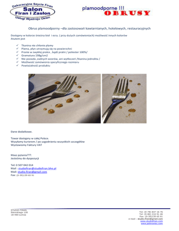 Obrus plamoodporny –dla zastosowań kawiarnianych, hotelowych, restauracyjnych Dostępny w kolorze śnieżna biel i ecry. ( przy dużych zamówieniach) możliwość innych kolorów Atutem jest Tkanina nie chłonie plamy Plama, płyn utrzymują się na powierzchni Pranie w zwykłej pralce , bądź pralni / poliester 100%/ Gramatura 198g/cm2 Nie posiada ,żadnych wzorów, ani wytłoczeń /tkanina jednolita / Możliwość zamówienia specyficznego rozmiaru Powtażalność produktu Dane dodatkowe. Towar dostępny w całej Polsce. Wysyłamy kurierem / po uzgodnieniu wszystkich szczegółów Wystawiamy Faktury VAT Masz pytania???. Jesteśmy do dyspozycji Tel: 0 507 042 014 Mail : [email protected] Mail: [email protected] Fax: (0-39)139 65 91 STUDIO FIRAN Sikorskiego 120 18-400 ŁomŜa Tel: (0-78) 837 16 76 Tel: (0-86) 216 91 46 Fax: (0-39)139 65 91 e-mail : [email protected] www.studiofiran.com www.pokrowiec.com