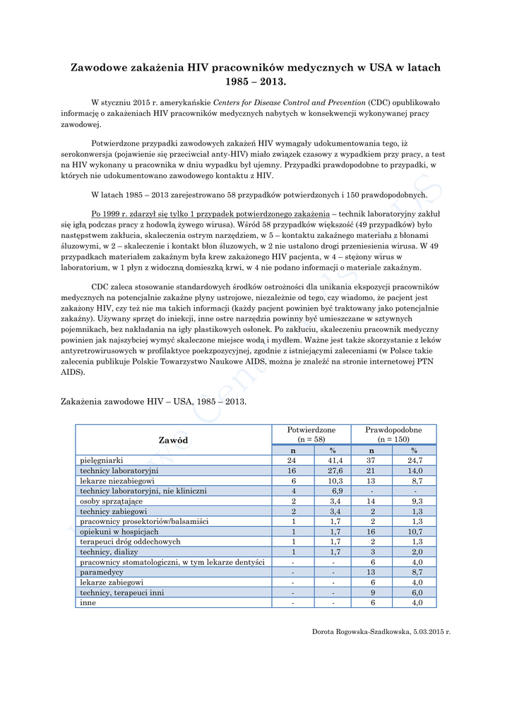Zawodowe zakażenia HIV pracowników medycznych w USA w latach 1985 – 2013. W styczniu 2015 r. amerykańskie Centers for Disease Control and Prevention (CDC) opublikowało informację o zakażeniach HIV pracowników medycznych nabytych w konsekwencji wykonywanej pracy zawodowej. Potwierdzone przypadki zawodowych zakażeń HIV wymagały udokumentowania tego, iż serokonwersja (pojawienie się przeciwciał anty-HIV) miało związek czasowy z wypadkiem przy pracy, a test na HIV wykonany u pracownika w dniu wypadku był ujemny. Przypadki prawdopodobne to przypadki, w których nie udokumentowano zawodowego kontaktu z HIV. W latach 1985 – 2013 zarejestrowano 58 przypadków potwierdzonych i 150 prawdopodobnych. Po 1999 r. zdarzył się tylko 1 przypadek potwierdzonego zakażenia – technik laboratoryjny zakłuł się igłą podczas pracy z hodowlą żywego wirusa). Wśród 58 przypadków większość (49 przypadków) było następstwem zakłucia, skaleczenia ostrym narzędziem, w 5 – kontaktu zakaźnego materiału z błonami śluzowymi, w 2 – skaleczenie i kontakt błon śluzowych, w 2 nie ustalono drogi przeniesienia wirusa. W 49 przypadkach materiałem zakaźnym była krew zakażonego HIV pacjenta, w 4 – stężony wirus w laboratorium, w 1 płyn z widoczną domieszką krwi, w 4 nie podano informacji o materiale zakaźnym. CDC zaleca stosowanie standardowych środków ostrożności dla unikania ekspozycji pracowników medycznych na potencjalnie zakaźne płyny ustrojowe, niezależnie od tego, czy wiadomo, że pacjent jest zakażony HIV, czy też nie ma takich informacji (każdy pacjent powinien być traktowany jako potencjalnie zakaźny). Używany sprzęt do iniekcji, inne ostre narzędzia powinny być umieszczane w sztywnych pojemnikach, bez nakładania na igły plastikowych osłonek. Po zakłuciu, skaleczeniu pracownik medyczny powinien jak najszybciej wymyć skaleczone miejsce wodą i mydłem. Ważne jest także skorzystanie z leków antyretrowirusowych w profilaktyce poekzpozycyjnej, zgodnie z istniejącymi zaleceniami (w Polsce takie zalecenia publikuje Polskie Towarzystwo Naukowe AIDS, można je znaleźć na stronie internetowej PTN AIDS). Zakażenia zawodowe HIV – USA, 1985 – 2013. Zawód pielęgniarki technicy laboratoryjni lekarze niezabiegowi technicy laboratoryjni, nie kliniczni osoby sprzątające technicy zabiegowi pracownicy prosektoriów/balsamiści opiekuni w hospicjach terapeuci dróg oddechowych technicy, dializy pracownicy stomatologiczni, w tym lekarze dentyści paramedycy lekarze zabiegowi technicy, terapeuci inni inne Potwierdzone (n = 58) n % 24 41,4 16 27,6 6 10,3 4 6,9 2 3,4 2 3,4 1 1,7 1 1,7 1 1,7 1 1,7 - Prawdopodobne (n = 150) n % 37 24,7 21 14,0 13 8,7 14 9,3 2 1,3 2 1,3 16 10,7 2 1,3 3 2,0 6 4,0 13 8,7 6 4,0 9 6,0 6 4,0 Dorota Rogowska-Szadkowska, 5.03.2015 r.