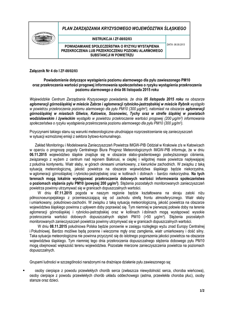 PLAN ZARZĄDZANIA KRYZYSOWEGO WOJEWÓDZTWA ŚLĄSKIEGO INSTRUKCJA I ZF-08/02/03 POWIADAMIANIE SPOŁECZEŃSTWA O RYZYKU WYSTĄPIENIA PRZEKROCZENIA LUB PRZEKROCZENIU POZIOMU ALARMOWEGO SUBSTANCJI W POWIETRZU DATA: 06.09.2013 Załącznik Nr 4 do I ZF-08/02/03 Powiadomienie dotyczące wystąpienia poziomu alarmowego dla pyłu zawieszonego PM10 oraz przekroczenia wartości progowej informowania społeczeństwa o ryzyku wystąpienia przekroczenia poziomu alarmowego z dnia 06 listopada 2015 roku Wojewódzkie Centrum Zarządzania Kryzysowego powiadamia, że dnia 05 listopada 2015 roku na obszarze aglomeracji górnośląskiej w mieście Zabrze i aglomeracji rybnicko-jastrzębskiej w mieście Rybnik wystąpiło w powietrzu przekroczenia poziomu alarmowego dla pyłu PM10 (300 µg/m3), natomiast na obszarze aglomeracji górnośląskiej w miastach Gliwice, Katowice, Sosnowiec, Tychy oraz w strefie śląskiej w powiatach wodzisławskim i żywieckim wystąpiło w powietrzu przekroczenie wartości progowej (200 µg/m3) informowania społeczeństwa o ryzyku wystąpienia przekroczenia poziomu alarmowego dla pyłu PM10 (300 µg/m3). Przyczynami takiego stanu są warunki meteorologiczne utrudniające rozprzestrzenianie się zanieczyszczeń w sytuacji wzmożonej emisji z sektora bytowo-komunalnego. Zakład Monitoringu i Modelowania Zanieczyszczeń Powietrza IMGW-PIB Oddział w Krakowie z/s w Katowicach w oparciu o prognozę pogody Centralnego Biura Prognoz Meteorologicznych IMGW-PIB informuje, że w dniu 06.11.2015 województwo śląskie znajduje się w obszarze słabo-gradientowego podwyższonego ciśnienia, związanego z wyżem z centrum nad rejonem Białorusi, w ciepłej i wilgotnej masie powietrza napływającej z południa kontynentu. Wiatr słaby, w górach okresami umiarkowany, z kierunków zachodnich. W związku z taką sytuacją meteorologiczną, jakość powietrza na obszarze województwa śląskiego będzie niekorzystna, w aglomeracji górnośląskiej i rybnicko-jastrzębskiej oraz w kotlinach i dolinach - bardzo niekorzystna. Na tych terenach mogą lokalnie występować przekroczenia dobowych wartości informowania społeczeństwa o poziomach stężenia pyłu PM10 (powyżej 200 µg/m3). Stężenia pozostałych monitorowanych zanieczyszczeń powietrza powinny utrzymywać się w granicach dopuszczalnych wartości. W dniu 07.11.2015 pogoda w naszym regionie będzie kształtowana na skraju zatoki niżu północnoeuropejskiego z przemieszczającą się od zachodu strefą frontu atmosferycznego. Wiatr słaby i umiarkowany, południowo-zachodni. W związku z taką sytuacją meteorologiczną, jakość powietrza na obszarze województwa śląskiego powinna z upływem doby poprawiać się. Tym niemniej w pierwszej połowie doby na terenie aglomeracji górnośląskiej i rybnicko-jastrzębskiej oraz w kotlinach i dolinach mogą występować wysokie przekroczenia wartości dobowych dopuszczalnych stężeń PM10 (>50 µg/m3). Stężenia pozostałych monitorowanych zanieczyszczeń powietrza powinny utrzymywać się w granicach dopuszczalnych wartości. W dniu 08.11.2015 południowa Polska będzie ponownie w zasięgu rozległego wyżu znad Europy Centralnej i Południowej. Bardzo możliwe będą poranne i wieczorne mgły oraz zamglenia, wiatr umiarkowany i dość silny. Taka sytuacja meteorologiczna nie powinna przyczynić się do istotnego pogorszenia jakości powietrza na obszarze województwa śląskiego. Tym niemniej tego dnia przekroczenia dopuszczalnego stężenia dobowego pyłu PM10 mogą obejmować większość terenu województwa. Pozostałe mierzone zanieczyszczenia powietrza na poziomach dopuszczalnych. Grupami ludności w szczególności narażonymi na drażniące działanie pyłu zawieszonego są: osoby cierpiące z powodu przewlekłych chorób serca (zwłaszcza niewydolność serca, choroba wieńcowa), osoby cierpiące z powodu przewlekłych chorób układu oddechowego (astma, przewlekła choroba płuc), osoby starsze oraz dzieci. 1/2 PLAN ZARZĄDZANIA KRYZYSOWEGO WOJEWÓDZTWA ŚLĄSKIEGO INSTRUKCJA I ZF-08/02/03 POWIADAMIANIE SPOŁECZEŃSTWA O WYSTĄPIENIU RYZYKA PRZEKROCZENIA LUB PRZEKROCZENIU POZIOMU ALARMOWEGO SUBSTANCJI W POWIETRZU DATA: 06.09.2013 Osoby cierpiące z powodu chorób serca mogą odczuwać pogorszenie samopoczucia: uczucie bólu w klatce piersiowej, palpitacje serca, brak tchu, znużenie. Osoby cierpiące z powodu przewlekłych chorób układu oddechowego mogą odczuwać przejściowe nasilenie dolegliwości, w tym kaszel, flegma, dyskomfort w klatce piersiowej, świszczący, spłycony oddech. Podobne objawy mogą wystąpić również u osób zdrowych. W przypadku nasilenia objawów chorobowych wskazany jest kontakt z lekarzem. W okresach wysokich stężeń pyłu zawieszonego w powietrzu występuje zwiększone ryzyko infekcji oddechowej. Środki ostrożności, które powinny być podjęte to: w przypadku poziomu 200 – 300 µg/m3 stężenia dobowego PM10 unikanie przebywania na otwartej przestrzeni przez najbardziej narażone grupy ludności, a pozostałe osoby powinny unikać długotrwałego przebywania na otwartej przestrzeni, w szczególności połączonego ze znacznym wysiłkiem fizycznym. w przypadku przekroczenia poziomu 300 µg/m3 stężenia dobowego PM10 najbardziej narażone grupy osób powinny pozostać w pomieszczeniach i nie przemęczać się, pozostałe osoby powinny unikać przebywania na otwartej przestrzeni. Wojewoda Śląski zwraca się z apelem do mieszkańców tych rejonów województwa o ograniczenie na czas przekroczeń poziomu alarmowego: spalania paliw złej jakości takich jak muły i miały węglowe oraz w miarę możliwości korzystanie w tym czasie z grzejników elektrycznych lub palenisk niskoemisyjnych na gaz lub olej opałowy (jeśli w gospodarstwie domowym występują alternatywne źródła ciepła), palenia w kominkach, jeżeli nie stanowią one jedynego źródła ogrzewania mieszkań, wychodzenia z domów, szczególnie przez osoby wrażliwe na zan