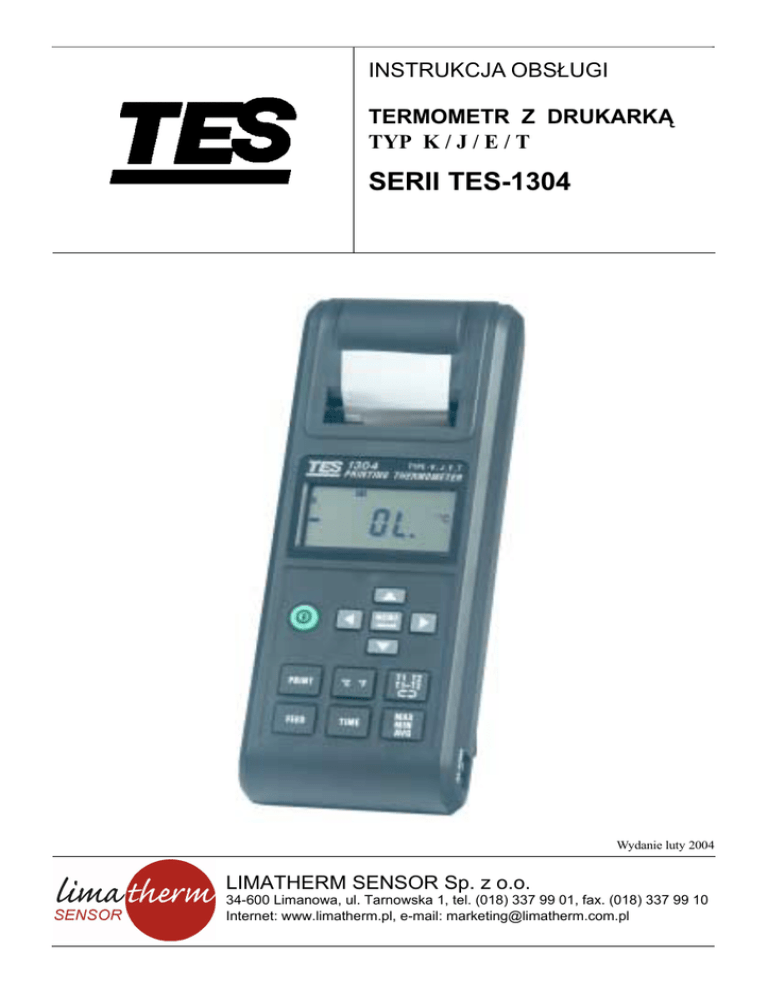 INTROL Sp. z o.o., ul. Kociuszki 112, 40-519 Katowice, tel. 032/ 78 90 150, fax 032/ 205 33 77, e-mail: [email protected], www.introl.pl INSTRUKCJA OBS£UGI TERMOMETR Z DRUKARK¥ TYP K / J / E / T SERII TES-1304 Wydanie luty 2004 LIMATHERM SENSOR Sp. z o.o. 34-600 Limanowa, ul. Tarnowska 1, tel. (018) 337 99 01, fax. (018) 337 99 10 Internet: www.limatherm.pl, e-mail: [email protected] 1 LIMATHERM SENSOR Sp. z o.o. 34-600 Limanowa ul. Tarnowska 1, tel. (18) 337 60 59, 337 60 96, fax (18) 337 64 34 Spis treci I. INFORMACJA O BEZPIECZEÑSTWIE ................................................................................. 3 Warunki otoczenia. ......................................................................................................................... 3 Konserwacja i czyszczenie. ........................................................................................................... 3 Wymogi bezpieczeñstwa. ............................................................................................................... 3 2. DANE TECHNICZNE ................................................................................................................. 3 2.1. Informacje ogólne ................................................................................................................... 3 2.2 Dane elektryczne. ..................................................................................................................... 4 3. OPIS PANELU CZO£OWEGO ................................................................................................. 5 Opis przewodu MINI DIN. ............................................................................................................ 6 4. RODKI OSTRO¯NOCI, PRZYGOTOWANIE DO POMIARÓW ................................... 8 5. SPOSÓB OBS£UGI ..................................................................................................................... 8 Szczegó³owa kolejnoæ pokazywanych parametrów jest nastêpuj¹ca. .......................................... 8 6. NASTAWIANIE ODSTÊPU DRUKOWANIA ........................................................................ 11 7. WYMIANA BATERII ................................................................................................................ 12 8. AKCESORIA OPCJONALNE ................................................................................................. 12 2 LIMATHERM SENSOR Sp. z o.o. 34-600 Limanowa ul. Tarnowska 1, tel. (18) 337 60 59, 337 60 96, fax (18) 337 64 34 1. INFORMACJA O BEZPIECZEÑSTWIE n n n Przed uruchomieniem i obs³ug¹ miernika nale¿y przeczytaæ poni¿sze informacje. Korzystaæ z miernika tylko w sposób opisany w instrukcji obs³ugi, w przeciwnym razie nie zapewnia siê bezpiecznych warunków pracy. Szczególn¹ ostro¿noæ zaleca siê przy pracy z napiêciami powy¿ej 60V DC lub 30V wartoci skutecznej AC. Takie napiêcia stwarzaj¹ ryzyko pora¿enia. Warunki otoczenia. n n n Wysokoæ do 2000 m. Wilgotnoæ wzglêdna, maksymalnie 90%. Temperatura pracy 0 ÷ 50°C. Konserwacja i czyszczenie. n n Naprawy i obs³ugê nie przedstawione w niniejszej instrukcji mo¿e przeprowadzaæ tylko wykwalifikowany personel. Okresowo przetrzeæ obudowê such¹ ciereczk¹. Nie stosowaæ do tego celu rodków ciernych, ani rozpuszczalników. Wymogi bezpieczeñstwa. Miernik jest ca³kowicie chroniony przez podwójn¹ izolacjê lub izolacjê wzmocnion¹. Przy naprawach u¿ywaæ tylko wyspecyfikowanych czêci zamiennych. Miernik jest oznaczony znakiem CE- oznacza to, ¿e spe³nia wymagania dotycz¹ce kompatybilnoci elektromagnetycznej [EMC]. 2. DANE TECHNICZNE 2.1. Informacje ogólne Wywietlacz: 4 1/2, ciek³okrystaliczny (LCD). Sygnalizator LCD: T 1 -T 2 T2 T1 Rys. 1. T1-T2, T2, T1 MAX, MIN, AVG KJET HI ALARM LO ALARM BT Wskazanie, który kana³ dzia³a. Odczyt zmierzonej wartoci maksymalnej, minimalnej lub redniej. Termoelement typu K, J, E, T. Przekroczenie temperatury maksymalnej zakresu. Poni¿ej/równo z temperatur¹ minimaln¹ zakresu. Symbol zbyt niskiego napiêcia baterii. Ujemna biegunowoæ; (bez sygnalizacji dla biegunowoci dodatniej). 0C, 0F Jednostki Celsjusza lub Fahrenheita. 3 LIMATHERM SENSOR Sp. z o.o. 34-600 Limanowa ul. Tarnowska 1, tel. (18) 337 60 59, 337 60 96, fax (18) 337 64 34 Symbol dzia³ania drukarki. , TIME INTV h:m m:s m-d YY Odstêp drukowania - symbol pocz¹tku / symbol zatrzymania. Czas kalendarzowy Symbol odstêpu drukowania. Symbol godzina : minuta Symbol minuty : sekundy Symbol miesi¹c-dzieñ kalendarza Symbol rok kalendarza Siedem segmentów dla cyfry dziesiêtnej Sygnalizacja przekroczenia zakresu na wywietlaczu pojawia siê lub BT pojawia siê, gdy napiêcie baterii spada poni¿ej napiêcia pracy. oko³o 1 raz na sekundê. 6 szt. baterii alkalicznych 1,5V typu AAA lub zasilacz 9V DC minimum 500 mA. ¯ywotnoæ baterii (typowa) oko³o 30 godzin (interwa³ drukowania = 60 min., bez sygnalizacji dwiêkowej). 70 godzin (bez drukowania i sygnalizacji dwiêkowej). Ochrona wejcia 60V DC / 24V wartoci skutecznej AC. Temp. i wilgotnoæ pracy 0 ÷ 50°C, poni¿ej 90% wilgotnoci wzglêdnej. Temp. i wilgotnoæ przechowywania 10 ÷ 60°C, poni¿ej 70% wilgotnoci wzglêdnej. Wymiar (d³.×szerokoæ×wysokoæ) 193×74×37 mm. Ciê¿ar oko³o 365 g wraz z bateriami i papierem termicznym. Akcesoria Futera³ do przenoszenia, instrukcja obs³ugi, baterie, 1 rolka papieru termicznego, przewód alarmu (OVER/UNDER) MINI DIN, sonda typu K. Drukarka termiczna, o 16 znakach na liniê, u¿ywaj¹ca papieru termicznego o szerokoci 38mm. Sta³e drukowanie naciskaæ polecenie drukowania w czasie druku dwu kolejnych linii. Przedzia³ czasowy drukowania w zakresie od 00:00:03 do 23:59:59, zgodnie z zadanym odstêpem drukowania. Ci¹g³e drukowanie mo¿na uruchomiæ na dwa sposoby, a zatrzymaæ trzema sposobami. Sygnalizacja s³abej baterii Czêstoæ próbkowania Wymagane zasilanie 2.2. Dane elektryczne. Kalibracja dla 23°C ±5°C i poni¿ej 
