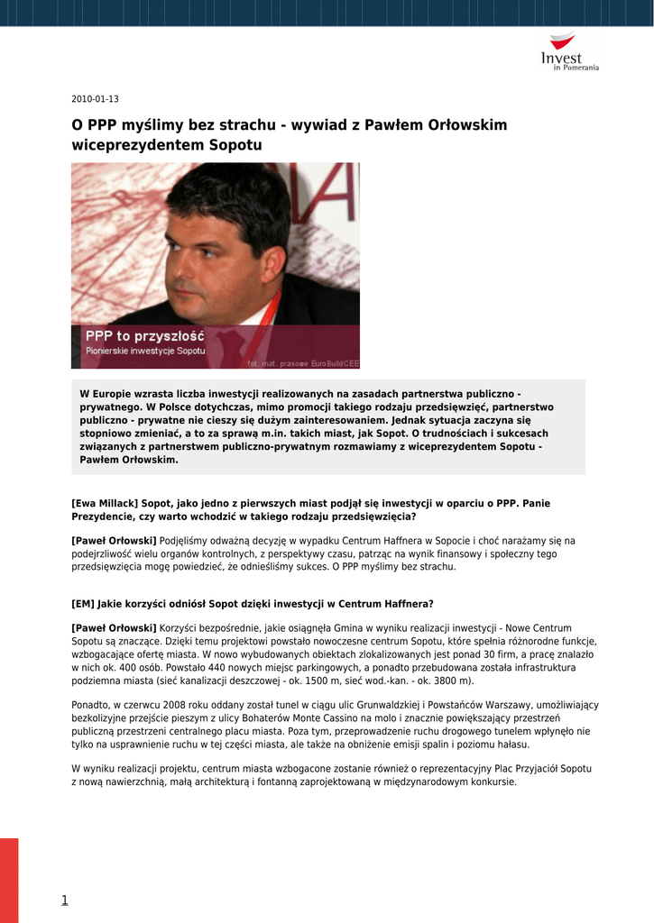 2010-01-13 O PPP myślimy bez strachu - wywiad z Pawłem Orłowskim wiceprezydentem Sopotu W Europie wzrasta liczba inwestycji realizowanych na zasadach partnerstwa publiczno prywatnego. W Polsce dotychczas, mimo promocji takiego rodzaju przedsięwzięć, partnerstwo publiczno - prywatne nie cieszy się dużym zainteresowaniem. Jednak sytuacja zaczyna się stopniowo zmieniać, a to za sprawą m.in. takich miast, jak Sopot. O trudnościach i sukcesach związanych z partnerstwem publiczno-prywatnym rozmawiamy z wiceprezydentem Sopotu Pawłem Orłowskim. [Ewa Millack] Sopot, jako jedno z pierwszych miast podjął się inwestycji w oparciu o PPP. Panie Prezydencie, czy warto wchodzić w takiego rodzaju przedsięwzięcia? [Paweł Orłowski] Podjęliśmy odważną decyzję w wypadku Centrum Haffnera w Sopocie i choć narażamy się na podejrzliwość wielu organów kontrolnych, z perspektywy czasu, patrząc na wynik finansowy i społeczny tego przedsięwzięcia mogę powiedzieć, że odnieśliśmy sukces. O PPP myślimy bez strachu. [EM] Jakie korzyści odniósł Sopot dzięki inwestycji w Centrum Haffnera? [Paweł Orłowski] Korzyści bezpośrednie, jakie osiągnęła Gmina w wyniku realizacji inwestycji - Nowe Centrum Sopotu są znaczące. Dzięki temu projektowi powstało nowoczesne centrum Sopotu, które spełnia różnorodne funkcje, wzbogacające ofertę miasta. W nowo wybudowanych obiektach zlokalizowanych jest ponad 30 firm, a pracę znalazło w nich ok. 400 osób. Powstało 440 nowych miejsc parkingowych, a ponadto przebudowana została infrastruktura podziemna miasta (sieć kanalizacji deszczowej - ok. 1500 m, sieć wod.-kan. - ok. 3800 m). Ponadto, w czerwcu 2008 roku oddany został tunel w ciągu ulic Grunwaldzkiej i Powstańców Warszawy, umożliwiający bezkolizyjne przejście pieszym z ulicy Bohaterów Monte Cassino na molo i znacznie powiększający przestrzeń publiczną przestrzeni centralnego placu miasta. Poza tym, przeprowadzenie ruchu drogowego tunelem wpłynęło nie tylko na usprawnienie ruchu w tej części miasta, ale także na obniżenie emisji spalin i poziomu hałasu. W wyniku realizacji projektu, centrum miasta wzbogacone zostanie również o reprezentacyjny Plac Przyjaciół Sopotu z nową nawierzchnią, małą architekturą i fontanną zaprojektowaną w międzynarodowym konkursie. 1 Należy wziąć pod uwagę również długofalowe skutki realizacji inwestycji dla miasta Sopotu. Projekt wygeneruje przede wszystkim znaczne korzyści finansowe dla budżetu miasta. Na te wartości składają się kwoty z tyt. podatku od nieruchomości, z podatku PIT oraz CIT, dzierżawy oraz opłaty za użytkowanie. Warto dodać, że w czasie realizacji Centrum Haffnera zdobyliśmy kolejne doświadczenia, które z pewnością wykorzystamy przy kolejnych takiego rodzaju inwestycjach. [EM] Czy inwestycje realizowane w formule PPP wiążą się z dużym ryzykiem? [Paweł Orłowski] Partnerstwo publiczno-prywatne powszechnie uważane jest za trudną formę realizacji inwestycji, i przez wiele z instytucji uznawana jest także za ryzykowną. Z jednej strony, przepisy nowej ustawy o PPP, które jeszcze nie do końca funkcjonują w praktyce, z drugiej zaś partner prywatny i pokutujące wciąż w Polsce przeświadczenie, że jak ""prywatny"" to z pewnością ktoś nieuczciwy. [EM] Czy Sopot mógłby samodzielnie bez inwestora prywatnego przeprowadzić tak dużą inwestycję jak np. budowa Centrum Haffnera? [Paweł Orłowski] W wielu wypadkach, jeśli weźmiemy pod uwagę limity możliwego zadłużenia budżetu miasta, to bez udziału partnera prywatnego realizacja określonych przedsięwzięć w ogóle nie byłaby możliwa. Dlatego przyszłość to PPP. Dobrym rozwiązaniem jest także współpraca z partnerem prywatnym przy wykorzystaniu koncesji. [EM] Czy władze Sopotu planują kolejne inwestycje na zasadzie partnerstwa publiczno-prywatnego? [Paweł Orłowski] Nowe Centrum Sopotu - Centrum Haffnera to nie ostatnia wielka inwestycja w Sopocie przeznaczona do realizacji z prywatnym podmiotem. Mam nadzieję, że jeszcze w tym roku, wraz z PKP przystąpimy do rewitalizacji dworca i terenów przydworcowych. Analizujemy także potencjalne modele współpracy ze Społem, do którego należy budynek Algi. Między innymi w oparciu o PPP chciałbym także przygotować kolejne etapy budownictwa komunalnego. [EM] W III Edycji Konkursu DOBRE PRAKTYKI PPP w 2009 roku Gmina Miasta Sopotu została laureatem w kategorii infrastruktura komunalna za projekt ""Rewitalizacja terenów przydworcowych w Sopocie wraz z równoczesnym rozwiązaniem problemów komunikacyjnych na tym obszarze"". Jakie są założenia tego projektu i w jakiej fazie realizacji obecnie znajduje się? [Paweł Orłowski] Przebudowa dworca i rewitalizacja terenów wokół niego to dużo bardziej skomplikowany projekt niż Centrum Haffnera. Dlatego też wspólnie z PKP podjęliśmy decyzję o zaangażowaniu doradców: ekonomicznego i prawnego. Razem z nimi przygotowujemy najlepszą, najbardziej opłacalną i efektywną formułę tego przedsięwzięcia. Jedno jest pewne - tej inwestycji nie da się zrealizować bez udziału partnera prywatnego. W I kwartale 2010 r. ma rozpocząć się konkurs na wyłonienie inwestora, który wraz z miastem i koleją zmieni oblicze dzisiejszego dworca PKP i jego najbliższej okolicy. Budowa ma kosztować około 200 mln zł. Stworzona koncepcja rewitalizacji terenów przydworcowych przewiduje powstanie zespołu sześciu budynków o charakterze handlowo-usługowym, w tym hotelu. W sumie, w nowych budynkach powstałoby ok. 17 tys. m kw. powierzchni użytkowej oraz dodatkowo 5 tys. m˛ w ramach hotelu. Pod ziemią mogłyby się znaleźć parkingi na ponad 250 miejsc, co pozwoliłoby uwolnić przestrzeń przed dworcem tworząc tam plac i miejsca spacerowe. Przebudowany zostanie też układ drogowy. Ruch kołowy w bezpośrednim sąsiedztwie dworca mógłby zostać ""schowany pod ziemię"", powstać mogą także 