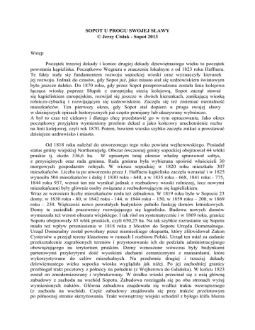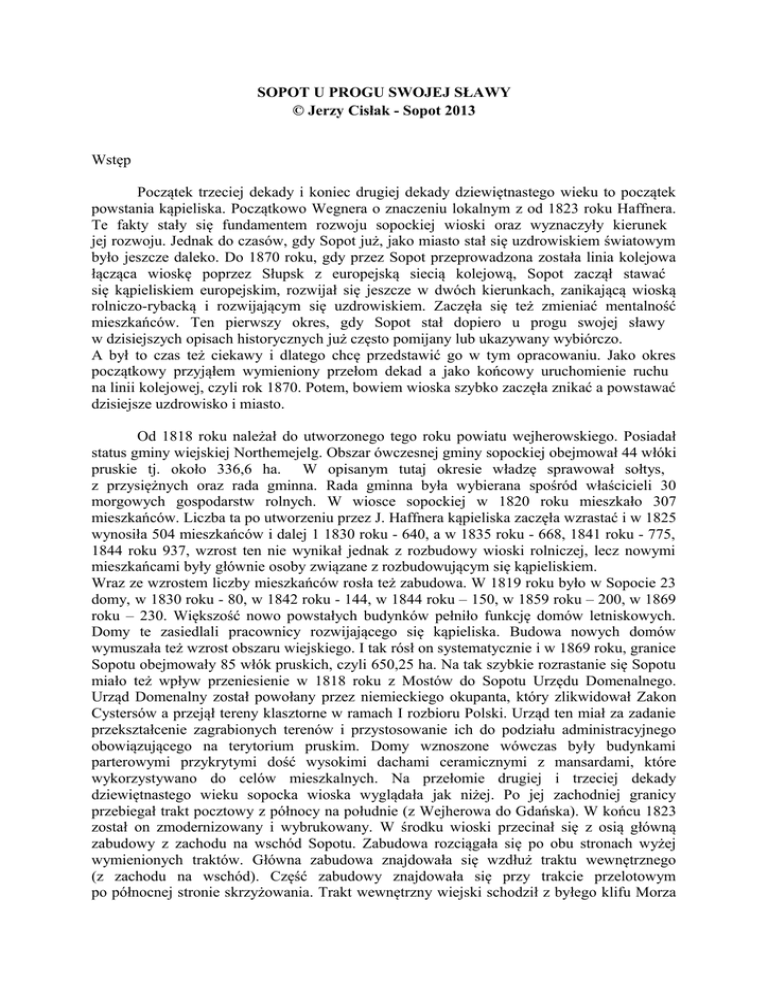 SOPOT U PROGU SWOJEJ SŁAWY © Jerzy Cisłak - Sopot 2013 Wstęp Początek trzeciej dekady i koniec drugiej dekady dziewiętnastego wieku to początek powstania kąpieliska. Początkowo Wegnera o znaczeniu lokalnym z od 1823 roku Haffnera. Te fakty stały się fundamentem rozwoju sopockiej wioski oraz wyznaczyły kierunek jej rozwoju. Jednak do czasów, gdy Sopot już, jako miasto stał się uzdrowiskiem światowym było jeszcze daleko. Do 1870 roku, gdy przez Sopot przeprowadzona została linia kolejowa łącząca wioskę poprzez Słupsk z europejską siecią kolejową, Sopot zaczął stawać się kąpieliskiem europejskim, rozwijał się jeszcze w dwóch kierunkach, zanikającą wioską rolniczo-rybacką i rozwijającym się uzdrowiskiem. Zaczęła się też zmieniać mentalność mieszkańców. Ten pierwszy okres, gdy Sopot stał dopiero u progu swojej sławy w dzisiejszych opisach historycznych już często pomijany lub ukazywany wybiórczo. A był to czas też ciekawy i dlatego chcę przedstawić go w tym opracowaniu. Jako okres początkowy przyjąłem wymieniony przełom dekad a jako końcowy uruchomienie ruchu na linii kolejowej, czyli rok 1870. Potem, bowiem wioska szybko zaczęła znikać a powstawać dzisiejsze uzdrowisko i miasto. Od 1818 roku należał do utworzonego tego roku powiatu wejherowskiego. Posiadał status gminy wiejskiej Northemejelg. Obszar ówczesnej gminy sopockiej obejmował 44 włóki pruskie tj. około 336,6 ha. W opisanym tutaj okresie władzę sprawował sołtys, z przysiężnych oraz rada gminna. Rada gminna była wybierana spośród właścicieli 30 morgowych gospodarstw rolnych. W wiosce sopockiej w 1820 roku mieszkało 307 mieszkańców. Liczba ta po utworzeniu przez J. Haffnera kąpieliska zaczęła wzrastać i w 1825 wynosiła 504 mieszkańców i dalej 1 1830 roku - 640, a w 1835 roku - 668, 1841 roku - 775, 1844 roku 937, wzrost ten nie wynikał jednak z rozbudowy wioski rolniczej, lecz nowymi mieszkańcami były głównie osoby związane z rozbudowującym się kąpieliskiem. Wraz ze wzrostem liczby mieszkańców rosła też zabudowa. W 1819 roku było w Sopocie 23 domy, w 1830 roku - 80, w 1842 roku - 144, w 1844 roku – 150, w 1859 roku – 200, w 1869 roku – 230. Większość nowo powstałych budynków pełniło funkcję domów letniskowych. Domy te zasiedlali pracownicy rozwijającego się kąpieliska. Budowa nowych domów wymuszała też wzrost obszaru wiejskiego. I tak rósł on systematycznie i w 1869 roku, granice Sopotu obejmowały 85 włók pruskich, czyli 650,25 ha. Na tak szybkie rozrastanie się Sopotu miało też wpływ przeniesienie w 1818 roku z Mostów do Sopotu Urzędu Domenalnego. Urząd Domenalny został powołany przez niemieckiego okupanta, który zlikwidował Zakon Cystersów a przejął tereny klasztorne w ramach I rozbioru Polski. Urząd ten miał za zadanie przekształcenie zagrabionych terenów i przystosowanie ich do podziału administracyjnego obowiązującego na terytorium pruskim. Domy wznoszone wówczas były budynkami parterowymi przykrytymi dość wysokimi dachami ceramicznymi z mansardami, które wykorzystywano do celów mieszkalnych. Na przełomie drugiej i trzeciej dekady dziewiętnastego wieku sopocka wioska wyglądała jak niżej. Po jej zachodniej granicy przebiegał trakt pocztowy z północy na południe (z Wejherowa do Gdańska). W końcu 1823 został on zmodernizowany i wybrukowany. W środku wioski przecinał się z osią główną zabudowy z zachodu na wschód Sopotu. Zabudowa rozciągała się po obu stronach wyżej wymienionych traktów. Główna zabudowa znajdowała się wzdłuż traktu wewnętrznego (z zachodu na wschód). Część zabudowy znajdowała się przy trakcie przelotowym po północnej stronie skrzyżowania. Trakt wewnętrzny wiejski schodził z byłego klifu Morza Litorynowego, gdzie kończyła się zabudowa wiejska i biegł w kierunku brzegu poprzez podmokłe wtedy łąki do części uzdrowiskowej J. Haffnera. Od Skarpy biegł on w szpalerze drzew. Tak samo od dzisiejszej ulicy 23-Marca w kierunku północnym oraz od dawnej ulicy Sikorskiego, w szpalerze drzew biegł też trakt pocztowy. Po zachodniej stronie traktu pocztowego, za skrzyżowaniem po południowej stronie znajdowała się zabudowa oraz sad majątku Wegnera. Przez sad majątku przepływał Potok Środkowy. Płynął on w odkrytym korycie zasilając i pokonując na terenie majątkowego sadu siedem stawów hodowlanych, następnie przepustem kamiennym pokonywał trakt i płynąc za południową zabudową wioski wpływał do sztucznie ukształtowanej fosy tzw. Dworu Francuskiego i dalej łąkami do morza. Droga za skrzyżowaniem przechodziła dalej na zachód w kierunku lasu i prowadziła do cegielni gdzie się kończyła. Na wysokości majątku Wegnera odchodziła od niej prostopadle w kierunku północnym droga prowadząca do drogi biegnącej w Dolinie Gołębiewskiej tj. dzisiejszej ulicy 23-Marca. Wzdłuż tej drogi ulokował się Urząd Domenalny oraz areszt. Zabudowa wiejska wzdłuż traktu pocztowego zaczynała się przed drogą w Dolinie Gołębiewskiej, gdzie przy zachodnim skraju znajdowała się Wiejska Szkoła Ewangeliczna otwarta w 1817 roku, dalej po tej stronie znajdowało się kilka budynków mieszkalnych a po drugiej stronie wtedy praktycznie poza wąwozem, którym płynął potok znajdował się młyn zbożowy zwany Dolinnym, dominowała sopocka karczma. Działała ona już od XV wieku a istniejąca wtedy murowana z wozownią z XVIII wieku. Nazywana była Starą Karczmą Altercook. Po północnej stronie wioski płynął drugi potok nazwany Potokiem Wiejskim. Przed skrzyżowaniem z traktem pocztowym na nim znajdował się duży staw nazwany Wiejskim Stawem. Potok Wiejski miał na terenie wioski jeszcze dwa stawy w części przed dzisiejszą linią kolejową i drugi nieduży przed zejściem ze skarpy. Przy skrzyżowaniu traktu z drogą wiejska w południowo-zachodniej części znajdowały się dwa hotele „D