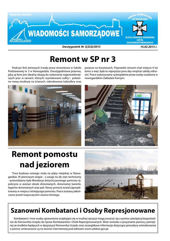 Dwutygodnik Nr 2(222)/2013 15.02.2013 r. Remont w SP nr 3 Podczas ferii zimowych trwały prace remontowe w Szkole Podstawowej nr 3 w Nowogardzie. Dwutygodniowa przerwa, jaką są ferie jest idealną okazją do wykonania najpotrzebniejszych prac w ramach, których: wymalowano sufity i położono nową strukturę na ścianach, odmalowano kaloryfery oraz poręcze na korytarzach. Poprzedni remont miał miejsce 9 lat temu a więc była to najwyższa pora aby wnętrze szkoły odnowić. Prace wykonywane są bezpłatnie przez osoby osadzone w nowogardzkim Zakładzie Karnym. Remont pomostu nad jeziorem Trwa budowa nowego mola na plaży miejskiej w Nowogardzie. W pierwszym etapie - z uwagi na zły stan techniczny - przewidziana była likwidacja dotychczasowego pomostu tj.: pokrycia w postaci desek drewnianych, drewnianej barierki, legarów drewnianych oraz pali. Nowy pomost został zaprojektowany w miejscu istniejącego pomostu. Prace zostaną zakończone przed rozpoczęciem sezonu letniego. Szanowni Kombatanci i Osoby Represjonowane Kombatanci i inne osoby uprawnione znajdujące się w trudnej sytuacji mogą zwracać się o pomoc pieniężną bezpośrednio do Kierownika Urzędu do Spraw Kombatantów i Osób Represjonowanych. Wzór wniosku o przyznanie pomocy pieniężnej ze środków będących w dyspozycji Kierownika Urzędu oraz szczegółowe informacje dotyczące procedury wnioskowania o pomoc umieszczone są na stronie internetowej pod adresem www.udskior.gov.pl. 2 WIADOMOŚCI SAMORZĄDOWE 15.02.2013 r. Będzie profesjonalne boisko na osiedlu Bema Zgodnie z zapowiedzią burmistrza, rozpoczęły się prace związane z budową boiska wielofunkcyjnego na osiedlu Bema. 28 grudnia 2012 roku głosami koalicji rządzącej SLD-PSL uchwalono budżet gminy na rok bieżący, gdzie zapisane zostały pieniądze na zaprojektowanie boiska. Na stronie internetowej gminy www.nowogard.pl pojawi- ło się już zaproszenie dla oferentów do opracowania projektu technicznego. Po sporządzeniu dokumentacji i uzyskaniu wszystkich wymaganych pozwoleń, jeżeli Rada Miejska wyrazi na to zgodę i przeznaczy na ten cel środki, rozpocznie się jego budowa. Boisko prawdopodobnie będzie zlokalizowane przy budynkach szkół. Gmina pozyskuje pieniądze na usuwanie azbestu Uprzejmie informujemy, że gmina Nowogard przystępuje po raz kolejny do realizacji zadania polegającego na usuwaniu azbestu i wyrobów zawierających azbest z budynków położonych na terenie miasta i gminy. Prace związane z usuwaniem azbestu będą obejmować koszt demontażu, transportu i utylizacji odpadów niebezpiecznych zawierających azbest. O przyznanie usługi mogą ubiegać się wszyscy mieszkańcy gminy Nowogard posiadający tytuł prawny (własność, współwłasność, itp.) do nieruchomości, a także kościoły, wspólnoty i spółdzielnie mieszkaniowe oraz jednostki sektora finansów publicznych. W latach 2011 i 2012 z dotacji skorzystało 14 właścicieli nieruchomości z terenu miasta i gminy Nowogard. Prace zostały wykonane na zlecenie gminy, a dotacja na ten cel uzyskana z Wojewódzki Fundusz Ochrony Środowiska i Gospodarki Wodnej w Szczecinie wyniosła odpowiednio w roku 2011 - 13 003,74 zł oraz w roku 2012 - 15 657,68 zł. W celu zgłoszenia budynku do demontażu wyrobów zawierających azbest należy złożyć wypełniony wniosek wraz z wymaganymi załącznikami do Urzędu Miejskiego w Nowogardzie. Wnioski dostępne są w Biurze Obsługi Interesanta, Plac Wolności 1, pok. nr 5, w wydziale Gospodarki Komunalnej, Mieszkaniowej i Ochrony Środowiska, Plac Wolności 5, pok. 208 oraz na stronie www.nowogard.pl w zakładce AZBEST 2013. Przed złożeniem wniosku należy zapoznać się z Regulaminem przyznawania usługi usuwania odpadów niebezpiecznych zawierających azbest z nieruchomości położonych na terenie miasta i gminy Nowogard. Termin naboru wniosków: 30.04.2013 r. Planowany termin realizacji zadania - do 30 września 2013 r. pod warunkiem uzyskania na ten cel dotacji ze środków Wojewódzkiego Funduszu Ochrony Środowiska i Gospodarki Wodnej w Szczecinie. Uwaga! W ramach realizowanego zadania gmina nie udziela dofinansowania na zakup nowego pokrycia dachowego. Informacji w przedmiotowej sprawie udzielają: Joanna Krępa – z-ca kierownika wydziału GKMiOŚ, tel. 91 392 6232, Aneta Włochowicz – podinspektor wydziału GKMiOŚ, tel. 91 392 6232. Joanna Krępa z-ca kierownika wydziału GKMiOŚ Urzędu Miejskiego w Nowogardzie 15.02.2013 r. WIADOMOŚCI SAMORZĄDOWE 3 Historia Nowogardu - celem projektu międzynarodowego Gmina Nowogard przygotowuje projekt, którego celem będzie historyczna wystawa o dziejach naszego miasta. Projekt koordynowany będzie wraz z Stowarzyszeniem ulicy Nowogardzkiej „Neugarder Kreis e.V.". W miniony piątek (1.02.2013) nastąpiło spotkanie wiceburmistrza Nowogardu p. Damiana Simińskiego z przewodniczącym zarządu stowarzyszenia z ulicy Nowogardzkiej p. Jürgenem Prillwitzem. Podczas spotkania omawiano kwestie związane z przygotowaniem wspólnego przedsięwzięcia. Pan Jürgen Prillwitz odczytał uroczyście list od stowarzyszenia oraz przekazał prezent w postaci pamiątkowych banknotów nowogardzkich z lat 20 minionego wieku. Oprócz tego wśród przekazanych dokumentów znalazły się historyczne znaczki, pocztówki i zdjęcia naszego miasta, a także jego okolic. Przekazane dokumenty stanowić będą część wystawy. Ponadto poruszone zostały założenia przyszłej współpracy pomiędzy stronami, w ramach której: • strony dążyć będą do dalszego zacieśnienia współpracy poprzez wspólne projekty, • organizowany będzie wyjazd nowogardzkiej kadry młodych piłkarzy na turniej - Dynamo Cup w Berlinie, strona niemiecka udzieli pomocy w promocji Gminy oraz przedsiębiorców z Nowogardu na terenie Berlina, • strony uczestniczyć będą w ważnych wydarzeniach swoich wspólnot m. in w obchodach jubileuszu założenia Neugarder Kreis e.V. Gmina Nowogard stara się o dof