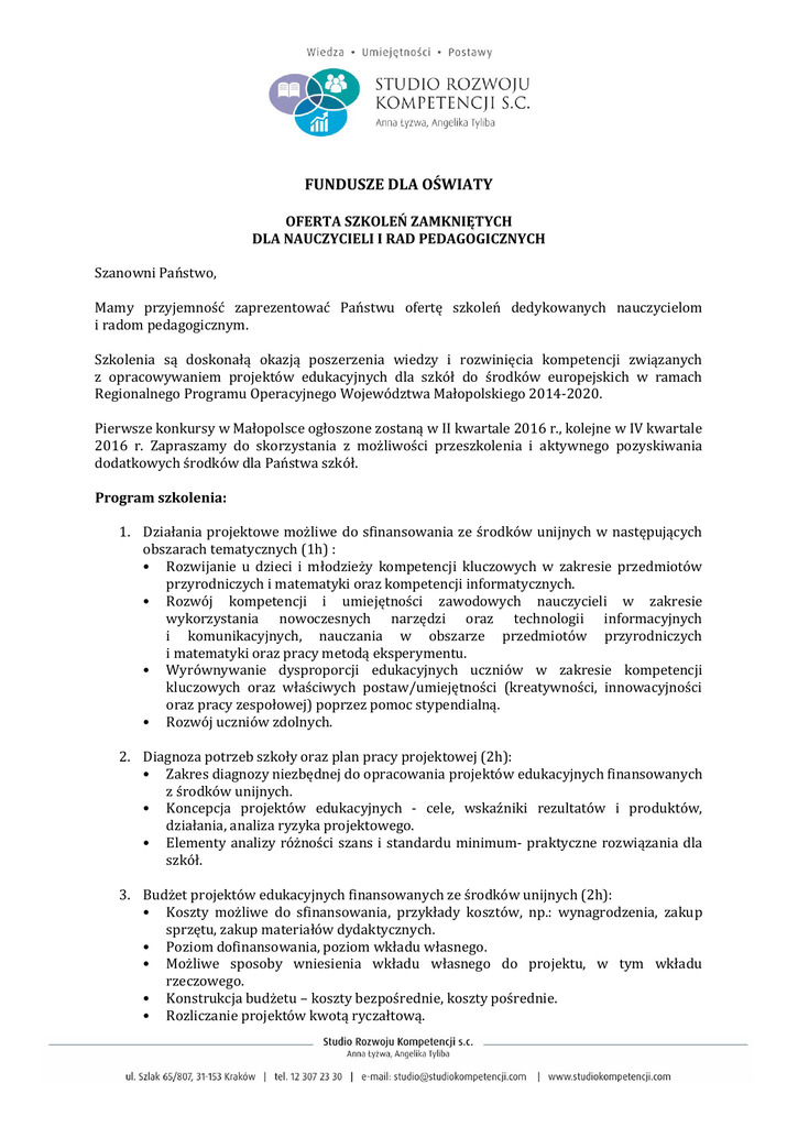 FUNDUSZE DLA OŚWIATY OFERTA SZKOLEŃ ZAMKNIĘTYCH DLA NAUCZYCIELI I RAD PEDAGOGICZNYCH Szanowni Państwo, Mamy przyjemność zaprezentować Państwu ofertę szkoleń dedykowanych nauczycielom i radom pedagogicznym. Szkolenia są doskonałą okazją poszerzenia wiedzy i rozwinięcia kompetencji związanych z opracowywaniem projektów edukacyjnych dla szkół do środków europejskich w ramach Regionalnego Programu Operacyjnego Województwa Małopolskiego 2014-2020. Pierwsze konkursy w Małopolsce ogłoszone zostaną w II kwartale 2016 r., kolejne w IV kwartale 2016 r. Zapraszamy do skorzystania z możliwości przeszkolenia i aktywnego pozyskiwania dodatkowych środków dla Państwa szkół. Program szkolenia: 1. Działania projektowe możliwe do sfinansowania ze środków unijnych w następujących obszarach tematycznych (1h) : • Rozwijanie u dzieci i młodzieży kompetencji kluczowych w zakresie przedmiotów przyrodniczych i matematyki oraz kompetencji informatycznych. • Rozwój kompetencji i umiejętności zawodowych nauczycieli w zakresie wykorzystania nowoczesnych narzędzi oraz technologii informacyjnych i komunikacyjnych, nauczania w obszarze przedmiotów przyrodniczych i matematyki oraz pracy metodą eksperymentu. • Wyrównywanie dysproporcji edukacyjnych uczniów w zakresie kompetencji kluczowych oraz właściwych postaw/umiejętności (kreatywności, innowacyjności oraz pracy zespołowej) poprzez pomoc stypendialną. • Rozwój uczniów zdolnych. 2. Diagnoza potrzeb szkoły oraz plan pracy projektowej (2h): • Zakres diagnozy niezbędnej do opracowania projektów edukacyjnych finansowanych z środków unijnych. • Koncepcja projektów edukacyjnych - cele, wskaźniki rezultatów i produktów, działania, analiza ryzyka projektowego. • Elementy analizy różności szans i standardu minimum- praktyczne rozwiązania dla szkół. 3. Budżet projektów edukacyjnych finansowanych ze środków unijnych (2h): • Koszty możliwe do sfinansowania, przykłady kosztów, np.: wynagrodzenia, zakup sprzętu, zakup materiałów dydaktycznych. • Poziom dofinansowania, poziom wkładu własnego. • Możliwe sposoby wniesienia wkładu własnego do projektu, w tym wkładu rzeczowego. • Konstrukcja budżetu – koszty bezpośrednie, koszty pośrednie. • Rozliczanie projektów kwotą ryczałtową. 4. Procedury konkursowe pozyskania dotacji na projekty edukacyjne dla szkół (1h): • Obsługa elektroniczna wniosków aplikacyjnych. • Kryteria oceny, terminy oceny. Wymiar czasowy szkolenia: w godzinach 10.00-15.00 w wybranym przez Państwa terminie. Możliwość dostosowania godzinowego do potrzeb pracy szkoły. Prowadząca: Magdalena Szczudło – niezależna specjalistka i certyfikowana trenerka (Certyfikat MATRIKAkademia dydaktyki, Certyfikat MRR-trener kluczowy ROEFS, Certyfikat ERAC-European Regional Affairs Consultants) z zakresu funduszy europejskich, budowania projektów, zarządzania projektami. Zrealizowała około 4000 godzin szkoleniowych w latach 2007-2014, prowadziła szkolenia i wykłady z zakresu zarządzania projektami dofinansowanymi z funduszy europejskich m. in dla: MARR S.A, Europoint, Uniwersytet Jagielloński, Uniwersytet JP II w Krakowie, Akademia Górniczo-Hutnicza w Krakowie, Wyższa Szkoła Europejska im. J. Tischnera, WSB-NLU Nowy Sącz, MISTiA, Fundacja Hetmana Tarnowskiego w Tarnowie, Związek Centralny Dzieła Kolpinga, Kolping Society w Ugandzie, Tanzanii, Ruandzie (dot. Europejskiego Funduszu Rozwoju dla krajów Afryki), wielu jednostek samorządu terytorialnego, m.in. Gmina Poronin, Gmina Brzeszcze, Gmina Koniusza, Urząd Marszałkowski w Białymstoku. Odbyła 6-miesięczny staż w Parlamencie Europejskim w Brukseli w 2007 r. (Komisji Spraw Zagranicznych PE oraz Komisji Sprawy Gospodarcze i Monetarne). Koordynatorka projektów finansowanych z funduszy europejskich w latach 2004-2006. Autorka i współautorka projektów społecznych w ramach programów finansowanych m.in. z EFS 2004-2006, 2007-2013 takich jak: SPO RZL, POKL. Koszt szkolenia wynosi 3600 zł + VAT (23% lub zw.) dla grupy liczącej nie więcej niż 20 osób (cena za grupę). W przypadku większej ilości osób cena za grupę ustalana jest indywidualnie uwzględniając rabaty. Możliwość negocjacji cenowych! W ramach zamówionego szkolenia oferujemy: Szkolenie prowadzone przez wysokiej klasy eksperta Materiały szkoleniowe dla każdego uczestnika Zaświadczenie potwierdzające udział w szkoleniu Raport poszkoleniowy podsumowujący szkolenie, zawierający wyniki ewaluacji. Korzyści ze szkoleń zamkniętych: Wybór terminu oraz lokalizacji szkolenia Wybór formy szkolenia najbardziej odpowiadającej potrzebom Możliwość negocjowania dogodnych warunków finansowych Rabaty – przy większej ilości szkoleń. Wszystkie kwestie związane z przeprowadzeniem wybranego szkolenia (czas, miejsce, cena itp.) ustalane są indywidualnie, dlatego też serdecznie zapraszam do kontaktu.