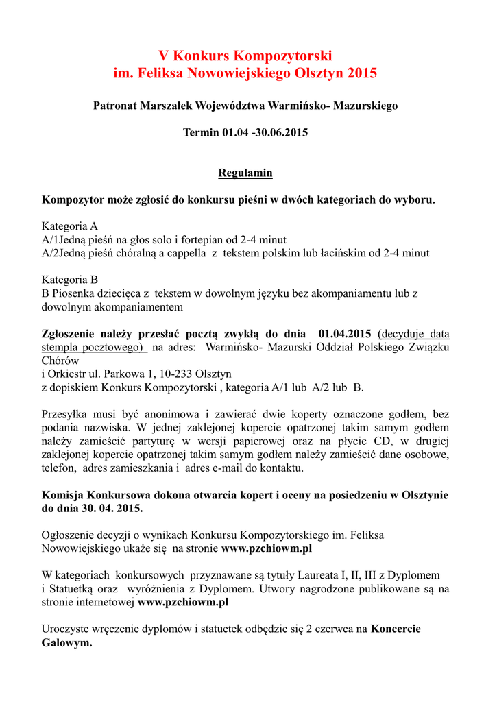 V Konkurs Kompozytorski im. Feliksa Nowowiejskiego Olsztyn 2015 Patronat Marszałek Województwa Warmińsko- Mazurskiego Termin 01.04 -30.06.2015 Regulamin Kompozytor może zgłosić do konkursu pieśni w dwóch kategoriach do wyboru. Kategoria A A/1Jedną pieśń na głos solo i fortepian od 2-4 minut A/2Jedną pieśń chóralną a cappella z tekstem polskim lub łacińskim od 2-4 minut Kategoria B B Piosenka dziecięca z tekstem w dowolnym języku bez akompaniamentu lub z dowolnym akompaniamentem Zgłoszenie należy przesłać pocztą zwykłą do dnia 01.04.2015 (decyduje data stempla pocztowego) na adres: Warmińsko- Mazurski Oddział Polskiego Związku Chórów i Orkiestr ul. Parkowa 1, 10-233 Olsztyn z dopiskiem Konkurs Kompozytorski , kategoria A/1 lub A/2 lub B. Przesyłka musi być anonimowa i zawierać dwie koperty oznaczone godłem, bez podania nazwiska. W jednej zaklejonej kopercie opatrzonej takim samym godłem należy zamieścić partyturę w wersji papierowej oraz na płycie CD, w drugiej zaklejonej kopercie opatrzonej takim samym godłem należy zamieścić dane osobowe, telefon, adres zamieszkania i adres e-mail do kontaktu. Komisja Konkursowa dokona otwarcia kopert i oceny na posiedzeniu w Olsztynie do dnia 30. 04. 2015. Ogłoszenie decyzji o wynikach Konkursu Kompozytorskiego im. Feliksa Nowowiejskiego ukaże się na stronie www.pzchiowm.pl W kategoriach konkursowych przyznawane są tytuły Laureata I, II, III z Dyplomem i Statuetką oraz wyróżnienia z Dyplomem. Utwory nagrodzone publikowane są na stronie internetowej www.pzchiowm.pl Uroczyste wręczenie dyplomów i statuetek odbędzie się 2 czerwca na Koncercie Galowym.