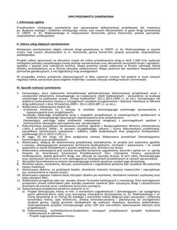 OPIS PRZEDMIOTU ZAMÓWIENIA I. Informacje ogólne Przedmiotem niniejszego zamówienia jest opracowanie dokumentacji projektowej dla inwestycji pn. Budowa nowego i rozbiórka istniejącego mostu nad rowem Głuchowskim w pasie drogi powiatowej nr 2387P, ul. Ks. Malinowskiego w miejscowości Komorniki, gmina Komorniki, powiat poznański, województwo wielkopolskie. II. Zakres usług objętych zamówieniem Niniejszym zamówieniem objęto odcinek drogi powiatowej nr 2387P, ul. Ks. Malinowskiego w rejonie mostu nad rowem Głuchowskim w m. Komorniki, gmina Komorniki, powiat poznański, województwo wielkopolskie. Projekt należy opracować na aktualnej mapie do celów projektowania dróg w skali 1:500 oraz wykonać niezbędne pomiary uzupełniające (nowy pomiar wysokościowy oraz aktualność wszystkich bram i ogrodzeń, zjazdów z posesji oraz uzbrojenia terenu). Mapa powinna zostać wykonana w formie cyfrowej, której obiekty przedstawione są w formie obrazów wektorowych. Mapa powinna być wynikiem bezpośrednich pomiarów geodezyjnych, a nie digitalizacji map analogowych. W przypadku zmiany przepisów obowiązujących w dniu zawarcia umowy lub wejścia w życie nowych regulacji należy opracować poszczególne materiały i uzyskać decyzje według nowych unormowań. III. Sposób realizacji zamówienia 1. Zamawiający zleca wykonanie kompleksowej pełnobranżowej dokumentacji projektowej wraz z uzyskaniem dokumentu zezwalającego na rozpoczęcie robót budowlanych – pozwolenia na budowę uzyskanego na podstawie ustawy „Prawo budowlane” (Dz.U.2013.1409 j.t. ze zm.). Zamawiający nie wyklucza zastosowania Ustawy o szczególnych zasadach przygotowania i realizacji inwestycji w zakresie dróg publicznych z dnia 10 kwietnia 2003 r. (Dz.U.2013.687 j.t. ze zm.), 2. Wykonawca zobowiązany będzie do: a) złożenia minimum co 1 miesiąc w siedzibie Zamawiającego pisemnego sprawozdania z zaawansowania prac projektowych, b) udziału Głównego projektanta wraz z zespołem projektowym w comiesięcznych spotkaniach w siedzibie Zamawiającego dotyczących zaawansowania prac projektowych. Zamawiający zastrzega sobie możliwość niepisemnej rezygnacji z poszczególnych spotkań z zachowaniem obowiązku sporządzenia ww. sprawozdania. 3. Dokumentacja projektowa opracowana zostanie zgodnie z Rozporządzeniem Ministra Infrastruktury z dnia 2 września 2004r., w sprawie szczegółowego zakresu i formy dokumentacji projektowej, specyfikacji technicznych wykonania i odbioru robót budowlanych oraz programu funkcjonalnoużytkowego (Dz.U.2013.1129 j.t.). 4. W ciągu 10 dni licząc od dnia podpisania umowy Wykonawca przedstawi Zamawiającemu harmonogram prac projektowych. 5. Wykonawca, dołączy do dokumentacji projektowej oświadczenie, że projekt jest wykonany zgodnie z umową, obowiązującymi przepisami techniczno–budowlanymi, normami i wytycznymi, i że został wykonany w stanie kompletnym z punktu widzenia celu, któremu ma służyć. 6. Wykonawca zobowiązany jest uzyskać wszystkie konieczne uzgodnienia, warunki i opinie (m. in. opinię Zespołu ds. Koordynacji Sytuowania Projektowanych Sieci Uzbrojenia Terenu, pozwolenie wodnoprawne, opinię geometrii drogi, ew. decyzję na wycinkę drzew), w tym także Zamawiającego oraz zastosować narzucone w nich wymagania w rozwiązaniach projektowych w ramach opracowania. 7. Wszystkie formułowane w imieniu Zamawiającego wnioski powinny uzyskać jego akceptację. 8. Wszelkie opinie, zezwolenia, decyzje, postanowienia i uzgodnienia powinny być uzyskane dla jednolitej nazwy inwestycji. 9. Wykonawca dokona, na podstawie badań, określenia nośności istniejącej nawierzchni i zaprojektuje ew. wzmocnienie w rejonie mostu. 10. Wykonawca zapewni nadanie klasy obciążeń obiektu po wymianie, określenie nośności użytkowej oraz klasy obciążeń MLC. 11. Wykonawca przygotuje plan ew. wyrębu drzew i krzewów kolidujących z inwestycją. Poza wymaganymi przepisami prawa materiałami plan wyrębu powinien zawierać plan sytuacyjny drogi z zaznaczonymi drzewami do wycinki wraz z podaniem przyczyny usunięcia. 12. Dokumentacja projektowa powinna zawierać m.in.: a) Projekt koncepcyjny mostu w min. 3 wariantach uzgodnionych z Zamawiającym i po zasięgnięciu opinii administratora cieku oraz koncepcję rozwiązania skrzyżowania ul. Ks. Malinowskiego z ul. Polną (lewoskręt w ul. Polną) Do każdego z wariantów należy dołączyć plan sytuacyjny i schematy konstrukcji mostu, opis techniczny, analizę terenowo-prawną i planistyczną (w szczególności studium gminy, mpzp) gruntów niezbędnych do realizacji inwestycji, kosztorys wskaźnikowy. Zaakceptowanie projektu koncepcyjnego przez ZDP jest warunkiem wykonywania dalszych prac projektowych. b) Dokumentacja architektoniczno-budowlana rozwiązań projektowych (projekt budowlany i wykonawczy) w zakresie: - Projekt zagospodarowania terenu - Projekt rozbiórki mostu - Projekt branży mostowej - Projekt branży drogowej z odwodnieniem (dojazdy) - Projekty branżowe przebudowy ewentualnych kolizji (oddzielnie każda branża) c) Uzgodnienia wraz z pozwoleniami narzuconymi przez wydane w trakcie uzgadniania decyzjami d) Techniczne badania podłoża gruntowego pod most i dojazdy (w tym skarpy). e) Zatwierdzony projekt stałej organizacji ruchu (według potrzeb) i tymczasowej organizacji ruchu na czas robót. f) Ewentualny plan wycinki drzew i krzewów wraz z uzyskaniem zezwolenia na wycinkę. Poza wymaganymi przepisami prawa materiałami plan wycinki powinien zawierać plan sytuacyjny drogi z zaznaczonymi drzewami i krzewami przeznaczonymi do wycinki oraz zestawienie tabelaryczne wraz z podaniem gatunków i obwodów wycinanych drzew oraz powierzchnią wycinanych krzewów jak również przyczyną ich usunięcia. g) Materiały informacyjne do wykorzystania przy opracowaniu planu BIOZ. h) Materiały opracowane na etapie wykonywania projektu niezbędne do uzyskania uzgodnień, pozwoleń i decyzji, w szczególności d