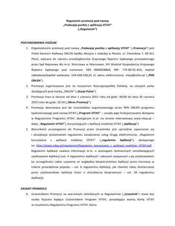 Regulamin promocji pod nazwą „Podwajaj punkty z aplikacją VITAY” („Regulamin”) POSTANOWIENIA OGÓLNE 1. Organizatorem promocji pod nazwą „Podwajaj punkty z aplikacją VITAY” („Promocja”) jest Polski Koncern Naftowy ORLEN Spółka Akcyjna z siedzibą w Płocku, ul. Chemików 7, 09-411 Płock, wpisana do rejestru przedsiębiorców Krajowego Rejestru Sądowego prowadzonego przez Sąd Rejonowy dla m.st. Warszawy w Warszawie, XIV Wydział Gospodarczy Krajowego Rejestru Sądowego pod numerem: KRS 0000028860, NIP: 774-00-01-454, kapitał zakładowy/kapitał wpłacony: 534.636.326,25 zł, adres elektroniczny: [email protected] („PKN ORLEN”). 2. Promocja organizowana jest na terytorium Rzeczypospolitej Polskiej, na stacjach paliw działających pod marką „ORLEN” („Stacje Paliw”). 3. Promocja trwa w okresie od dnia 1 czerwca 2015 roku od godz. 00:00 do dnia 30 czerwca 2015 roku do godz. 23:59 („Okres Promocji”). 4. Promocja skierowana jest do Uczestników organizowanego przez PKN ORLEN programu lojalnościowego pod nazwą VITAY („Program VITAY” – zasady jego funkcjonowania dostępne w Regulaminie Programu VITAY, dostępnym m.in. na stronie internetowej www.vitay.pl – dalej: „Regulamin VITAY”), korzystających z Aplikacji mobilnej VITAY („Aplikacja”). 5. Warunkiem przystąpienia do Promocji przez Uczestnika jest uprzednie zapoznanie się i akceptacja postanowień regulaminu świadczenia usług drogą elektroniczną: „Regulamin korzystania z aplikacji mobilnej VITAY” („regulamin Aplikacji”), dostępnego na http://www.vitay.pl/regulamin/Regulamin_korzystania_z_aplikacji_mobilnej_VITAY.pdf . Regulamin Aplikacji zawiera informacje m.in. o wymogach technicznych umożliwiających użytkowanie Aplikacji (ust. 4 regulaminu Aplikacji) i zakazach związanych z jej użytkowaniem (w szczególności zakaz używania ze względów bezpieczeństwa Aplikacji przez kierowcę w trakcie prowadzenia pojazdu – ust. 6 regulaminu Aplikacji, jak również zakaz dostarczania przez użytkowników Aplikacji treści o charakterze bezprawnym – ust. 20 regulaminu Aplikacji). ZASADY PROMOCJI 6. Uczestnikiem Promocji na warunkach określonych w Regulaminie („Uczestnik”) może być osoba fizyczna będąca Uczestnikiem Program VITAY, posiadająca ważną Kartę VITAY w rozumieniu Regulaminu Programu VITAY, która: a. użytkuje Aplikację na swoim smartfonie, pozostając użytkownikiem zarejestrowanym w Aplikacji (tj. osoba, która dokonała rejestracji w Aplikacji zgodnie z ust. 7 regulaminu Aplikacji), oraz b. w Okresie Promocji użyje Aplikacji (będąc w niej zarejestrowaną, zgodnie z pkt. a powyżej) przy transakcji, o której mowa w ust. 12 poniżej, w trakcie której dojdzie do naliczenia Uczestnikowi punktów VITAY, z zastrzeżeniem ust. 13 poniżej („Transakcja”). 7. Po spełnieniu warunków określonych w ust. 6 powyżej, Uczestnik otrzyma za dokonanie Transakcji premię w punktach VITAY („Dodatkowa premia punktowa”). Wysokość Dodatkowej premii punktowej będzie odpowiadała standardowej ilości punktów VITAY naliczonych Uczestnikowi za dokonanie danej Transakcji. Oznacza to, że do każdego punktu VITAY (standardowo) naliczonego Uczestnikowi za dokonaną w Okresie Promocji Transakcję przyznany zostanie (dodatkowo) jeden punkt VITAY z tytułu Dodatkowej premii punktowej. 8. Dodatkowa premia punktowa dopisana powinna zostać do Salda Punktowego Uczestnika w terminie 48 (czterdziestu ośmiu) godzin od dokonania Transakcji. 9. Potwierdza się, iż punkty VITAY przyznane z tytułu Dodatkowej premii punktowej mogą być wykorzystywane przez Uczestnika na zasadach określonych w Regulaminie Programu VITAY (tzn. podlegać wymianie na Prezenty, Kupony i Rabaty na zasadach i w rozumieniu Regulaminu Programu VITAY). Oznacza to w szczególności, że przyznana Uczestnikowi Dodatkowa premia punktowa może zostać wykorzystana tylko i wyłącznie w sposób wskazany w niniejszym ustępie i nie może zostać wymieniona na jakąkolwiek inną korzyść lub ekwiwalent (w tym pieniężny). W przypadku skutecznego odstąpienia przez Uczestnika od Transakcji lub zniweczenia w inny sposób jej skutków prawnych, przyznana Uczestnikowi za Transakcję Dodatkowa premia punktowa zostanie anulowana. 10. Uczestnik może wziąć udział w Promocji wielokrotnie. Oznacza to, że za każdą Transakcję w Okresie Promocji spełniającą warunki niniejszego Regulaminu Promocji, Uczestnikowi zostanie przyznana Dodatkowa premia punktowa. 11. Z zastrzeżeniem braku możliwości łączenia Promocji z kuponami promocyjnymi, o których mowa w ust. 13 i 14 poniżej, Promocja może być łączona z pozostałymi innymi promocjami oferowanymi przez Organizatora a prowadzącymi do naliczania dodatkowych (względem standardowo przyznawanych) Punktów VITAY. 12. Do Promocji kwalifikują się – z wyłączeniem zakupów doładowań telefonicznych, o których mowa w ust. 13 pkt b poniżej – transakcje, w ramach których dochodzi do naliczenia Uczestnikom punktów VITAY za zakupy towarów i usług na Stacjach Paliw zgodnie z Regulaminem Programu VITAY, Katalogiem Programu VITAY oraz materiałami umieszczonymi bezpośrednio na Stacjach Paliw (wskazującymi na takie naliczenie). Katalog VITAY dostępny jest na http://www.vitay.pl/katalog-Vitay.html . 13. Z Promocji wyłączone są – co oznacza brak przyznawania za nie Dodatkowej premii punktowej – następujące transakcje: a) w ramach których dochodzi do naliczenia Uczestnikowi punktów VITAY na podstawie kuponów promocyjnych; lub b) obejmujące zakup doładowań telefonicznych (także tych objętych standardowym punktowaniem zgodnie z Regulaminem Programu VITAY, Katalogiem Programu VITAY lub materiałami umieszczonymi bezpośrednio na Stacjach Paliw); lub c) obejmujące – z zastrzeżeniem ust. 15 poniżej – zakup napojów alkoholowych oraz artykułów tytoniowych (tj. wyrobów tytoniowych, rekwizytów tytoniowych lub produktów je 