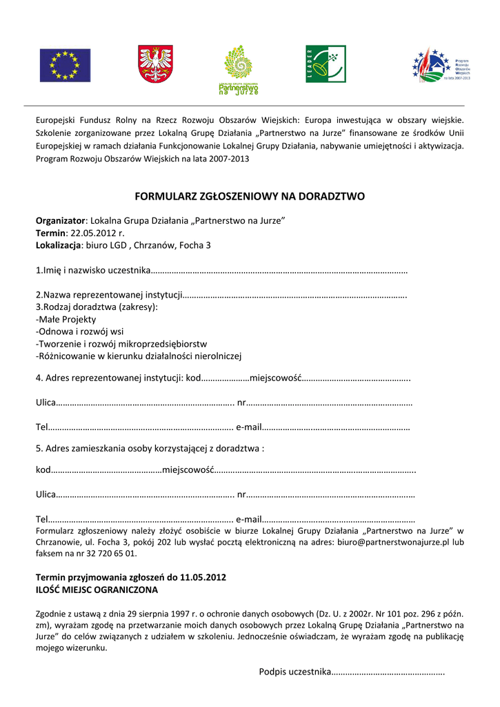 Europejski Fundusz Rolny na Rzecz Rozwoju Obszarów Wiejskich: Europa inwestująca w obszary wiejskie. Szkolenie zorganizowane przez Lokalną Grupę Działania „Partnerstwo na Jurze” finansowane ze środków Unii Europejskiej w ramach działania Funkcjonowanie Lokalnej Grupy Działania, nabywanie umiejętności i aktywizacja. Program Rozwoju Obszarów Wiejskich na lata 2007-2013 FORMULARZ ZGŁOSZENIOWY NA DORADZTWO Organizator: Lokalna Grupa Działania „Partnerstwo na Jurze” Termin: 22.05.2012 r. Lokalizacja: biuro LGD , Chrzanów, Focha 3 1.Imię i nazwisko uczestnika………………………………………………………………………………………………… 2.Nazwa reprezentowanej instytucji……………………………………………………………………………………. 3.Rodzaj doradztwa (zakresy): -Małe Projekty -Odnowa i rozwój wsi -Tworzenie i rozwój mikroprzedsiębiorstw -Różnicowanie w kierunku działalności nierolniczej 4. Adres reprezentowanej instytucji: kod…………………miejscowość……………………………………….. Ulica………………………………………………………………….. nr……………………………………………………………… Tel…………………………………………………………………….. e-mail………………….…………………………………… 5. Adres zamieszkania osoby korzystającej z doradztwa : kod…………………………………………miejscowość…………………………………………………….…………………….. Ulica………………………………………………………………….. nr…………………………………………………………….… Tel…………………………………………………………………….. e-mail……………..…….…………………………………… Formularz zgłoszeniowy należy złożyć osobiście w biurze Lokalnej Grupy Działania „Partnerstwo na Jurze” w Chrzanowie, ul. Focha 3, pokój 202 lub wysłać pocztą elektroniczną na adres: [email protected] lub faksem na nr 32 720 65 01. Termin przyjmowania zgłoszeń do 11.05.2012 ILOŚĆ MIEJSC OGRANICZONA Zgodnie z ustawą z dnia 29 sierpnia 1997 r. o ochronie danych osobowych (Dz. U. z 2002r. Nr 101 poz. 296 z późn. zm), wyrażam zgodę na przetwarzanie moich danych osobowych przez Lokalną Grupę Działania „Partnerstwo na Jurze” do celów związanych z udziałem w szkoleniu. Jednocześnie oświadczam, że wyrażam zgodę na publikację mojego wizerunku. Podpis uczestnika………………………………………….