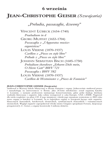 6 września JEAN-CHRISTOPHE GEISER (Szwajcaria) „Preludia, passacaglie, dzwony” VINCENT LÜBECK (1654-1740) Praeludium in d GEORG MUFFAT (1653-1704) Passacaglia z „l’Apparatus musicoorganisticus” LOUIS VIERNE (1870-1937) Carillon z „Pieces en style libre” Prélude z „Pieces en style libre” JOHANN SEBASTIAN BACH (1685-1750) Preludium chorałowe „Erbarm Dich mein, O Herre Gott” BWV 721 Passacaglia c BWV 582 LOUIS VIERNE (1870-1937) Carillon de Westminster z „Pieces de Fantaisie” JEAN-CHRISTOPHE GEISER (Swajcaria) studiował w Wyższej Szkole Muzycznej w Bernie fortepian i organy. Jednocześnie studiował prawo i muzykologię na uniwersutecie w Bernie. Jako 26-letni młodzieniec został organistą katedry w Lozannie, a nastęnie profesorem tamtejszego konserwatorium, gdzie pełni funkcję dziekana wydziału klawesynu i organów. Jako solista występował w calej Europie, USA i ZSRR. Nagrywał dla wielu rozgłośni i na płyty CD. Z jego inicjatywy i dzieki jego staraniom wzniesiono w 2003 roku nowe organy w katedrze w Lozannie. Są to największe organy w Szwajcarii łączące style organów: klasycznych francuskich, barokowych niemieckich, symfonicznych francuskich i romantycznych niemieckich. Wygląd organów zaprojektował włoski mistrz Giugiaro (projektant Ferrari), dyspozycje przygotował J.-C. Geiser, a organy kosztowały 4 miliony dolarów.