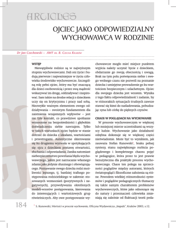 ARTICLES Ojciec jako odpowiedzialny wychowawca w rodzinie Dr Jan Czechowski – AWF im . B. Czecha K raków Wstęp Niewątpliwie rodzice są w najwyższym stopniu wychowawcami. Dali oni życie i budują pierwsze i najważniejsze w życiu człowieka środowisko wychowawcze. Szczególną rolę pełni ojciec, który ma być znaczącą dla dzieci osobowością i przez swą mądrość wskazywać im drogę, oddziaływać i inspirować. Sam także na drodze relacji z dzieckiem uczy się on krytycyzmu i pracy nad sobą. Niezwykle ważnym elementem owego oddziaływania – swoistym fundamentem dla zaistnienia wzajemnych wpływów – jest nie tyle kontakt, co prawdziwe spotkanie wznoszone na bezpośredniości i głębokim doświadczeniu siebie nawzajem. Tylko w takich warunkach ojciec będzie w stanie dotrzeć do dziecka z ideałami, wartościami i przestrogami. Autentyczne skierowanie się ku drugiemu wyzwala w spotykających się: ojcu z dzieckiem postawę otwartości, słuchania i odpowiadania. Zanika natomiast niebezpieczeństwo powstania błędu wychowawczego, jakim jest narzucanie własnego zdania jako jedynie słusznego i obowiązującego. Poznawanie swego dziecka rodzi możliwości lepszego, tj. bardziej trafnego postępowania rodzicielskiego w zakresie: stosowanych wzmocnień (pozytywnych i negatywnych), przywoływania określonych modeli-wzorów postępowania, kierowania do interesujących i wartościowych grup rówieśniczych. Aby owe postępowanie wy- 184 1 chowawcze mogło mieć miejsce punktem wyjścia należy uczynić bycie z dzieckiem, obdarzanie go swoją obecnością i uwagą. Brak na tym polu poświęcenia siebie i swego wolnego czasu nie pozwoli na poznanie dziecka i umiejętne prowadzenie go ku wartościom bezpiecznym i szlachetnym. Ojciec dla swojego dziecka jest wzorem. Wynika z tego faktu odpowiedzialność i zadanie, by w różnorakich sytuacjach trudnych zawsze stawać się kimś do naśladowania, pobudzając syna lub córkę do pięknych czynów. Chaos w poglądach na wychowanie W procesie wychowawczym w większej lub mniejszej mierze uczestnikami są wszyscy ludzie. Wychowanie jako działalność odrębna dokonuje się w większej części nieświadomie. Może być to wynikiem, jak zauważa Stefan Kunowski1, braku pełnej syntezy, stanu największego rozbicia poglądowego i kompletnego chaosu pojęć w pedagogice, która przez to jest prawie bezużyteczna dla praktyki procesu wychowawczego. Chaos ten polega na sprzeczności poglądów między autorami, których światopogląd i filozoficzne założenia są różne. Powodem wielkiej różnorodności systemów i poglądów pedagogicznych tłumaczy się także samym charakterem problemów wychowawczych, które jako odnoszące się do natury i przeznaczeń człowieka zmieniają się zależnie od fluktuacji teorii peda- S. Kunowski, Wartości w procesie wychowania, Oficyna Wydawnicza „Impuls”, Kraków 2003, s.12. ARTYKUŁY gogicznych i moralnych. Brak porozumienia co do celów wychowania między różnymi pedagogami powoduje, iż praktyka pedagogiczna idzie swoją drogą, badania naukowe kroczą swoją szosą, a teoria pedagogiczna pędzi do przodu swoją autostradą2. Słusznie zauważa profesor Kukulski, iż „wychowanie nie jest sprawą prostą, gdyż posiada nadzwyczaj wiele składników, dlatego też i pedagogikę można ujmować z wielu stron. Zależnie od tego, co bierzemy za punkt wyjścia w rozważaniach pedagogicznych, otrzymujemy następujące rodzaje wychowania”, wyliczając przy tym: wychowanie według rodzajów działania, według istoty wychowania, założeń – warunków, dziedzin kultury, miejsca, przebiegu rozwoju...3. Istniejąca wśród specjalistów rozbieżność w pojmowaniu wychowania i jednoznacznego poglądu na cele i wartości tu obecne nie czyni łatwym rozeznanie się w kwestiach dotyczących wychowania dzieci. Nie należy się zatem dziwić pewnemu zagubieniu w przyjmowaniu takich, a nie innych postaw wychowawczych czy obierania niewłaściwych stylów w wychowaniu. Brak jednoznacznych drogowskazów pedagogicznego postępowania dla ojca-wychowawcy w rodzinie implikuje różne trudności i problemy w tym obszarze. Realia życia rodzinnego krzyżują w sobie chwile wzniosłe i dramatyczne. Wymagają one na danym etapie życia od ojca – „głowy rodziny” – przyjęcia właściwych postaw. Brak odpowiedniego przygotowania, w tym także oczytania w literaturze z tego zakresu (oferta książkowa, prasowa prezentująca problematykę ojcostwa; pozycje naukowe, popularno-naukowe, poradniki, różne audycje i nagrania – są bardzo obszerną propozycją czytelniczą) przez potencjalnych ojców skutkuje powstaniem takiego spiętrzenia sytuacji trudnych, iż samodzielnie są one praktycznie nie do rozwiązania. Interesujący pogląd na temat wychowania – wychowania, w którym funkcja ojca jest nie do przecenienia – wyraził jeden z najwybitniejszych przedstawicieli pedagogiki dwudziestego wieku Sergiusz Hessen, nazywając wychowanie człowieka podróżą w kraju ducha, w świecie kultury ludzkiej, w ciągu której działalność człowieka uzyskuje coraz bardziej charakter powołania twórczego, a koło jego obcowania coraz się rozszerza, obejmując granicznie nie tylko całe pokolenie obecne w jego prawdziwej walce twórczej, lecz i ludzkość dawną, a nawet przyszłą. Przelotna rozmowa, przypadkowe spotkanie, przeczytana książka, wysłuchany koncert lub wykład, przedstawienie teatralne – wszystko to, według wspomnianego autora, może się stać doniosłym i głębokim zdarzeniem w tej wędrówce ducha ludzkiego4. Ojciec jako jeden z rodziców najbliższy dziecku jest zgodnie z powyższą myślą przewodnikiem młodego człowieka w świecie kultury i doradcą na drodze powołania. Zadania te przejmują w późniejszym już życiu instytucje, osoby, wydarzenia, autorytety. Ojciec jednak zawsze powinien być dla dziecka tym pierwszym przekazicielem mądrości i nadawania kierunku