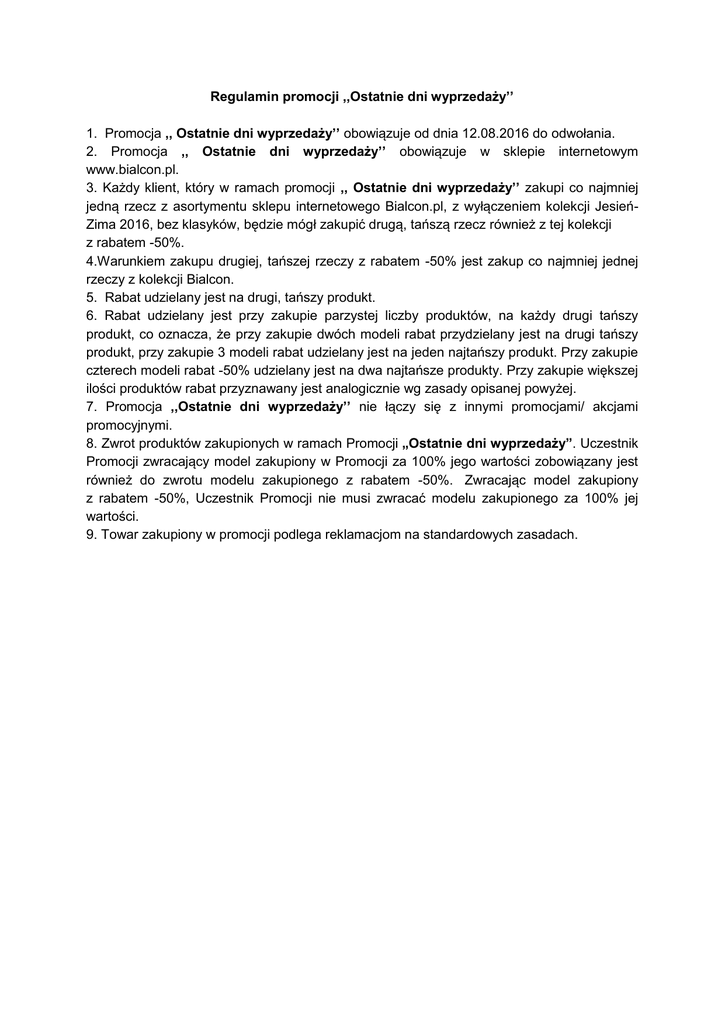 Regulamin promocji ,,Ostatnie dni wyprzedaży’’ 1. Promocja ,, Ostatnie dni wyprzedaży’’ obowiązuje od dnia 12.08.2016 do odwołania. 2. Promocja ,, Ostatnie dni wyprzedaży’’ obowiązuje w sklepie internetowym www.bialcon.pl. 3. Każdy klient, który w ramach promocji ,, Ostatnie dni wyprzedaży’’ zakupi co najmniej jedną rzecz z asortymentu sklepu internetowego Bialcon.pl, z wyłączeniem kolekcji JesieńZima 2016, bez klasyków, będzie mógł zakupić drugą, tańszą rzecz również z tej kolekcji z rabatem -50%. 4.Warunkiem zakupu drugiej, tańszej rzeczy z rabatem -50% jest zakup co najmniej jednej rzeczy z kolekcji Bialcon. 5. Rabat udzielany jest na drugi, tańszy produkt. 6. Rabat udzielany jest przy zakupie parzystej liczby produktów, na każdy drugi tańszy produkt, co oznacza, że przy zakupie dwóch modeli rabat przydzielany jest na drugi tańszy produkt, przy zakupie 3 modeli rabat udzielany jest na jeden najtańszy produkt. Przy zakupie czterech modeli rabat -50% udzielany jest na dwa najtańsze produkty. Przy zakupie większej ilości produktów rabat przyznawany jest analogicznie wg zasady opisanej powyżej. 7. Promocja ,,Ostatnie dni wyprzedaży’’ nie łączy się z innymi promocjami/ akcjami promocyjnymi. 8. Zwrot produktów zakupionych w ramach Promocji „Ostatnie dni wyprzedaży”. Uczestnik Promocji zwracający model zakupiony w Promocji za 100% jego wartości zobowiązany jest również do zwrotu modelu zakupionego z rabatem -50%. Zwracając model zakupiony z rabatem -50%, Uczestnik Promocji nie musi zwracać modelu zakupionego za 100% jej wartości. 9. Towar zakupiony w promocji podlega reklamacjom na standardowych zasadach.