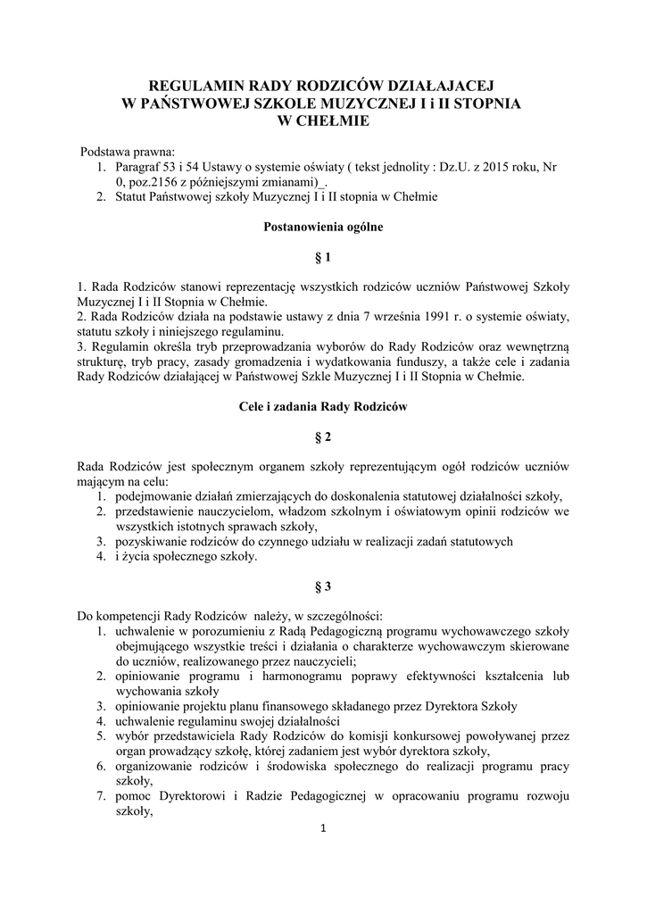 REGULAMIN RADY RODZICÓW DZIAŁAJACEJ W PAŃSTWOWEJ SZKOLE MUZYCZNEJ I i II STOPNIA W CHEŁMIE Podstawa prawna: 1. Paragraf 53 i 54 Ustawy o systemie oświaty ( tekst jednolity : Dz.U. z 2015 roku, Nr 0, poz.2156 z późniejszymi zmianami)_. 2. Statut Państwowej szkoły Muzycznej I i II stopnia w Chełmie Postanowienia ogólne §1 1. Rada Rodziców stanowi reprezentację wszystkich rodziców uczniów Państwowej Szkoły Muzycznej I i II Stopnia w Chełmie. 2. Rada Rodziców działa na podstawie ustawy z dnia 7 września 1991 r. o systemie oświaty, statutu szkoły i niniejszego regulaminu. 3. Regulamin określa tryb przeprowadzania wyborów do Rady Rodziców oraz wewnętrzną strukturę, tryb pracy, zasady gromadzenia i wydatkowania funduszy, a także cele i zadania Rady Rodziców działającej w Państwowej Szkle Muzycznej I i II Stopnia w Chełmie. Cele i zadania Rady Rodziców §2 Rada Rodziców jest społecznym organem szkoły reprezentującym ogół rodziców uczniów mającym na celu: 1. podejmowanie działań zmierzających do doskonalenia statutowej działalności szkoły, 2. przedstawienie nauczycielom, władzom szkolnym i oświatowym opinii rodziców we wszystkich istotnych sprawach szkoły, 3. pozyskiwanie rodziców do czynnego udziału w realizacji zadań statutowych 4. i życia społecznego szkoły. §3 Do kompetencji Rady Rodziców należy, w szczególności: 1. uchwalenie w porozumieniu z Radą Pedagogiczną programu wychowawczego szkoły obejmującego wszystkie treści i działania o charakterze wychowawczym skierowane do uczniów, realizowanego przez nauczycieli; 2. opiniowanie programu i harmonogramu poprawy efektywności kształcenia lub wychowania szkoły 3. opiniowanie projektu planu finansowego składanego przez Dyrektora Szkoły 4. uchwalenie regulaminu swojej działalności 5. wybór przedstawiciela Rady Rodziców do komisji konkursowej powoływanej przez organ prowadzący szkołę, której zadaniem jest wybór dyrektora szkoły, 6. organizowanie rodziców i środowiska społecznego do realizacji programu pracy szkoły, 7. pomoc Dyrektorowi i Radzie Pedagogicznej w opracowaniu programu rozwoju szkoły, 1 8. organizowanie prac społecznie użytecznych rodziców i środowiska społecznego na rzecz szkoły, 9. podejmowanie działań zmierzających do pozyskania środków finansowych na dofinansowanie działalności szkoły. Wybory do Rady Rodziców §4 1. Wybory do Rady Rodziców przeprowadzane są corocznie, we wrześniu na pierwszym zebraniu rodziców uczniów Państwowej Szkoły Muzycznej I i II Stopnia w Chełmie. 2. O zebraniach rodziców uczniów Państwowej Szkoły Muzycznej I i II Stopnia w Chełmie, rodzice powiadamiani są co najmniej tydzień przed planowanym terminem zebrania za pośrednictwem uczniów, przez wywieszenie na terenie szkoły odpowiedniego ogłoszenia oraz, za pośrednictwem strony internetowej szkoły. 3. Do udziału w wyborach uprawnieni są rodzice wszystkich uczniów Państwowej Szkoły Muzycznej I i II Stopnia w Chełmie. Jednego ucznia może reprezentować w wyborach tylko jeden rodzic. 4. Wybory do Rady Rodziców przeprowadza Komisja Skrutacyjna wybrana w głosowaniu jawnym spośród uczestników zebrania. 5. Wybory odbywają się w głosowaniu tajnym na zasadach ustalonych przez rodziców uczestniczących w zebraniu. 6. Kandydatów do Rady Rodziców może zgłosić każdy z rodziców uczniów uczestniczących w zebraniu rodziców. 7. Zgłoszeni kandydaci muszą wyrazić swoją zgodę na kandydowanie. §5 1. Ogłoszenie wyników wyborów, podanie do publicznej wiadomości składu Rady Rodziców i zwołanie jej pierwszego posiedzenia należy do obowiązków Dyrektora Szkoły. 2. Pierwsze posiedzenie Rady Rodziców powinno odbyć się nie później niż 14 dni od terminu wyborów. 3. Kadencja Rady Rodziców trwa jeden rok szkolny. Władze Rady Rodziców §6 Rada Rodziców wybiera ze swojego grona Przewodniczącego Przewodniczącego, Sekretarza oraz Komisję Rewizyjną. Rady, Zastępcę §7 1. Przewodniczący Rady Rodziców: 1) organizuje prace Rady, 2) zwołuje i prowadzi posiedzenia Rady, 3) współdziała ze wszystkimi członkami Rady Rodziców, 4) przekazuje opinie i postulaty wobec Dyrektora Szkoły i Rady Pedagogicznej, 2 5) reprezentuje Radę na zewnątrz. 2. Zastępca Przewodniczącego Rady Rodziców przejmuje obowiązki Przewodniczącego w czasie jego nieobecności. 3. Sekretarz Rady Rodziców: 1) odpowiada za dokumentację Rady i protokołowanie jej posiedzeń, 2) prowadzenie korespondencji i dokumentacji oraz zapewnienie prawidłowego jej przechowywania. 4. Komisja Rewizyjna jest organem kontrolnym Rady i wykonuje następujące zadania: 1) Kontroluje realizację uchwał Rady; 2) nadzoruje celowość i prawidłowość ponoszonych przez Radę wydatków; 3) składa roczne sprawozdanie ze swych prac, wraz z wnioskami pokontrolnymi. Posiedzenia Rady Rodziców §8 1. Posiedzenia Rady Rodziców zwoływane są nie rzadziej niż dwa razy w roku szkolnym. 2. Posiedzenie może zostać zwołane także w każdym czasie na wniosek: 1) Przewodniczącego Rady Rodziców, 2) trzech członków Rady Rodziców, 3) Dyrektora Szkoły, 4) Rady Pedagogicznej, 5) 10% ogółu rodziców uczniów. §9 1. Przygotowanie posiedzenia Rady Rodziców jest obowiązkiem Przewodniczącego. 2. Posiedzenia Rady są prowadzone przez Przewodniczącego lub upoważnionego członka Rady. 3. W posiedzeniach Rady może brać udział z głosem doradczym Dyrektor Szkoły lub inne osoby zaproszone przez Przewodniczącego za zgodą lub na wniosek Rady. 4. Posiedzenie Rady jest ważne, jeśli bierze w nim udział co najmniej połowa członków Rady. 5. Posiedzenia Rady są protokołowane przez Sekretarza. Podejmowanie uchwał § 10 1. Rada Rodziców wyraża swoje stanowisko w formie uchwał. 2. Rada Rodziców podejmuje uchwały w sprawach należących do jej kompetencji, określonych w ustawach oraz przepisach wydawanych na podstawie tych ustaw. 3. Uchwały Rady są podejmowan