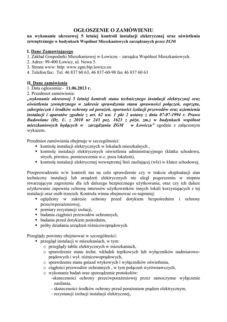OGŁOSZENIE O ZAMÓWIENIU na wykonanie okresowej 5 letniej kontroli instalacji elektrycznej oraz oświetlenia zewnętrznego w budynkach Wspólnot Mieszkaniowych zarządzanych przez ZGM I. Dane Zamawiającego 1. Zakład Gospodarki Mieszkaniowej w Łowiczu – zarządca Wspólnot Mieszkaniowych. 2. Adres: 99-400 Łowicz, ul. Nowa 5. 3. Strona www: http: www.zgm.bip.lowicz.eu 4. Telefon/fax: Tel. 46 837 60 63, 46 837-60-98 fax 46 837 60 63 II. Dane zamówienia 1. Data ogłoszenia:- 11.06.2013 r. 2. Przedmiot zamówienia: „wykonanie okresowej 5 letniej kontroli stanu technicznego instalacji elektrycznej oraz oświetlenia zewnętrznego w zakresie sprawdzenia stanu sprawności połączeń, osprzętu, zabezpieczeń i środków ochrony od porażeń, oporności izolacji przewodów oraz uziemienia instalacji i aparatów zgodnie z art. 62 ust. 1 pkt 2 ustawy z dnia 07-07-1994 r. Prawo Budowlane (Dz. U. z 2010 nr 243 poz. 1623 z późn. zm.) w budynkach wspólnot w Łowiczu” zgodnie z załączonym mieszkaniowych będących w zarządzaniu ZGM wykazem. Przedmiot zamówienia obejmuje w szczególności: kontrolę instalacji elektrycznych w lokalach mieszkalnych , kontrolę instalacji elektrycznych oświetlenia administracyjnego (klatka schodowa, strych, piwnice, pomieszczenia w.c. poza lokalem), kontrolę instalacji elektrycznej wewnętrznej linii zasilającej (wlz) w klatce schodowej, Przeprowadzenie w/w kontroli ma na celu sprawdzenie czy w trakcie eksploatacji stan techniczny instalacji lub urządzeń elektrycznych nie uległ pogorszeniu w stopniu stwarzającym zagrożenie dla ich dalszego bezpiecznego użytkowania, oraz czy ich dalsze użytkowanie zapewnia ochronę interesów użytkowników innych lokali korzystających z tej instalacji oraz osób trzecich. Kontrola winna obejmować co najmniej: oględziny w zakresie ochrony przed dotykiem bezpośrednim i ochrony przeciwporażeniowej, pomiary rezystancji izolacji, badania ciągłości przewodów ochronnych, badania przed dotykiem pośrednim, próby działania urządzeń różnicowoprądowych. Przeglądy powinny obejmować w szczególności: przegląd instalacji w mieszkaniach, w tym: o przeglądy tablic elektrycznych w mieszkaniach, o sprawdzenie stanu techn. wkładek topikowych lub wyłączników nadmiarowoprądowych i wył. różnicowoprądowych, o sprawdzenie stanu gniazd wtykowych i wyłączników oświetlenia, o ciągłości przewodów ochronnych , w tym połączeń wyrównawczych, o wykonanie badań oraz sporządzenie protokołów: -skuteczności ochrony przeciwporażeniowej przez samoczynne wyłączenie zasilania, - skuteczności środków ochrony przed porażeniem prądem elektrycznym, - rezystancji izolacji instalacji elektrycznej, -sprawdzenie skuteczności działania wyłącznika różnicowo-prądowego. przegląd instalacji na klatkach schodowych, strychach, w piwnicach oraz w.c. poza lokalem (instalacje oświetl. administracyjnego), w tym: o przegląd i ocena sprawności wyłączników, przycisków oraz opraw oświetleniowych, o sprawdzenie stanu techn. wkładek topik. lub wyłączników nadmiarowoprądowych w tabl. administracyjnych, o wykonanie badań oraz sporządzenie protokołów: - skuteczności ochrony przeciwporażeniowej przez samoczynne wyłączenie zasilania, - rezystancji izolacji instalacji elektrycznej. przegląd instalacji wewnętrznej linii zasilania (wlz) w klatce schodowej, w tym: o sprawdzenie stanu technicznego zabezpieczenia budynku (przegląd, ocena sprawności techn. od strony mechanicznej), o przegląd tablic rozdzielczych piętrowych, o sprawdzenie stanu techn. wkładek topik. lub wyłączników nadmiarowoprądowych, o sprawdzenie tablic licznikowych i liczników (obwodów administracyjnych), o sprawdzenie ciągłości przewodów ochronnych, w tym połączeń wyrównawczych, o wykonanie badań i sporządzenie protokołów: - skuteczności ochrony przeciwporażeniowej przez samoczynne wyłączenie zasilania, - rezystancji izolacji instalacji elektrycznej, - sprawdzenie rozdzielnic tablicowych, - sporządzenie schematu ideowego 1-kreskowego wlz instalacji elektrycznej budynku (wg potrzeb, zgodnie z załącznikiem nr 1 do umowy, stanowiącym wykaz budynków) - od zewnętrznego przyłącza kablowego do tablic w mieszkaniach - z opisem rodzaju i przekrojów przewodów oraz stosowanego osprzętu i zabezpieczeń. 3. Zakres zamówienia – budynki wielorodzinne niżej mieszkaniowych: 1) Wspólnota Mieszkaniowa ul. Armii Krajowej 43G 2) Wspólnota Mieszkaniowa ul. Armii Krajowej 43H 3) Wspólnota Mieszkaniowa ul. Czajki 1A 4) Wspólnota Mieszkaniowa Kaliska 6J 5) Wspólnota Mieszkaniowa Osiedle Kostka 2 6) Wspólnota Mieszkaniowa Osiedle Kostka 3 7) Wspólnota Mieszkaniowa Osiedle Kostka 5 8) Wspólnota Mieszkaniowa Osiedle Kostka 7 9) Wspólnota Mieszkaniowa Osiedle Kostka 9 10) Wspólnota Mieszkaniowa Osiedle Kostka 10 11) Wspólnota Mieszkaniowa Osiedle Kostka 11 12) Wspólnota Mieszkaniowa Osiedle Kostka 12 13) Wspólnota Mieszkaniowa Osiedle Kostka 13 14) Wspólnota Mieszkaniowa Osiedle Kostka 14 15) Wspólnota Mieszkaniowa Osiedle Kostka 17 16) Wspólnota Mieszkaniowa Osiedle Starzyńskiego 1 w zakresie określonym w załączonym wykazie. wymienionych - NIP - NIP - NIP - NIP - NIP - NIP - NIP - NIP - NIP - NIP - NIP - NIP - NIP - NIP - NIP - NIP wspólnot 834-18-24-686 834-18-24-746 834-18-24-717 834-18-24-692 834-18-24-858 834-18-24-700 834-18-24-597 834-18-24-634 834-18-24-663 834-18-24-640 834-18-24-611 834-18-24-628 834-18-24-580 834-18-24-657 834-18-24-870 834-18-24-752 4. Termin realizacji zamówienia do: 31 sierpnia 2013 r. 5. Warunki uczestnictwa; O udzielenie zamówienia mogą ubiegać się Wykonawcy, którzy: posiadają uprawnienia lub dysponują osobami zdolnymi do wykonania, albo będą dysponować osobami posiadającymi następujące uprawnienia: uprawnienia budowlane do wykonywania samodzielnych funkcji technicznych w budownictwie o specjalności elektrycznej oraz świadectwo kwalifikacyjne uprawni