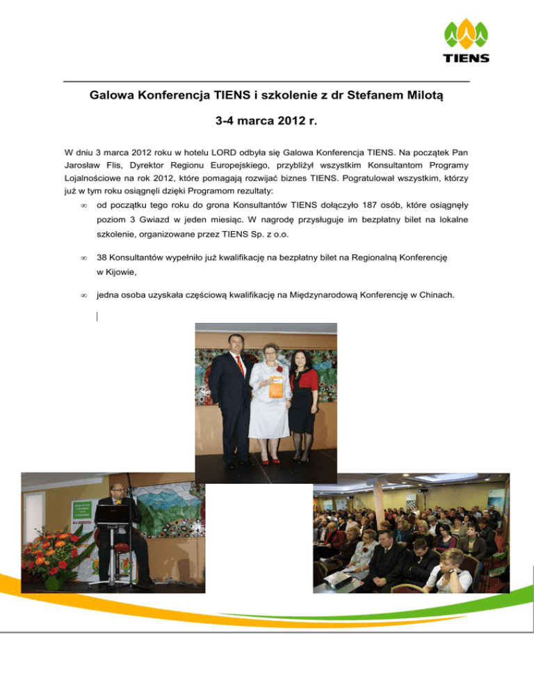 Galowa Konferencja TIENS i szkolenie z dr Stefanem Milotą 3-4 marca 2012 r. W dniu 3 marca 2012 roku w hotelu LORD odbyła się Galowa Konferencja TIENS. Na początek Pan Jarosław Flis, Dyrektor Regionu Europejskiego, przybliżył wszystkim Konsultantom Programy Lojalnościowe na rok 2012, które pomagają rozwijać biznes TIENS. Pogratulował wszystkim, którzy już w tym roku osiągnęli dzięki Programom rezultaty: • od początku tego roku do grona Konsultantów TIENS dołączyło 187 osób, które osiągnęły poziom 3 Gwiazd w jeden miesiąc. W nagrodę przysługuje im bezpłatny bilet na lokalne szkolenie, organizowane przez TIENS Sp. z o.o. • 38 Konsultantów wypełniło już kwalifikację na bezpłatny bilet na Regionalną Konferencję w Kijowie, • jedna osoba uzyskała częściową kwalifikację na Międzynarodową Konferencję w Chinach. Następnie swoją ogromną wiedzę zaprezentował dr Stefan Milota, specjalista od zdrowego żywienia i programu „Styl Życia z TIENS”. Dr Milota dokładnie omówił skład trzech suplementów TIENS – Carb Blockera, Capsilite i Chitosanu oraz ich niezwykle korzystny wpływ na nasze zdrowie. Przekazał również wiele cennych rad, które mogą pomóc w zgubieniu zbędnych kilogramów oraz zmianie stylu życia na zdrowszy. Zgromadzeni Konsultanci mogli dowiedzieć się więcej na temat dwóch suplementów, które dostępne są w ofercie TIENS od niedawna – Omega-3 i Ekstrakt z „Chińskich Daktyli”. Dr Milota omówił także zalety nowego produktu - Syropu FOS, który już w kwietniu będzie można zakupić w Autoryzowanych Biurach TIENS. Na scenie pojawili się również uczestnicy Grupy Pilotażowej programu „Styl Życia z TIENS” – Beata Balcarek, Armin Empacher, Wiesław Ligocki oraz Barbara Wójcik-Lip. Opowiedzieli o tym, jak zmieniło się ich życie, od kiedy suplementację nowymi produktami TIENS połączyli z częstszą aktywnością fizyczną oraz zdrowym odżywianiem i pochwalili się swoimi rezultatami. W trakcie Galowej Konferencji wyróżnieni zostali Konsultanci, którzy wypełnili nowe kwalifikacje w okresie od września 2011 do stycznia 2012. Osoby te zostały uhonorowane odznaczeniami i dyplomami. Punktem kulminacyjnym spotkania było przyznanie Nagród Rocznych za rok 2011. Zwycięzcy w poszczególnych kategoriach zostali nagrodzeni statuetkami i prezentami. Srebrne i Brązowe Lwy TIENS zostały dodatkowo nagrodzone bonami do SPA. Prezentacja z nazwiskami osób nominowanych i zwycięzców w poszczególnych kategoriach dostępna jest na stronie internetowej: www.tiens.pl Po konferencji odbyła się uroczysta kolacja z dr Stefanem Milotą, na którą zostali zaproszeni Liderzy Struktur TIENS, Zwycięzcy Nagród Rocznych 2011 oraz osoby, które wypełniły odpowiednią kwalifikację. Dodatkowo goście z Instytutu Konfucjusza przybliżyli wszystkim kulturę chińską, opowiadając o symbolice smoka w Chinach i Europie, malarstwie chińskim oraz odmianach i historii azjatyckich sztuk walki. Następnego dnia, 4 marca, odbyła się sesja szkoleniowa dla specjalistów od programu „Styl Życia z TIENS”. Wzięli w niej udział Konsultanci 6, 7, 8 Gwiazd, Liderzy oraz zakwalifikowane osoby. Dr Milota przybliżył wszystkim techniki sprzedażowe oraz udzielił wielu cennych rad, jak prezentować zalety suplementów TIENS.