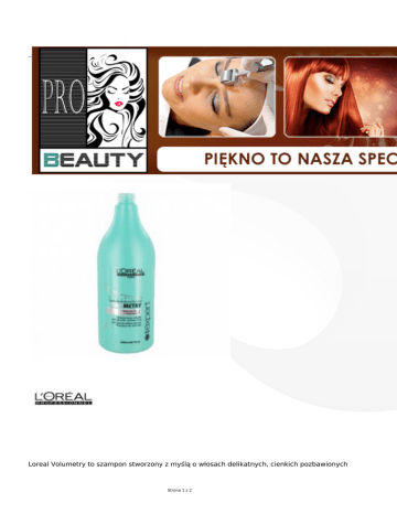 Loreal Volumetry to szampon stworzony z myślą o włosach delikatnych, cienkich pozbawionych Strona 1 z 2 objętości. Technologia Volumetry wzbogacona o kwas salicylowy oraz Infra-Cyclane™ oraz substancję czynną HydraLight oczyszcza, nawilża i dodaje optycznie włosom dodatkowej objętości. Kwas salicylowy delikatnie oczyszcza skórę głowy, usuwa sebum i zmniejsza ryzyko opadania włókna włosa i przywierania do skóry głowy. Infra-Cyclane™ to mikrocząsteczka która, głęboko wnika w włókno włosa, przyczynia się do zwiększenia i wzmacniania struktury włókien o elastyczne podłoże, zapewniając mocne podstawy włosa aby utrzymać objętość. Hydralight to aktywny składnik znany z właściwości nawilżających. Hydralight nawilża i pielęgnuje włosy, bez obciążania pozostawiając uczucie gładkości i miękkości włosów. Produkt do profesjonalnej pielęgnacji włosów. Strona 2 z 2