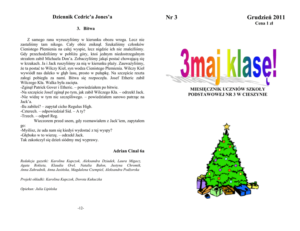 Dziennik Cedric’a Jones’a Nr 3 Grudzień 2011 Cena 1 zł 3. Bitwa Z samego rana wyruszyliśmy w kierunku obozu wroga. Lecz nie zastaliśmy tam nikogo. Cały obóz zniknął. Szukaliśmy członków Cienistego Plemienia na całej wyspie, lecz nigdzie ich nie znaleźliśmy. Gdy przechodziliśmy w pobliżu góry, ktoś jednym niedostrzegalnym strzałem zabił Michaela Don’a. Zobaczyliśmy jakąś postać chowającą się w krzakach. Ja i Jack ruszyliśmy za nią w kierunku plaży. Zauważyliśmy, że ta postać to Wilczy Kieł, syn wodza Cienistego Plemienia. Wilczy Kieł wywiódł nas daleko w głąb lasu, prosto w pułapkę. Na szczęście reszta załogi pobiegła za nami. Bitwa się rozpoczęła. Josef Etheric zabił Wilczego Kła. Walka była zacięta. -Zginął Patrick Gover i Etheric. – powiedziałem po bitwie. -Na szczęście Josef zginął po tym, jak zabił Wilczego Kła. – odrzekł Jack. -Nie widzę w tym nic szczęśliwego. – powiedziałem surowo patrząc na Jack’a. -Ilu zabiłeś? – zapytał cicho Regulus High. -Czterech. – odpowiedział Sid. – A ty? -Trzech. – odparł Reg. Wieczorem przed snem, gdy rozmawiałem z Jack’iem, zapytałem go: -Myślisz, że uda nam się kiedyś wydostać z tej wyspy? -Głęboko w to wierzę. – odrzekł Jack. Tak zakończył się dzień siódmy mej wyprawy. Adrian Cinal 6a Redakcja gazetki: Karolina Kupczok, Aleksandra Dziadek, Laura Migacz, Agata Rokieta, Klaudia Oreł, Natalia Bałon, Justyna Chromik, Anna Zahradnik, Anna Jasińska, Magdalena Czempiel, Aleksandra Podżorska Projekt okładki: Karolina Kupczok, Dorota Kukuczka Opiekun: Julia Lipińska -12- MIESIĘCZNIK UCZNIÓW SZKOŁY PODSTAWOWEJ NR 3 W CIESZYNIE Krzyżówka Zapraszamy do rozwiązania naszej świątecznej krzyżówki Na osoby, które to zrobią i zaniosą kupon do biblioteki, czeka losowanie i nagroda Za nami Święto Patrona Szkoły Janusza Korczaka. Obchodziliśmy je 10 listopada. Z tej okazji zorganizowano w szkole uroczyste akademie. Podczas jednej z nich odbyło się uroczyste pasowanie pierwszoklasistów na uczniów „Trójki”. To uroczyste wydarzenie zostało przygotowane przez nauczycieli i uczniów klas: 1a,1b i 1c. Wszyscy sobie pomagali. Nauczycielki wraz ze swoimi podopiecznymi uczyły się tekstów piosenek i wierszyków. Laura Sosin i Natalia Sembol zaprosiły wszystkich obecnych na występ. Każde dziecko wyrecytowało krótki wierszyk. Następnie pani dyrektor mgr Mariola Lapczyk zadawała dzieciom pytania, na które musiały odpowiedzieć. Śpiewano różne piosenki. Potem pani dyrektor zabrała głos. Następnie rozpoczęła się najbardziej podniosła chwila - odśpiewano hymn, po czym dzieci złożyły uroczyste ślubowanie. Wtedy pani dyrektor dotknęła każde dziecko ogromnym ołówkiem i wręczyła róg obfitości każdemu pierwszoklasiście. Od tego momentu uczniowie klas 1a, 1b i 1c są pełnoprawnymi uczniami naszej szkoły. 1. 2. 3. 4. 5. 6. 7. 1.Piecze ciasteczka na święta. 2.Dekorujemy ją na święta. 3.Wchodzi przez niego Mikołaj. 4.Ciasto z makiem. 5.Wiesza się go na choinkę. 6.Jemy ją w Wigilię. 7. Stawiamy je na stole z orzechami. Zapytaliśmy kilkoro uczniów, jak się czują po tej uroczystości? Bardzo mi się podobało. Cieszę się, że jestem w pierwszej klasie. Dominika Frydrychowicz kl.1a Jest super. Fajnie jest być pierwszakiem. Martyna Samosiuk kl.1a Przygotowały: Agata Rokieta, Klaudia Oreł, Justyna Chromik Rozwiązanie: ……………………………………………… Imię i nazwisko ………………………………..kl………………………. Cieszę się, że jestem w pierwszej klasie. Laura Kłębek kl.1b Opracowały: Natalia Bałon i Klaudia Oreł -2- Informujemy, że nagrodę za rozwiązanie quizu w poprzednim numerze wylosował Jakub Kuprewicz z klasy 4b Gratulacje!! -11- Poradnik Nastolatków Niedługo rozpoczną się święta. Chcemy podsunąć Wam kilka pomysłów na świąteczny nastrój: * Znajdź różne kolorowe i świąteczne ozdoby np. girlandy * Przystrój choinkę bombkami i różnobarwnymi lampkami * Upiecz ciasta i ciasteczka * Nakryj stół białym obrusem i włóż pod niego siano * Zadbaj o odpowiednią muzykę – kolędy *Kup i zawieś jemiołę * Nie zapomnij o prezentach dla rodziny W dniach 28-30 listopada w „Domu polskim” w Cierlicku – Kościelcu (Czechy) odbył się międzynarodowy konkurs gwarowy pt. „Po cieszyńsku po obu stronach Olzy”. Naszą szkołę reprezentowało na nim dwoje uczniów: Aleksandra Dziadek (4b) i Remigiusz Raszka (5b). Oboje bardzo sumiennie przygotowywali się do konkursu pod okiem rodziców i pani Julii Lipińskiej. Do opanowania mieli tekst o tradycjach bożonarodzeniowych w naszym regionie pisany gwarą cieszyńską. Z dumą informujemy, że Aleksandra Dziadek zajęła w tym konkursie 3 miejsce, pokonując po drodze około 40 rywali ze szkół z regionu śląska cieszyńskiego i Zaolzia. Ola wzięła również udział w uroczystym Koncercie Laureatów 9 grudnia, podczas którego odebrała nagrodę i miała możliwość ponownie zaprezentować swoje umiejętności. Gratulujemy bardzo serdecznie takiego sukcesu oraz samego udziału w konkursie i czekamy na kolejne sukcesy na tym polu! Występ Oli będziecie mogli zobaczyć sami podczas jasełek wystawianych niedługo w naszej szkole. Za nami konkurs piosenki religijnej pt. „Radosny Chrześcijanin”, który odbył się 17 listopada. W kategorii klas młodszych laureatami zostali: I miejsce Agnieszka Mołdrzyk 1c II miejsce Michał Gazda 3a III miejsce Maria Hankus, Karolina Fornal, Natalia Żyła, Jakub Grabowski 3a W kategorii klas 4-6 pierwsze trzy miejsca zajęli: I miejsce Maria Trojszczak, Marcin Kozubek, Sebastian Sikora, Łukasz Skałka (klasy 6) II miejsce Roma Fober 5a i Bartosz Rakowski 4b III miejsce Nikola Sierant 4a Opracowały: Natalia Bałon, Anna Jasińska, Aleksandra Podżorska) -10- Gratulujemy zwycięzcom i wyróżnionym! -3- Podajemy również wyniki