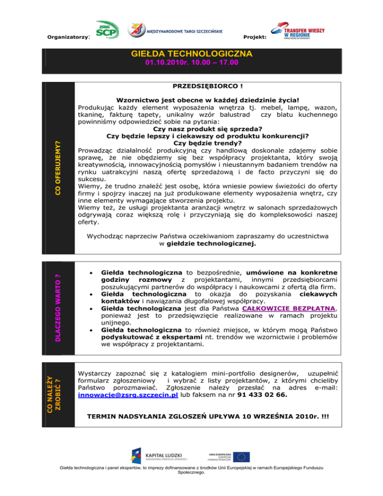Organizatorzy: Projekt: GIEŁDA TECHNOLOGICZNA 01.10.2010r. 10.00 – 17.00 CO OFERUJEMY? PRZEDSIĘBIORCO ! Wzornictwo jest obecne w każdej dziedzinie życia! Produkując każdy element wyposażenia wnętrza tj. mebel, lampę, wazon, tkaninę, fakturę tapety, unikalny wzór balustrad czy blatu kuchennego powinniśmy odpowiedzieć sobie na pytania: Czy nasz produkt się sprzeda? Czy będzie lepszy i ciekawszy od produktu konkurencji? Czy będzie trendy? Prowadząc działalność produkcyjną czy handlową doskonale zdajemy sobie sprawę, że nie obędziemy się bez współpracy projektanta, który swoją kreatywnością, innowacyjnością pomysłów i nieustannym badaniem trendów na rynku uatrakcyjni naszą ofertę sprzedażową i de facto przyczyni się do sukcesu. Wiemy, że trudno znaleźć jest osobę, która wniesie powiew świeżości do oferty firmy i spojrzy inaczej na już produkowane elementy wyposażenia wnętrz, czy inne elementy wymagające stworzenia projektu. Wiemy też, że usługi projektanta aranżacji wnętrz w salonach sprzedażowych odgrywają coraz większą rolę i przyczyniają się do kompleksowości naszej oferty. CO NALEŻY ZROBIĆ ? DLACZEGO WARTO ? Wychodząc naprzeciw Państwa oczekiwaniom zapraszamy do uczestnictwa w giełdzie technologicznej. • • • • Giełda technologiczna to bezpośrednie, umówione na konkretne godziny rozmowy z projektantami, innymi przedsiębiorcami poszukującymi partnerów do współpracy i naukowcami z ofertą dla firm. Giełda technologiczna to okazja do pozyskania ciekawych kontaktów i nawiązania długofalowej współpracy. Giełda technologiczna jest dla Państwa CAŁKOWICIE BEZPŁATNA, ponieważ jest to przedsięwzięcie realizowane w ramach projektu unijnego. Giełda technologiczna to również miejsce, w którym mogą Państwo podyskutować z ekspertami nt. trendów we wzornictwie i problemów we współpracy z projektantami. Wystarczy zapoznać się z katalogiem mini-portfolio designerów, uzupełnić formularz zgłoszeniowy i wybrać z listy projektantów, z którymi chcieliby Państwo porozmawiać. Zgłoszenie należy przesłać na adres e-mail: [email protected] lub faksem na nr 91 433 02 66. TERMIN NADSYŁANIA ZGLOSZEŃ UPŁYWA 10 WRZEŚNIA 2010r. !!! Giełda technologiczna i panel ekspertów, to imprezy dofinansowane z środków Unii Europejskiej w ramach Europejskiego Funduszu Społecznego. GDZIE SZUKAĆ INFORMACJI ? ZASADY UCZESTNICTWA NASZ PLAN DZIAŁAŃ Organizatorzy: Projekt: Po 10 września to my przedstawimy Państwu zgłoszenia pozostałych przedsiębiorców i naukowców i do 20 września damy czas na dokonanie wyboru, z kim chcieliby Państwo porozmawiać. Potem wystarczy już tylko czekać na indywidualny harmonogram rozmów, który otrzymają Państwo najpóźniej 27 września i samą imprezę w dn. 1 października, podczas której zaoferujemy Państwu bezpłatne możliwości nawiązania kontaktów gospodarczych, zapoznanie się z ofertą designerów i udział w panelu dyskusyjnym. 1. Uczestnik giełdy/przedsiębiorca zobowiązany jest do uzupełnienia formularza zgłoszeniowego i wybrania partnerów do rozmów podczas giełdy technologicznej. 2. Złożenie formularza zgłoszeniowego i dobór partnerów do rozmów są równoznaczne z rejestracją uczestnika giełdy. 3. Organizator zobowiązuje się do przygotowania indywidualnego harmonogramu rozmów i zapewnienia odpowiednich warunków do ich odbycia podczas targów „Wszystko dla domu” w dniu 1 października 2010r. w godz. 10.00 -17.00. 4. Organizator zapewni niezbędne materiały tj. katalog uczestników targów i giełdy, harmonogram indywidualnych rozmów i poczęstunek. 5. W przypadku zaistnienia okoliczności, które nie pozwolą uczestnikowi stawić się na poszczególne spotkania kooperacyjne, uczestnik zobowiązuje się do zapewnienia zastępstwa innej osoby, która może poprowadzić rozmowy, a w sytuacji gdy nie będzie to możliwe poinformuje o zaistniałej sytuacji najpóźniej na 3 dni przed imprezą. 6. Organizator dołoży wszelkich starań, aby zaplanowane rozmowy kooperacyjne odbyły się zgodnie z harmonogramem, ale nie może ponosić odpowiedzialności za niesygnalizowaną wcześniej nieobecność innych uczestników giełdy 7. Uczestnik giełdy stawi się w miejscu organizacji giełdy, to jest przy ul. Struga 6-8 (hale targowe MTS) najpóźniej na 10 min. przed pierwszą planowaną rozmową kooperacyjną. Więcej informacji na stronie Zachodniopomorskiego Stowarzyszenia Rozwoju Gospodarczego - SCP www.zsrg.szczecin.pl – organizatora giełdy i Międzynarodowych Targów Szczecińskich www.mts.pl – organizatora targów „Wszystko dla domu” 01-03.10.2010r. W przypadku dodatkowych pytań prosimy o kontakt z Panią Katarzyną Męcińską z ZSRG-SCP tel: 91 433 02 20 lub e-mail: [email protected] Giełda technologiczna i panel ekspertów, to imprezy dofinansowane z środków Unii Europejskiej w ramach Europejskiego Funduszu Społecznego.