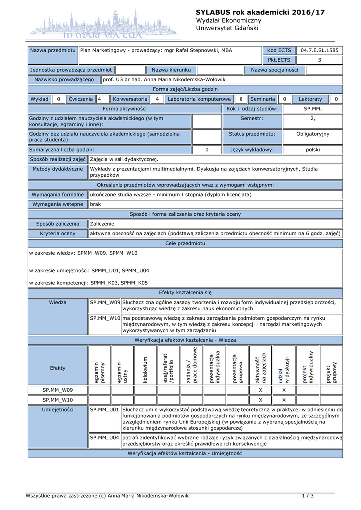 SYLABUS rok akademicki 2016/17 Wydział Ekonomiczny Uniwersytet Gdański Nazwa przedmiotu Plan Marketingowy - prowadzący: mgr Rafał Stepnowski, MBA Jednostka prowadząca przedmiot Nazwisko prowadzącego Nazwa kierunku Kod ECTS 04.7.E.SL.1585 Pkt.ECTS 3 Nazwa specjalności prof. UG dr hab. Anna Maria Nikodemska-Wołowik Forma zajęć/Liczba godzin Wykład 0 Ćwiczenia 4 Konwersatoria 4 Laboratoria komputerowe Forma aktywności 0 Sumaryczna liczba godzin: 0 0 Lektoraty Rok i rodzaj studiów: SP.MM, Semestr: 2, Status przedmiotu: Obligatoryjny Język wykładowy: polski Godziny z udziałem nauczyciela akademickiego (w tym konsultacje, egzaminy i inne): Godziny bez udziału nauczyciela akademickiego (samodzielna praca studenta): Seminaria 0 Sposób realizacji zajęć Zajęcia w sali dydaktycznej. Metody dydaktyczne Wykłady z prezentacjami multimedialnymi, Dyskusja na zajęciach konwersatoryjnych, Studia przypadków, Określenie przedmiotów wprowadzających wraz z wymogami wstępnymi Wymagania formalne ukończone studia wyższe - minimum I stopnia (dyplom licencjata) Wymagania wstepne brak Sposób i forma zaliczenia oraz kryteria oceny Sposób zaliczenia Kryteria oceny Zaliczenie aktywna obecność na zajęciach (podstawą zaliczenia przedmiotu obecność minimum na 6 godz. zajęć) Cele przedmiotu w zakresie wiedzy: SPMM_W09, SPMM_W10 w zakresie umiejętności: SPMM_U01, SPMM_U04 w zakresie kompetencji: SPMM_K03, SPMM_K05 Efekty kształcenia się Wiedza SP.MM_W09 Słuchacz zna ogólne zasady tworzenia i rozwoju form indywidualnej przedsiębiorczości, wykorzystując wiedzę z zakresu nauk ekonomicznych SP.MM_W10 ma podstawową wiedzę z zakresu zarządzania podmiotem gospodarczym na rynku międzynarodowym, w tym wiedzę z zakresu koncepcji i narzędzi marketingowych wykorzystywanych w tym zarządzaniu Weryfikacja efektów kształcenia - Wiedza Efekty SP.MM_W09 X X SP.MM_W10 X X Umiejętności SP.MM_U01 Słuchacz umie wykorzystać podstawową wiedzę teoretyczną w praktyce, w odniesieniu do funkcjonowania podmiotów gospodarczych na rynku międzynarodowym, ze szczególnym uwzględnieniem rynku Unii Europejskiej (w powiązaniu z wybraną specjalnością na kierunku międzynarodowe stosunki gospodarcze) SP.MM_U04 potrafi zidentyfikować wybrane rodzaje ryzyk związanych z działalnością międzynarodową przedsiębiorstw oraz określić prawidłowo ich konsekwencje Weryfikacja efektów kształcenia - Umiejętności Wszystkie prawa zastrzeżone (c) Anna Maria Nikodemska-Wołowik 1/3 SYLABUS rok akademicki 2016/17 Wydział Ekonomiczny Uniwersytet Gdański Efekty SP.MM_U01 X X SP.MM_U04 X X Kompetencje SP.MM_K03 prawidłowo identyfikuje i rozstrzyga dylematy związane z wykonywaniem zawodu SP.MM_K05 potrafi myśleć i działać w sposób przedsiębiorczy Weryfikacja efektów kształcenia - Kompetencje Efekty SP.MM_K03 X X SP.MM_K05 X X Treści programowe 1.Strategia a planowanie 2. Struktura planu 3. Ryzyka w planowaniu 4. Business plan a marketing plan 4. Strategiczne planowan ie marketingowe 5. Koncepcja planu marketingowego 6. Struktura planu 7. Przeszkody w skutecznym planowaniu 8. Mapy planowania 9. Pespektywa finansowa 10. Pespektywa klienta 11. Perspektywa procesów wewnętrznych Wykaz literatury podstawowej i uzupełniającej 1. Gerry Johnson, Kevan Scholes, Richard Whittington, Exploring Corporate Strategy, Prentice Hall, 2007 2. Jean Jacques Lambin, Strategiczne zarządzanie marketingowe, PWN, Warszawa, 2001. 3. Marian Burk Wood, Plan marketingowy, PWE Warszawa 2007 4. Philip Kotler, John A. Caslione Chaos MT Biznes 2009 Wszystkie prawa zastrzeżone (c) Anna Maria Nikodemska-Wołowik 2/3 SYLABUS rok akademicki 2016/17 Wydział Ekonomiczny Uniwersytet Gdański Kontakt [email protected](preferowany) Wszystkie prawa zastrzeżone (c) Anna Maria Nikodemska-Wołowik [email protected], 3/3