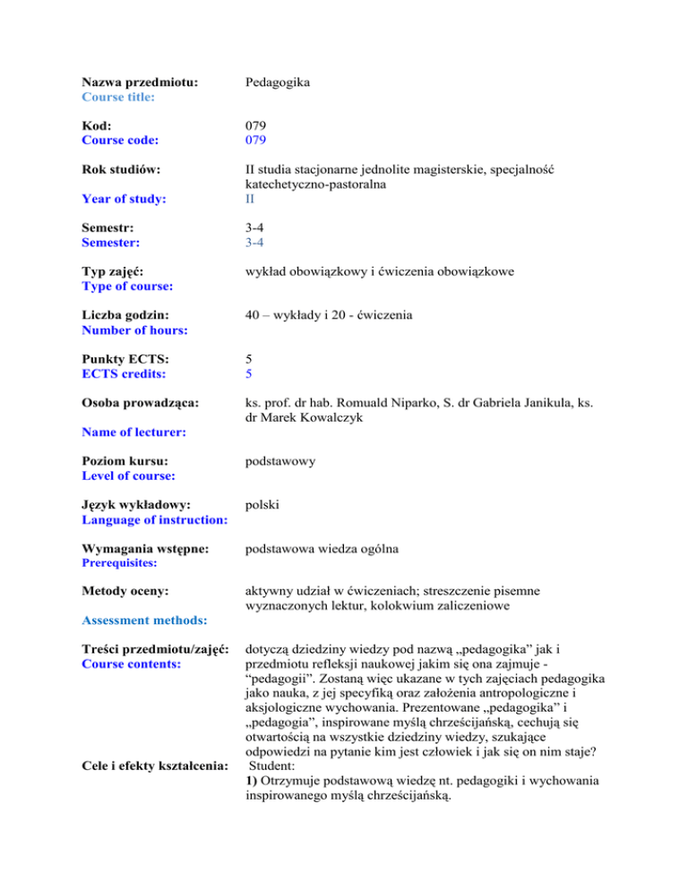 Nazwa przedmiotu: Pedagogika Course title: Kod: 079 Course code