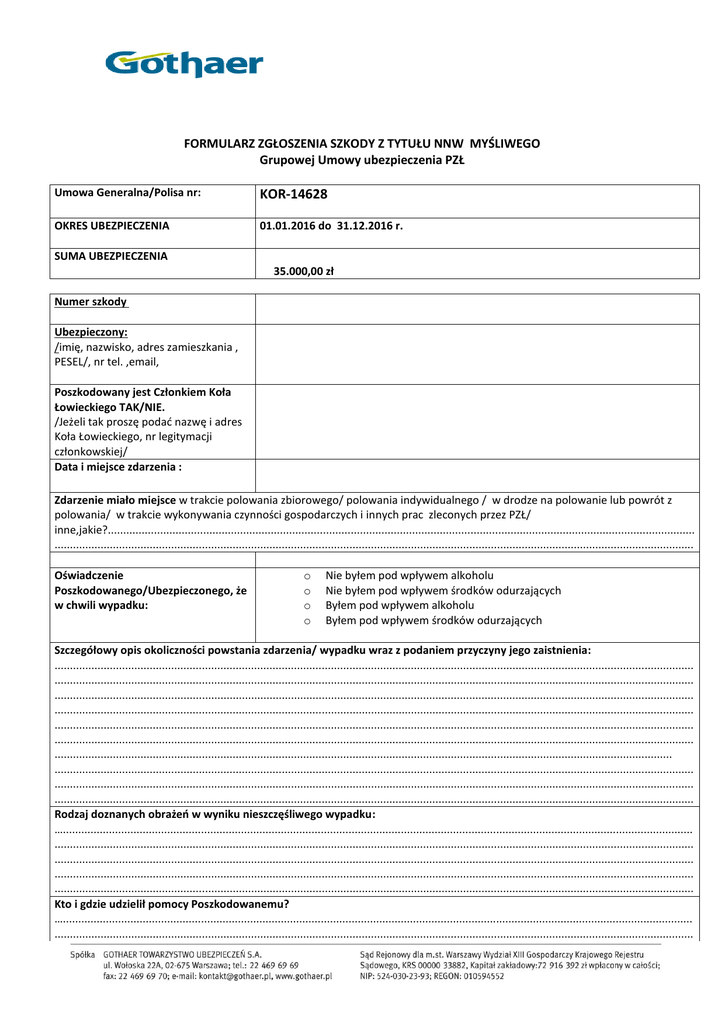 FORMULARZ ZGŁOSZENIA SZKODY Z TYTUŁU NNW MYŚLIWEGO Grupowej Umowy ubezpieczenia PZŁ Umowa Generalna/Polisa nr: KOR-14628 OKRES UBEZPIECZENIA 01.01.2016 do 31.12.2016 r. SUMA UBEZPIECZENIA 35.000,00 zł Numer szkody Ubezpieczony: /imię, nazwisko, adres zamieszkania , PESEL/, nr tel. ,email, Poszkodowany jest Członkiem Koła Łowieckiego TAK/NIE. /Jeżeli tak proszę podać nazwę i adres Koła Łowieckiego, nr legitymacji członkowskiej/ Data i miejsce zdarzenia : Zdarzenie miało miejsce w trakcie polowania zbiorowego/ polowania indywidualnego / w drodze na polowanie lub powrót z polowania/ w trakcie wykonywania czynności gospodarczych i innych prac zleconych przez PZŁ/ inne,jakie?............................................................................................................................................................................................... ................................................................................................................................................................................................................ Oświadczenie Poszkodowanego/Ubezpieczonego, że w chwili wypadku: o o o o Nie byłem pod wpływem alkoholu Nie byłem pod wpływem środków odurzających Byłem pod wpływem alkoholu Byłem pod wpływem środków odurzających Szczegółowy opis okoliczności powstania zdarzenia/ wypadku wraz z podaniem przyczyny jego zaistnienia: ................................................................................................................................................................................................................ ................................................................................................................................................................................................................ ................................................................................................................................................................................................................ ................................................................................................................................................................................................................ ................................................................................................................................................................................................................ ................................................................................................................................................................................................................ ......................................................................................................................................................................................................... ................................................................................................................................................................................................................ ................................................................................................................................................................................................................ ................................................................................................................................................................................................................ Rodzaj doznanych obrażeń w wyniku nieszczęśliwego wypadku: …............................................................................................................................................................................................................. ................................................................................................................................................................................................................ ................................................................................................................................................................................................................ ................................................................................................................................................................................................................ ................................................................................................................................................................................................................ Kto i gdzie udzielił pomocy Poszkodowanemu? …............................................................................................................................................................................................................. ................................................................................................................................................................................................................ Adres zakładu leczniczego, w którym poszkodowany leczył się po wypadku:.……………………………………………………………………………………………………………………………………………………………………………………… ………………………………………………………………………………………………………………………………………………………………………………………………………… ……………………………………………………………………………………………………………………………………………………………………………………………………….. Czy o zaistniałym zdarzeniu powiadomiono Policję, Prokuraturę, Pogotowie Ratunkowe lub inne służby proszę o podanie nazwy, adresu oraz daty zgłoszenia/ Świadkowie