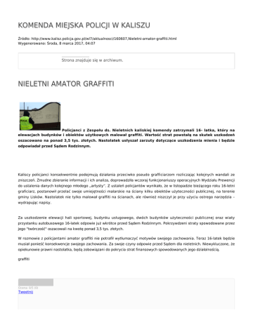 KOMENDA MIEJSKA POLICJI W KALISZU Źródło: http://www.kalisz.policja.gov.pl/wl7/aktualnosci/160607,Nieletni-amator-graffiti.html Wygenerowano: Środa, 8 marca 2017, 04:07 Strona znajduje się w archiwum. NIELETNI AMATOR GRAFFITI Policjanci z Zespołu ds. Nieletnich kaliskiej komendy zatrzymali 16- latka, który na elewacjach budynków i obiektów użytkowych malował graffiti. Wartość strat powstałą na skutek uszkodzeń oszacowano na ponad 3,5 tys. złotych. Nastolatek usłyszał zarzuty dotyczące uszkodzenia mienia i będzie odpowiadał przed Sądem Rodzinnym. Kaliscy policjanci konsekwentnie podejmują działania przeciwko pseudo grafficiarzom rozliczając kolejnych wandali ze zniszczeń. Żmudne zbieranie informacji i ich analiza, doprowadziła wczoraj funkcjonariuszy operacyjnych Wydziału Prewencji do ustalenia danych kolejnego młodego „artysty”. Z ustaleń policjantów wynikało, że w listopadzie bieżącego roku 16-letni graficiarz, postanowił przelać swoje umiejętności malarskie na ściany kilku obiektów użyteczności publicznej, na terenie gminy Lisków. Nastolatek nie tylko malował graffiti na ścianach, ale również niszczył je przy użyciu ostrego narzędzia – wydrapując napisy. Za uszkodzenie elewacji hali sportowej, budynku usługowego, dwóch budynków użyteczności publicznej oraz wiaty przystanku autobusowego 16-latek odpowie już wkrótce przed Sądem Rodzinnym. Pokrzywdzeni straty spowodowane przez jego "twórczość" oszacowali na kwotę ponad 3,5 tys. złotych. W rozmowie z policjantami amator graffiti nie potrafił wytłumaczyć motywów swojego zachowania. Teraz 16-latek będzie musiał ponieść konsekwencje swojego zachowania. Za swoje czyny odpowie przed Sądem dla nieletnich. Niewykluczone, że opiekunowie prawni nastolatka, będą zobowiązani do pokrycia strat finansowych spowodowanych jego działalnością. graffiti Ocena: 0/5 (0) Tweetnij