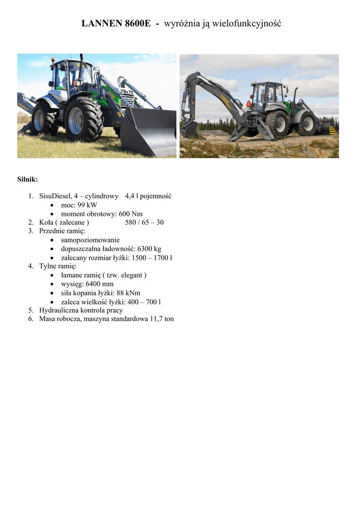 LANNEN 8600E - wyróżnia ją wielofunkcyjność Silnik: 1. SisuDiesel, 4 – cylindrowy 4,4 l pojemność • moc: 99 kW • moment obrotowy: 600 Nm 2. Koła ( zalecane ) 580 / 65 – 30 3. Przednie ramię: • samopoziomowanie • dopuszczalna ładowność: 6300 kg • zalecany rozmiar łyżki: 1500 – 1700 l 4. Tylne ramię: • łamane ramię ( tzw. elegant ) • wysięg: 6400 mm • siła kopania łyżki: 88 kNm • zaleca wielkość łyżki: 400 – 700 l 5. Hydrauliczna kontrola pracy 6. Masa robocza, maszyna standardowa 11,7 ton LANNEN 8800E - mocniejszy wybór: Silnik: 1. SisuDiesel, 4 – cylindrowy 4,9 l pojemność - moc 119 kW - moment obrotowy 700 Nm 2. Koła ( zalecane ) 580 / 65 – 34 3. Przednie ramię: - samopoziomowanie - dopuszczalna ładowność 7900 kg - zalecany rozmiar łyżki 1500 – 1900 l 4. Tylne ramię: - łamane ramię ( tzw. elegant ) - wysięg 6600 mm - siła kopania łyżki 124 kNm - zaleca wielkość łyżki 400 – 700 l 5. Elektroniczna kontrola operacji 6. Masa robocza, maszyna standardowa 12,6 ton