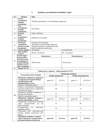 1. Lp. 1 2 3 4 5 6 7 8 9 Element Nazwa przedmiotu/ modułu kształcenia Typ przedmiotu/ modułu kształcenia Instytut Kod przedmiotu/ modułu kształcenia Kierunek, specjalność, poziom i profil kształcenia Forma studiów Rok studiów, semestr Forma zajęć i liczba godzin dydaktycznych wymagających bezpośredniego udziału nauczyciela i studentów Punkty ECTS Sylabusy przedmiotów/modułów zajęć Opis Techniki sprzedażowe w kosmetologii medycznej Do wyboru Nauk o Zdrowiu PPWSZ-K-1-610-KM kierunek: Kosmetologia specjalność: kosmetologia medyczna poziom kształcenia: studia pierwszego profil kształcenia: praktyczny stacjonarne niestacjonarne III rok, VI semestr III , VI semestr Stacjonarne: Niestacjonarne: 30h ćwiczeń 15h ćwiczeń 2 Nakład pracy studenta – bilans punktów ECTS Forma aktywności studenta 10 Obciążenie studenta na zajęciach wymagających bezpośredniego udziału nauczycieli akademickich, w tym: Udział w wykładach (godz.) Udział w ćwiczeniach/ seminariach/ zajęciach praktycznych/ praktykach zawodowych (godz.) Dodatkowe godziny kontaktowe z nauczycielem (godz.) Udział w egzaminie (godz.) Obciążenie studenta związane z nauką samodzielną, w tym: Samodzielne studiowanie tematyki zajęć/ przygotowanie się do ćwiczeń (godz.) Przygotowanie do zaliczenia/ egzaminu (godz.) Wykonanie prac zaliczeniowych (referat, projekt, prezentacja itd.) (godz.) Obciążenie studenta w ramach zajęć związanych z praktycznym przygotowaniem zawodowym Obciążenie studenta Studia stacjonarne Studia niestacjonarne godz.:30 ECTS:1 ECTS:0.5 0 0 30 15 0 0 0 0 godz.:30 godz.:60 godz.:15 ECTS:1 godz.:40 ECTS:1.5 15 20 10 15 5 5 ECTS:2 godz.:55 ECTS:2 11 12 13 14 Suma (obciążenie studenta na zajęciach wymagających bezpośredniego godz.: 60 ECTS: 2 godz.: 55 ECTS: 2 udziału nauczycieli akademickich oraz związane z nauką samodzielną) Nauczyciel akademicki odpowiedzialny Mgr Paulina Mazur-Kurach za przedmiot/ moduł (egzaminujący) Nauczyciele akademiccy Mgr Paulina Mazur-Kurach prowadzący przedmiot/ moduł Wymagania Wiedza ogólna z zakresu marketingu, podstaw zarządzania i ekonomii (kompetencje) wstępne Student poznaje istotę, cele oraz warunki stosowania wybranych metod i technik sprzedaży w sektorze Wellness & Spa. W szczególności omówieniu zostaną poddane zagadnienia dotyczące etyki, elementy komunikacji interpersonalnej oraz techniki Założenia i cele stosowane na poszczególnych etapach procesu zawierania transakcji. Głównym celem przedmiotu zajęć jest zaprezentowanie słuchaczom etapów profesjonalnego modelu rozmowy biznesowej wraz z praktycznym zastosowaniem metod i technik wykorzystywanych w jego trakcie.. Opis efektów kształcenia w zakresie: W1 W2 15 Efekty kształcenia U1 U2 K1 16 Treści kształcenia Odniesienie do kierunkowych efektów kształcenia WIEDZY Ma pogłębioną wiedzę z zakresu zarządzania relacjami z klientem, zna metody i techniki K_W17 sprzedaży, nawiązywania długookresowych relacji oraz obsługi klienta Ma wiedzę z zakresu formułowania narzędzi w zakresie budowania długookresowej K_W17 relacji oraz efektywnej komunikacji z klientem UMIEJĘTNOŚCI Potrafi sformułować elementy profesjonalnej obsługi klienta oraz rozwiązywać problemy K_U23 sprzedażowe ukierunkowane na długookresowe relacje Potrafi przeprowadzić prezentację sprzedażową i handlową oraz dokonać oceny K_U23 wartości dla klienta KOMPETENCJI SPOŁECZNYCH Uczestniczy w pracach zespołu K_K04 projektowego, pełniąc w nim różne role Odniesienie do efektów kształcenia dla obszaru M1_W12 M1_W12 M1_U08 M1_U1 M1_K04 K2 1. Pojęcie i zakres sprzedaży osobistej jako metody komunikacji 2. Komunikacja interpersonalna w procesie sprzedaży usług kosmetologii medycznej 3. Pierwszy kontakt z klientem (pacjentem). 4. Rozpoznawanie potrzeb klientów 5. Znaczenie komunikacji niewerbalnej w rozmowie. 6. Pokonywanie oporów klienta i finalizowanie transakcji 7. Rozpoznawanie różnych typów klientów 8. Podstawowe techniki negocjacyjne 17 Stosowane metody dydaktyczne Metody weryfikacji efektów 18 kształcenia (w odniesieniu do poszczególnych efektów) Kryteria oceny osiągniętych 19 efektów kształcenia Forma i warunki zaliczenia przedmiotu/ modułu, w tym 20 zasady dopuszczenia do egzaminu / zaliczenia z oceną 21 22 23 Wykaz literatury podstawowej Wykaz literatury uzupełniającej Wymiar, zasady i forma odbywania praktyk zawodowych ćwiczenia, metoda sytuacyjna, metoda przypadku , praca w grupach. Sposób weryfikacji efektów kształcenia np. egzamin ustny, egzamin Efekt pisemny, zaliczenie ustne, kolokwium, projekt, referat, prezentacja, kształcenia sprawozdanie, dyskusje, obserwacja w czasie zajęć itd. W1 kolokwium W2 kolokwium U1 Prezentacja ustna na zajęciach U2 Prezentacja ustna K1 Obserwacja na zajęciach Test wiadomości: 51-60% dst; 61-70% +dst; 71-80% db; 81-90% +db; 91-100% bdb Ocena z ćwiczeń składa się z następujących części: 2 kolokwia, wykonanie projektu, aktywność na zajęciach oraz obecność. Uzyskanie pozytywnej oceny z ćwiczeń jest podstawą podejścia do testu zaliczeniowego. 1. Futrell Ch., Nowoczesne techniki sprzedaży: metody prezentacji, profesjonalna obsługa, relacje z klientami, Oficyna Ekonomiczna, Kraków 2004. 2. Zatwarnicka-Madura B., Techniki sprzedaży osobistej, CeDeWu, Warszawa 2004. 3. Nierenberg B., Komunikacja rynkowa: techniki sprzedaży, Wydawnictwo Instytut Śląski, Opole 2005. 1. Gałązka J., Mapa sprzedawcy czyli techniki sprzedaży w sklepie, Poltext, Warszawa 2006. 2. Moulinier R., Techniki sprzedaży, PWE, Warszawa 2007. 3. Tracy B., Skuteczne metody sprzedaży, Muza, Warszawa 2000. Brak