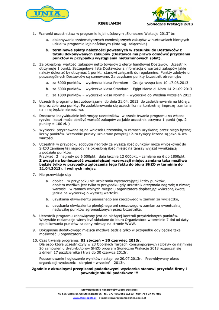 REGULAMIN Słoneczne Wakacje 2013 1. Warunki uczestnictwa w programie lojalnościowym „Słoneczne Wakacje 2013” to: a. dokonywanie systematycznych comiesięcznych zakupów w hurtowniach biorących udział w programie lojalnościowym (lista wg. załącznika) b. terminowe spłaty należności powstałych w stosunku do Dostawców z tytułu dokonywanych zakupów (Dostawca ma prawo odmówić przyznania punktów w przypadku wystąpienia nieterminowych spłat). 2. Za określoną wartość zakupów netto towarów z oferty handlowej Dostawcy, Uczestnik otrzymuje 1 punkt. Szczegółowa lista Dostawców z informacją o wartości zakupów jakie należy dokonać by otrzymać 1 punkt. stanowi załącznik do regulaminu. Punkty zdobyte u poszczególnych Dostawców są sumowane. Za uzyskane punkty Uczestnik otrzymuje: a. za 6000 punktów – wycieczka klasa Premium – Grecja wyspa Kos 10-17.08.2013 b. za 5000 punktów – wycieczka klasa Standard – Egipt Marsa el Alam 14-21.09.2013 c. za 1800 punktów – wycieczka klasa Normal – wycieczka do Wiednia wrzesień 2013 3. Uczestnik programu jest zobowiązany do dnia 21.04. 2013 do zadeklarowania na którą z imprez zbierana punkty. Po zadeklarowaniu się uczestnika na konkretną imprezę zamiana na inną będzie niemożliwa. 4. Dostawca indywidualnie informując uczestników w czasie trwania programu na własne ryzyko i koszt może obniżyć wartość zakupów za jakie uczestnik otrzyma 1 punkt (np. 2 punkty = 100 zł. ) 5. Wycieczki przyznawane są na wniosek Uczestnika, w ramach uzyskanej przez niego łącznej liczby punktów. Wszystkie punkty uzbierane powyżej 12-tu tysięcy liczone są jako ¼ ich wartości. 6. Uczestnik w przypadku zdobycia nagrody za wyższą ilość punktów może wnioskować do SHZO zamianę tej nagrody na określoną ilość miejsc na tańszy wyjazd wynikającą z podziału punktów. Przykład: 2 nagrody po 6 000pkt. dają łącznie 12 000pkt. - zamiana na 6 po 1800pkt. Z uwagi na konieczność wcześniejszej rezerwacji miejsc zamiana taka możliwa będzie tylko w przypadku zgłoszenia tego faktu do biura SHZO w terminie do 21.04.2013r. i wolnych miejsc. 7. Nie przewiduje się: a. dopłat – w przypadku nie uzbierania wystarczającej liczby punktów, dopłata możliwa jest tylko w przypadku gdy uczestnik otrzymała nagrodę o niższej wartości i w ramach wolnych miejsc u organizatora dopłacając wyliczoną kwotę jedzie na wycieczkę o wyższej wartości. b. uzyskania ekwiwalentu pieniężnego ani rzeczowego w zamian za wycieczkę, c. uzyskania ekwiwalentu pieniężnego ani rzeczowego w zamian za ewentualną nadwyżkę punktów zgromadzonych przez Uczestnika. 8. Uczestnik programu zobowiązany jest do bieżącej kontroli przydzielonych punktów. Wszystkie reklamacje winny być składane do biura Organizatora w terminie 7 dni od daty opublikowania punktów za dany miesiąc na stronie WWW. 9. Dokupienie dodatkowego miejsca możliwe będzie tylko w przypadku gdy będzie taka możliwość u organizatora 10. Czas trwania programu: 01 styczeń – 30 czerwiec 2013r. Dla osób które uczestniczyły w 23 Opolskich Targach Konsumpcyjnych i złożyły co najmniej 20 zamówień u dystrybutorów SHZO program Słoneczne Wakacje 2013 rozpoczął się z dniem 17 października i trwa do 30 czerwca 2013r. Podsumowanie i ogłoszenie wyników nastąpi po 20.07.2013r. organizacji wycieczek: sierpień - wrzesień 2013r. Przewidywany okres Zgodnie z aktualnymi przepisami podatkowymi wycieczka stanowi przychód firmy i powoduje skutki podatkowe !!! Stowarzyszenie Handlowców Ziemi Opolskiej 45-565 Opole ul. Ob.Stalingradu 66 www.shzo.opole.pl tel. 077 4567850 w.113 NIP: 754-27-97-085 e-mail: [email protected]