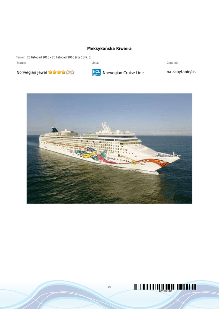 Meksykańska Riwiera Termin: 20 listopad 2016 - 25 listopad 2016 (ilość dni: 6) Statek: Norwegian Jewel Linia: Cena od: Norwegian Cruise Line na zapytanie/os. 1/3 EV:45189 TRASA REJSU Data Port Wpłynięcie Wypłynięcie niedziela 20.11.2016 Los Angeles, Kalifornia --:-- 16:00 dzień 2 poniedziałek 21.11.2016 Dzień na morzu --:-- --:-- dzień 3 wtorek 22.11.2016 Cabo San Lucas 12:00 --:-- środa 23.11.2016 Cabo San Lucas --:-- 14:00 dzień 5 czwartek 24.11.2016 Dzień na morzu --:-- --:-- dzień 6 piątek 25.11.2016 Los Angeles, Kalifornia 08:00 --:-- dzień 1 dzień 4 Legenda Stany Zjednoczone Meksyk Meksyk Stany Zjednoczone CENNIK Cena katalogowa Kabina wewnętrzna od 2 220.80zł Kabina zewnętrzna z oknem od 2 398.82zł Kabina zewnętrzna z balkonem od 3 377.93zł Suite (apartament) od 3 956.49zł Kabina jednoosobowa na zapytanie 3 i 4 osoba dorosła w kabinie na zapytanie dziecko do 17 lat jako 3 i 4 osoba w kabinie na zapytanie Opłaty portowe Cena promocyjna w cenie Uwaga! Ceny za osobę w kabinie dwuosobowej. Cena zawiera: zakwaterowanie w kabinie wybranej kategorii; wyżywienie - 3 główne posiłki, przekąski między posiłkami, bufet lub przekąski o północy; napoje serwowane do śniadania i w bufetach samoobsługowych; serwis bagażowy podczas wejścia i zejścia ze statku; serwis kabinowy; korzystanie ze wszystkich urządzeń sportowo - rekreacyjnych znajdujących się na pokładzie statku (basen, jacuzzi, sala fitness, itp.); udział we wszystkich imprezach organizowanych na statku (przedstawienia w teatrze, koncerty, programy animacyjne itp.). 2/3 EV:45189 Cena nie zawiera: kosztów dojazdu do portu; ewentualnych noclegów w hotelu przed/po rejsie i transferów; wycieczek fakultatywnych w trakcie rejsu; korzystania z barów, mini baru w kabinie oraz napojów zamawianych w restauracji; korzystania z punktów usługowych (fryzjer, pralnia, fotograf, salon piękności i odnowy biologicznej, internet) i wydatków osobistych; napiwków dla obsługi na statku (kwota uzależniona od długości rejsu); ubezpieczenia KL, NNW i bagaż, kosztów wiz (tam gdzie wymagane). 3/3 EV:45189
