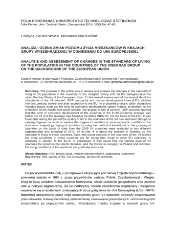 FOLIA POMERANAE UNIVERSITATIS TECHNOLOGIAE STETINENSIS Folia Pomer. Univ. Technol. Stetin., Oeconomica 2015, 323(81)4, 47–60 Grażyna KARMOWSKA, Mirosława MARCINIAK ANALIZA I OCENA ZMIAN POZIOMU ŻYCIA MIESZKAŃCÓW W KRAJACH GRUPY WYSZEHRADZKIEJ W ODNIESIENIU DO UNII EUROPEJSKIEJ ANALYSIS AND ASSESSMENT OF CHANGES IN THE STANDARD OF LIVING OF THE POPULATION IN THE COUNTRIES OF THE VISEGRAD GROUP ON THE BACKGROUND OF THE EUROPEAN UNION Katedra Analizy Systemowej i Finansów, Zachodniopomorski Uniwersytet Technologiczny w Szczecinie, ul. Klemensa Janickiego 31, 71-270 Szczecin, e-mail: [email protected] Summary. The purpose of the article was to assess and analyse the changes in the standard of living of the population in the countries of the Visegrad Group (V4) on the background of the other Member States of the European Union. To the overall assessment of the level of life of the inhabitants of the V4 adopted: GDP per capita and human development index (HDI), divided into two periods: before and after accession to the EU. In a detailed analysis (after accession) includes issues such as: the level of economic development, labour market, investment in the protection of the health and social welfare, the degree of risk of poverty. GDP analysis showed that the level of economic development of the countries of the Eu15 countries average was below the V4 and the average new Member countries (NEU10). On the basis of the HDI, it was found that during the period the quality of life in the countries of the V4 has improved, though to varying degrees. In order to assess the degree of variation in socio-economic conditions, the taxonomic analysis (grouping of countries by using the method of k-medium). In the grouping of countries on the basis of data from the 2005 V4 countries were assigned to two different agglomerates and grouping of 2012, all in one. It is about the process of levelling up the standard of living in these countries. Care and social services in the countries of the V4 makes the living conditions in these countries are far worse than those in other EU countries, in particular in relation to the Eu15. In conclusion, it was found that the highest level of V4 countries life occurs in the Czech Republic, and the lowest in Hungary. In Poland and Slovakia, the living conditions of the residents are gradually improved. Słowa kluczowe: HDI, jakość życia, metody taksonomiczne, zagrożenie ubóstwem. Key words: HDI, quality of life, risk of poverty, taxonomic methods. WSTĘP Grupa Wyszehradzka (V4) – początkowo funkcjonująca pod nazwą Trójkąta Wyszehradzkiego – powołana została w 1991 r. przez przywódców państw: Polski, Czechosłowacji i Węgier. Kraje te łączy podobne doświadczenie historyczne, bliskie położenie geograficzne oraz zbieżne cele w polityce zagranicznej. Za cel nadrzędny obrano zacieśnienie współpracy i wzajemne wspieranie się w działaniach zmierzających do przystąpienia do Unii Europejskiej (UE) i NATO. Natomiast deklarowane przez kraje członkowskie grupy V4 założenia dotyczyły poszanowania praw człowieka, budowy demokracji parlamentarnej, niwelowania gospodarczych i administracyjnych pozostałości po poprzednim ustroju. Współpraca między krajami w ramach grupy V4, 48 G. Karmowska i M. Marciniak zwłaszcza w zakresie integracji regionalnej, nie układała się zbyt dobrze na skutek odmiennych priorytetów poszczególnych państw, dążących przede wszystkim do integracji z UE (szczególnie w przypadku Czech); dopiero spowolnienie europejskich procesów integracyjnych wymusiło zawarcie porozumienia CEFTA (ang. Central European Free Trade Agreement – Środkowoeuropejskie Porozumienie Wolnego Handlu), które przyniosło konkretne efekty gospodarcze. Państwa należące do CEFTA, po przystąpieniu do Unii Europejskiej, przestawały być stronami układu. Ponieważ w roku 2004 oba te cele zostały zrealizowane, wydawać by się mogło, że V4 straciła sens istnienia. Jednak tak się nie stało – wraz z wejściem w życie traktatu lizbońskiego, na mocy którego wiele decyzji jest podejmowanych większością głosów, wzrosło znaczenie sojuszy mogących przeforsować lub zablokować jakąś inicjatywę. Ponieważ państwa grupy V4 przeszły podobną drogę i znajdują się na podobnym poziomie rozwoju, w naturalny sposób w wielu sprawach są sojusznikami. Wytyczne polityki gospodarczej wymagają definiowania jej głównych celów (i środków realizacji). Do najbardziej istotnych należą cele formułowane w kategoriach poziomu i jakości życia. Jednym z podstawowych celów rozwoju regionalnego krajów UE jest stworzenie warunków życia pozwalających na uzyskanie odpowiedniego poziomu życia wszystkim mieszkańcom Wspólnoty. Według A. Kozery i C. Kozery (2011) poziom życia to całokształt rzeczywistych warunków życia ludzi oraz stopień ich materialnego i kulturalnego zaspokojenia ich potrzeb. Przy określaniu jakości życia uwzględnia się ocenę poziomu zadowolenia człowieka ze stopnia zaspokojenia potrzeb. Jakość życia można rozważać nie tylko w aspekcie wartościowym, ale także opisowym, wskazując cechy, jakimi powinna się ona charakteryzować. Jakość życia może być opisana za pomocą wielu cech, jest zatem kategorią złożoną, może określać naturę lub wybrane cechy (Sompolska-Rzechuła 2013). W ekonomicznym ujęciu jakość życia (zwana także warunkami życia) utożsamia jest z poziomem dostępności oraz nasycenia zasobów służących zaspokojeniu potrzeb ludności (jednostek i całych zbiorowości). Celem artykułu jest znalezienie odpowiedzi na pytania: W jakim stopniu i czym różnią się warunki życia mieszkańców w krajach tworzących Grupę Wyszehradzką, w stosunku do pozostałych nowych państw członkowskich UE (NEU10 − krajów, które od 2004 roku są członkami Unii Europejskiej)? Jaki jest dystans pomiędzy nimi a krajami „starej Unii” (UE15)? MATERIAŁ I METODY W prac