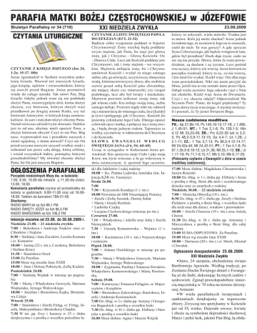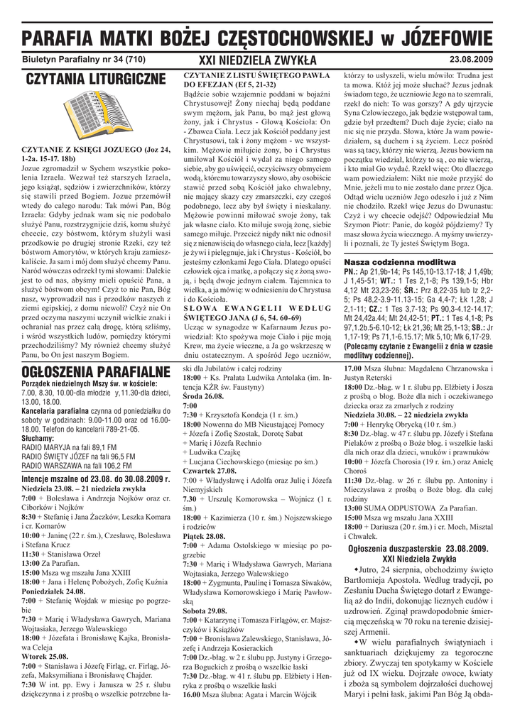 PARAFIA MATKI BOŻEJ CZÊSTOCHOWSKIEJ w JÓZEFOWIE Biuletyn Parafialny nr 34 (710) CZYTANIA LITURGICZNE CZYTANIE Z KSIĘGI JOZUEGO (Joz 24, 1-2a. 15-17. 18b) Jozue zgromadził w Sychem wszystkie pokolenia Izraela. Wezwał też starszych Izraela, jego książąt, sędziów i zwierzchników, którzy się stawili przed Bogiem. Jozue przemówił wtedy do całego narodu: Tak mówi Pan, Bóg Izraela: Gdyby jednak wam się nie podobało służyć Panu, rozstrzygnijcie dziś, komu służyć chcecie, czy bóstwom, którym służyli wasi przodkowie po drugiej stronie Rzeki, czy też bóstwom Amorytów, w których kraju zamieszkaliście. Ja sam i mój dom służyć chcemy Panu. Naród wówczas odrzekł tymi słowami: Dalekie jest to od nas, abyśmy mieli opuścić Pana, a służyć bóstwom obcym! Czyż to nie Pan, Bóg nasz, wyprowadził nas i przodków naszych z ziemi egipskiej, z domu niewoli? Czyż nie On przed oczyma naszymi uczynił wielkie znaki i ochraniał nas przez całą drogę, którą szliśmy, i wśród wszystkich ludów, pomiędzy którymi przechodziliśmy? My również chcemy służyć Panu, bo On jest naszym Bogiem. OG£OSZENIA PARAFIALNE Porz¹dek niedzielnych Mszy œw. w koœciele: 7.00, 8.30, 10.00-dla m³odzie¿y, 11.30-dla dzieci, 13.00, 18.00. Kancelaria parafialna czynna od poniedzia³ku do soboty w godzinach: 9.00-11.00 oraz od 16.0018.00. Telefon do kancelarii 789-21-05. S³uchamy: RADIO MARYJA na fali 89,1 FM RADIO ŒWIÊTY JÓZEF na fali 96,5 FM RADIO WARSZAWA na fali 106,2 FM Intencje mszalne od 23.08. do 30.08.2009 r. Niedziela 23.08. – 21 niedziela zwykła 7:00 + Bolesława i Andrzeja Nojków oraz cr. Ciborków i Nojków 8:30 + Stefanię i Jana Żaczków, Leszka Komara i cr. Komarów 10:00 + Janinę (22 r. śm.), Czesławę, Bolesława i Stefana Krucz 11:30 + Stanisława Orzeł 13:00 Za Parafian. 15:00 Msza wg mszału Jana XXIII 18:00 + Jana i Helenę Pobożych, Zofię Kuźnia Poniedziałek 24.08. 7:00 + Stefanię Wojdak w miesiąc po pogrzebie 7:30 + Marię i Władysława Gawrych, Mariana Wojtasiaka, Jerzego Walewskiego 18:00 + Józefata i Bronisławę Kajka, Bronisława Celeja Wtorek 25.08. 7:00 + Stanisława i Józefę Firląg, cr. Firląg, Józefa, Maksymiliana i Bronisławę Chajder. 7:30 W int. pp. Ewy i Janusza w 25 r. ślubu dziękczynna i z prośbą o wszelkie potrzebne ła- XXI NIEDZIELA ZWYKŁA CZYTANIE Z LISTU ŚWIĘTEGO PAWŁA DO EFEZJAN (Ef 5, 21-32) Bądźcie sobie wzajemnie poddani w bojaźni Chrystusowej! Żony niechaj będą poddane swym mężom, jak Panu, bo mąż jest głową żony, jak i Chrystus - Głową Kościoła: On - Zbawca Ciała. Lecz jak Kościół poddany jest Chrystusowi, tak i żony mężom - we wszystkim. Mężowie miłujcie żony, bo i Chrystus umiłował Kościół i wydał za niego samego siebie, aby go uświęcić, oczyściwszy obmyciem wodą, któremu towarzyszy słowo, aby osobiście stawić przed sobą Kościół jako chwalebny, nie mający skazy czy zmarszczki, czy czegoś podobnego, lecz aby był święty i nieskalany. Mężowie powinni miłować swoje żony, tak jak własne ciało. Kto miłuje swoją żonę, siebie samego miłuje. Przecież nigdy nikt nie odnosił się z nienawiścią do własnego ciała, lecz [każdy] je żywi i pielęgnuje, jak i Chrystus - Kościół, bo jesteśmy członkami Jego Ciała. Dlatego opuści człowiek ojca i matkę, a połączy się z żoną swoją, i będą dwoje jednym ciałem. Tajemnica to wielka, a ja mówię: w odniesieniu do Chrystusa i do Kościoła. S Ł O WA E WA N G E L I I W E D Ł U G ŚWIĘTEGO JANA (J 6, 54. 60-69) Ucząc w synagodze w Kafarnaum Jezus powiedział: Kto spożywa moje Ciało i pije moją Krew, ma życie wieczne, a Ja go wskrzeszę w dniu ostatecznym. A spośród Jego uczniów, ski dla Jubilatów i całej rodziny 18:00 + Ks. Prałata Ludwika Antolaka (im. Intencja KŻR św. Faustyny) Środa 26.08. 7:00 7:30 + Krzysztofa Kondeja (1 r. śm.) 18:00 Nowenna do MB Nieustającej Pomocy + Józefa i Zofię Szostak, Dorotę Sabat + Marię i Józefa Rechnio + Ludwika Czajkę + Lucjana Ciechowskiego (miesiąc po śm.) Czwartek 27.08. 7:00 + Władysławę i Adolfa oraz Julię i Józefa Niemyjskich 7.30 + Urszulę Komorowska – Wojnicz (1 r. śm.) 18:00 + Kazimierza (10 r. śm.) Nojszewskiego i rodziców Piątek 28.08. 7:00 + Adama Ostolskiego w miesiąc po pogrzebie 7:30 + Marię i Władysława Gawrych, Mariana Wojtasiaka, Jerzego Walewskiego 18:00 + Zygmunta, Paulinę i Tomasza Siwaków, Władysława Komorowskiego i Marię Pawłowską Sobota 29.08. 7:00 + Katarzynę i Tomasza Firlągów, cr. Majszczyków i Książków 7:00 + Bronisława Zalewskiego, Stanisława, Józefę i Andrzeja Kosierackich 7:00 Dz.-błag. w 2 r. ślubu pp. Justyny i Grzegorza Boguckich z prośbą o wszelkie łaski 7:30 Dz.-błag. w 41 r. ślubu pp. Elżbiety i Henryka z prośbą o wszelkie łaski 16.00 Msza ślubna: Agata i Marcin Wójcik 23.08.2009 którzy to usłyszeli, wielu mówiło: Trudna jest ta mowa. Któż jej może słuchać? Jezus jednak świadom tego, że uczniowie Jego na to szemrali, rzekł do nich: To was gorszy? A gdy ujrzycie Syna Człowieczego, jak będzie wstępował tam, gdzie był przedtem? Duch daje życie; ciało na nic się nie przyda. Słowa, które Ja wam powiedziałem, są duchem i są życiem. Lecz pośród was są tacy, którzy nie wierzą. Jezus bowiem na początku wiedział, którzy to są , co nie wierzą, i kto miał Go wydać. Rzekł więc: Oto dlaczego wam powiedziałem: Nikt nie może przyjść do Mnie, jeżeli mu to nie zostało dane przez Ojca. Odtąd wielu uczniów Jego odeszło i już z Nim nie chodziło. Rzekł więc Jezus do Dwunastu: Czyż i wy chcecie odejść? Odpowiedział Mu Szymon Piotr: Panie, do kogóż pójdziemy? Ty masz słowa życia wiecznego. A myśmy uwierzyli i poznali, że Ty jesteś Świętym Boga. Nasza codzienna modlitwa PN.: Ap 21,9b-14; Ps 145,10-13.17-18; J 1,49b; J 1,45-51; WT.: 1 Tes 2,1-8; Ps 139,1-5; Hbr 4,12 Mt 23,23-26; ŚR.: Prz 8,22