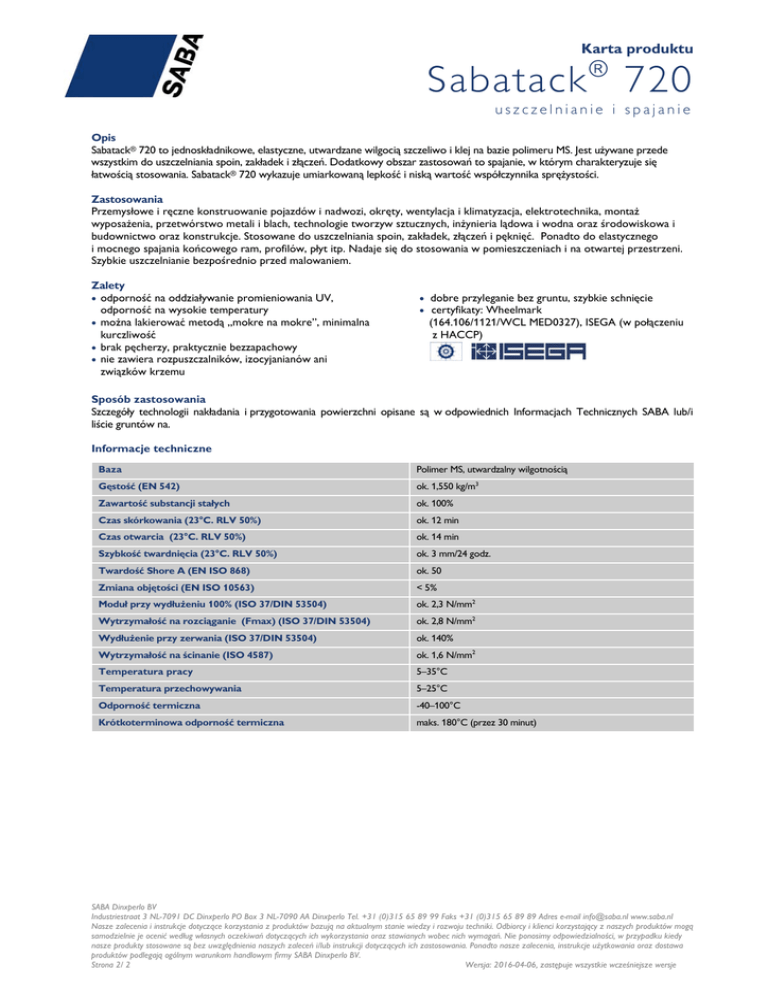 Karta produktu Sabatack ® 720 uszczelnianie i spajanie Opis Sabatack® 720 to jednoskładnikowe, elastyczne, utwardzane wilgocią szczeliwo i klej na bazie polimeru MS. Jest używane przede wszystkim do uszczelniania spoin, zakładek i złączeń. Dodatkowy obszar zastosowań to spajanie, w którym charakteryzuje się łatwością stosowania. Sabatack® 720 wykazuje umiarkowaną lepkość i niską wartość współczynnika sprężystości. Zastosowania Przemysłowe i ręczne konstruowanie pojazdów i nadwozi, okręty, wentylacja i klimatyzacja, elektrotechnika, montaż wyposażenia, przetwórstwo metali i blach, technologie tworzyw sztucznych, inżynieria lądowa i wodna oraz środowiskowa i budownictwo oraz konstrukcje. Stosowane do uszczelniania spoin, zakładek, złączeń i pęknięć. Ponadto do elastycznego i mocnego spajania końcowego ram, profilów, płyt itp. Nadaje się do stosowania w pomieszczeniach i na otwartej przestrzeni. Szybkie uszczelnianie bezpośrednio przed malowaniem. Zalety odporność na oddziaływanie promieniowania UV, odporność na wysokie temperatury można lakierować metodą „mokre na mokre”, minimalna kurczliwość brak pęcherzy, praktycznie bezzapachowy nie zawiera rozpuszczalników, izocyjanianów ani związków krzemu dobre przyleganie bez gruntu, szybkie schnięcie certyfikaty: Wheelmark (164.106/1121/WCL MED0327), ISEGA (w połączeniu z HACCP) Sposób zastosowania Szczegóły technologii nakładania i przygotowania powierzchni opisane są w odpowiednich Informacjach Technicznych SABA lub/i liście gruntów na. Informacje techniczne Baza Polimer MS, utwardzalny wilgotnością Gęstość (EN 542) ok. 1,550 kg/m3 Zawartość substancji stałych ok. 100% Czas skórkowania (23°C. RLV 50%) ok. 12 min Czas otwarcia (23°C. RLV 50%) ok. 14 min Szybkość twardnięcia (23°C. RLV 50%) ok. 3 mm/24 godz. Twardość Shore A (EN ISO 868) ok. 50 Zmiana objętości (EN ISO 10563) < 5% Moduł przy wydłużeniu 100% (ISO 37/DIN 53504) ok. 2,3 N/mm2 Wytrzymałość na rozciąganie (Fmax) (ISO 37/DIN 53504) ok. 2,8 N/mm2 Wydłużenie przy zerwania (ISO 37/DIN 53504) ok. 140% Wytrzymałość na ścinanie (ISO 4587) ok. 1,6 N/mm2 Temperatura pracy 5–35°C Temperatura przechowywania 5–25°C Odporność termiczna -40–100°C Krótkoterminowa odporność termiczna maks. 180°C (przez 30 minut) SABA Dinxperlo BV Industriestraat 3 NL-7091 DC Dinxperlo PO Box 3 NL-7090 AA Dinxperlo Tel. +31 (0)315 65 89 99 Faks +31 (0)315 65 89 89 Adres e-mail [email protected] www.saba.nl Nasze zalecenia i instrukcje dotyczące korzystania z produktów bazują na aktualnym stanie wiedzy i rozwoju techniki. Odbiorcy i klienci korzystający z naszych produktów mogą samodzielnie je ocenić według własnych oczekiwań dotyczących ich wykorzystania oraz stawianych wobec nich wymagań. Nie ponosimy odpowiedzialności, w przypadku kiedy nasze produkty stosowane są bez uwzględnienia naszych zaleceń i/lub instrukcji dotyczących ich zastosowania. Ponadto nasze zalecenia, instrukcje użytkowania oraz dostawa produktów podlegają ogólnym warunkom handlowym firmy SABA Dinxperlo BV. Strona 2/ 2 Wersja: 2016-04-06, zastępuje wszystkie wcześniejsze wersje Karta produktu Sabatack ® 720 uszczelnianie i spajanie Informacje do zamówień Pakowanie kartusz rękaw foliowy Zawartość 290 ml (24 szt./pudełko) 600 ml (15 szt./pudełko) Kolor biały (zbliżony do RAL 9003) szary (zbliżony do RAL 7004) czarny (zbliżony do RAL 9011) szary (zbliżony do RAL 7004) biały (zbliżony do RAL 9003) czarny (zbliżony do RAL 9011) brązowy (zbliżony do RAL 8015) Nr artykułu 100990 ACC 101004 ACC 101005 ACC 101004 AAN 100990 AAN 101005 AAN 101020 AAN Okres przechowywania 18 mies. (w opakowaniu fabrycznie zamkniętym) 15 mies. (w opakowaniu fabrycznie zamkniętym) Inne opakowania lub kolory są dostępne na zamówienie. Okres przechowywania może być zmieniony dla innych opakowań. Zalecenia dotyczące bezpieczeństwa Więcej informacji dotyczących bezpieczeństwa zawiera Karta Bezpieczeństwa, do otrzymania na zapytanie. SABA Dinxperlo BV Industriestraat 3 NL-7091 DC Dinxperlo PO Box 3 NL-7090 AA Dinxperlo Tel. +31 (0)315 65 89 99 Faks +31 (0)315 65 89 89 Adres e-mail [email protected] www.saba.nl Nasze zalecenia i instrukcje dotyczące korzystania z produktów bazują na aktualnym stanie wiedzy i rozwoju techniki. Odbiorcy i klienci korzystający z naszych produktów mogą samodzielnie je ocenić według własnych oczekiwań dotyczących ich wykorzystania oraz stawianych wobec nich wymagań. Nie ponosimy odpowiedzialności, w przypadku kiedy nasze produkty stosowane są bez uwzględnienia naszych zaleceń i/lub instrukcji dotyczących ich zastosowania. Ponadto nasze zalecenia, instrukcje użytkowania oraz dostawa produktów podlegają ogólnym warunkom handlowym firmy SABA Dinxperlo BV. Strona 2/ 2 Wersja: 2016-04-06, zastępuje wszystkie wcześniejsze wersje