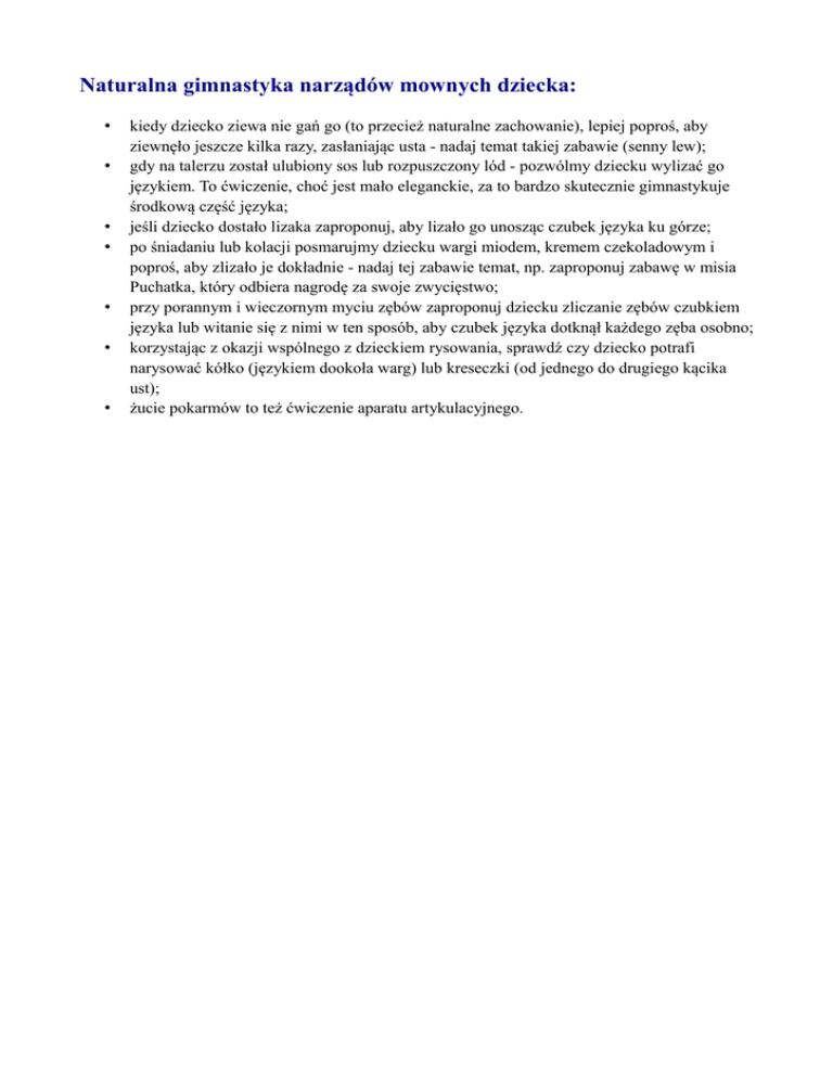 Naturalna gimnastyka narządów mownych dziecka: • • • • • • • kiedy dziecko ziewa nie gań go (to przecież naturalne zachowanie), lepiej poproś, aby ziewnęło jeszcze kilka razy, zasłaniając usta - nadaj temat takiej zabawie (senny lew); gdy na talerzu został ulubiony sos lub rozpuszczony lód - pozwólmy dziecku wylizać go językiem. To ćwiczenie, choć jest mało eleganckie, za to bardzo skutecznie gimnastykuje środkową część języka; jeśli dziecko dostało lizaka zaproponuj, aby lizało go unosząc czubek języka ku górze; po śniadaniu lub kolacji posmarujmy dziecku wargi miodem, kremem czekoladowym i poproś, aby zlizało je dokładnie - nadaj tej zabawie temat, np. zaproponuj zabawę w misia Puchatka, który odbiera nagrodę za swoje zwycięstwo; przy porannym i wieczornym myciu zębów zaproponuj dziecku zliczanie zębów czubkiem języka lub witanie się z nimi w ten sposób, aby czubek języka dotknął każdego zęba osobno; korzystając z okazji wspólnego z dzieckiem rysowania, sprawdź czy dziecko potrafi narysować kółko (językiem dookoła warg) lub kreseczki (od jednego do drugiego kącika ust); żucie pokarmów to też ćwiczenie aparatu artykulacyjnego.