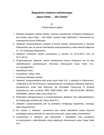 Regulamin badania ankietowego „Aqua Hotel … dla Ciebie” §1 Postanowienia ogólne 1. Niniejszy regulamin określa zasady i warunki uczestnictwa w Badaniu Ankietowym, pod nazwą „Aqua Hotel … dla Ciebie” zwanym dalej „Badaniem" i kierowanym do mieszkańców Gminy Polkowice. 2. „Badanie" przeprowadzone zostanie w formie ankiety, zamieszczonej w Gazecie Polkowickiej oraz na stronie internetowej www.aquahotel.pl, która stanowi załącznik nr 1 do niniejszego Regulaminu, 3. „Badanie” ankietowe będzie prowadzone w okresie od 03.10.2013 roku do 30.11.2013r., 4. Przeprowadzone „Badanie” wśród mieszkańców Gminy Polkowice ma na celu zweryfikowanie podstawowych informacji dotyczących Aqua Hotel S.A., a w szczególności : identyfikacji marki, korzystania z usług i ofert, propozycji dalszego rozwoju. 5. „Badanie” przeprowadzane jest przez Aqua Hotel S.A. z siedzibą w Polkowicach, ul Młyńska 6, 59-100 Polkowice, zarejestrowanym w Krajowym Rejestrze Sądowym prowadzonym przez Sąd Rejonowy dla Wrocławia Fabrycznej IX Wydział Gospodarczy, pod numerem KRS: 0000123402, NIP: 692-22-42-298, REGON: 390758080, zwanym dalej „Aqua Hotel S.A.”. 6. Podmiotem zaangażowanym w przeprowadzenie „Badania” oraz odpowiedzialnym za analizę jego wyników jest „Aqua Hotel S.A.”. 7. „Badanie” przeprowadzane jest na podstawie niniejszego regulaminu, zwanego dalej „Regulaminem". 8. Do udziału w „Badaniu” uprawniona jest każda pełnoletnia osoba fizyczna posiadająca pełną zdolność do czynności prawnych, zwana dalej „Uczestnikiem". 9. Uczestnictwo w „Badaniu” jest dobrowolne i nieodpłatne oraz niezależne od skorzystania z jakichkolwiek usług odpłatnych oferowanych przez „Aqua Hotel S.A.”. 1 10. Warunkiem otrzymania wyników „Badania” oraz wzięcia udziału w losowaniu nagród jest wypełnienie formularzy ankietowych zgodnie z instrukcją, zaakceptowanie w całości niniejszego Regulaminu, podanie wymaganych danych osobowych, oraz wyrażenie zgody na przetwarzanie swoich danych osobowych dla celów dostarczenia wyników oraz przekazania nagrody dla zwycięzcy przeprowadzonego losowania nagród. §2 Nagrody 1. Nagrodami za udział w badaniu ankietowym „Aqua Hotel … dla Ciebie” są trzy vouchery o wartości 200 zł, 150 zł oraz 100 zł, uprawniające do skorzystania z usługi gastronomicznej w Restauracji, 2. Losowanie nagród odbędzie się w siedzibie spółki Aqua Hotel S.A, przy ul. Młyńskiej 6 w dniu 2 grudnia 2013 roku o godzinie 12.00, 3. Pierwsza wylosowana osoba otrzymuje voucher o wartości 200 zł, druga wylosowana osoba otrzymuje voucher o wartości 150 zł, a trzecia wylosowana osoba otrzymuje voucher o wartości 100 zł, §3 Zobowiązania „Aqua Hotel S.A.” 1. „Aqua Hotel S.A.” zobowiązuje się do: zebrania danych od „Uczestników Badania” na podstawie wypełnionych Ankiet dostępnych w Gazecie Polkowickiej oraz na stronie internetowej www.aquahotel.pl , opracowania wyników „Badania” do dnia 6 grudnia 2013 roku, przekazania wyników „Badania” każdemu „Uczestnikowi”, który wystąpi o nie w formie pisemnej, pisemnego poinformowania nagrodzonych uczestników o terminie i miejscu odbioru nagrody. 2. „Aqua Hotel S.A.” zastrzega sobie prawo do zweryfikowania (np. telefonicznego) danych osoby wypełniającej badanie przed wysłaniem jej wyników z badania oraz usunięcia danych przekazanych przez „Uczestnika” w terminie 30 dni od pisemnego zgłoszenia takiej prośby. 2 3. Zgodnie z art. 25 ust. 1 Ustawy z dnia 29 sierpnia 1997 r. o ochronie danych osobowych (tekst jednolity Dz. U. z 2002 r., Nr 101, poz. 926 ze zm.) „Aqua Hotel S.A.” informuje, iż: administratorem danych osobowych jest „Aqua Hotel S.A.”, dane osobowe przetwarzane będą jedynie w celu wyłonienia zwycięzcy oraz marketingu usług i nie będą udostępniane innym odbiorcom. „Uczestnik” posiada prawo dostępu do treści swoich danych oraz ich poprawiania. 4. Na podstawie art. 32 ust. 1 pkt. 7 Ustawy o ochronie danych osobowych „Uczestnikowi” przysługuje prawo wniesienia pisemnego, umotywowanego żądania zaprzestania przetwarzania danych ze względu na szczególną sytuację, jak również - na podstawie art. 32 ust. 1 pkt. 8 ustawy o ochronie danych osobowych „Uczestnik” ma prawo wniesienia sprzeciwu wobec przetwarzania swoich danych w celach marketingowych lub wobec przekazywania ich innemu administratorowi danych. §4 Zobowiązania „Uczestnika” „Uczestnik” zobowiązuje się do: 1. odpowiedzi na wszystkie pytania zawarte w „Badaniu” zgodnie ze swoją najlepszą wiedzą, 2. dostarczenia wypełnionego formularza ankietowego z „Badania” do siedziby Aqua Hotel S.A. i pozostawienia go w Sekretariacie do dnia 30 listopada 2013 roku. §5 Wykorzystanie danych „Aqua Hotel S.A.” zastrzega sobie prawo wykorzystania danych z „Badania” przekazanych przez „Uczestnika”, w formie nie dającej możliwości bezpośredniej identyfikacji „Uczestnika” w następujących sytuacjach: Prezentacje handlowe i oferty, Konferencje i inne wydarzenia publiczne, Publikacje i artykuły prasowe, Strona internetowa, której właścicielem jest „Aqua Hotel S.A.”, 3 §6 Postanowienia końcowe Aktualna wersja Regulaminu jest dostępna na stronie internetowej: www.aquahotel.pl Wszelkie spory wynikające z zapisów niniejszego Regulaminu będą rozstrzygane polubownie, w przypadku braku możliwości polubownego zakończenia spory będą poddane pod rozstrzygnięcie sądów powszechnych właściwych ze względu na siedzibę „Aqua Hotel S.A.” 4 Załącznik nr 1 „Aqua Hotel … dla Ciebie” Aqua Hotel w Polkowicach oferuje Państwu usługi w zakresie noclegów, imprez okolicznościowych, gastronomii oraz szkoleń i konferencji. To nowoczesny kompleks świadczący usługi na najwyższym poziomie i spełniający wszelkie obowiązujące standardy. Naszym Gościom zapewniamy wygodną bazę noclegową i konf
