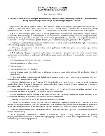 UCHWAŁA NR XXIII / 144 / 2012 RADY MIEJSKIEJ W LWÓWKU z dnia 28 czerwca 2012 r. w sprawie: ustalenia wysokości opłat za świadczenia udzielane przez publiczne przedszkola i publiczne inne formy wychowania przedszkolnego prowadzone przez gminę Lwówek. Na podstawie art. 18 ust. 2 pkt 15 ustawy z dnia 8 marca 1990 r. o samorządzie gminnym (tekst jednolity Dz. U. z 2001 r. Nr 142, poz. 1591 z późn. zm.) oraz art. 14 ust. 5 ustawy z dnia 7 września 1991 r. o systemie oświaty (tekst jednolity Dz. U. z 2004 r. Nr 256, poz. 2572 z późn. zm.) Rada Miejska w Lwówku uchwala, co następuje: § 1. 1. W prowadzonych przez gminę Lwówek publicznych przedszkolach i publicznych innych formach wychowania przedszkolnego, o których mowa w art. 14a ustawy o systemie oświaty, zwanych dalej placówkami, w ramach realizacji podstawy programowej wychowania przedszkolnego, zapewnia się bezpłatne nauczanie, wychowanie i opiekę w wymiarze 5 godzin dziennie, od poniedziałku do piątku, przez pięć dni w tygodniu. 2. Wykaz godzin bezpłatnego nauczania, o którym mowa w ust. 1, ustalony jest dla każdej z placówek odrębną uchwałą rady pedagogicznej danej placówki. 3. Uchwała, o której mowa w ust. 2 podana jest do publicznej wiadomości przez wywieszenie jej na tablicy ogłoszeń danej placówki. § 2. 1. Opłacie podlegają świadczenia wykraczające poza podstawę programową wychowania przedszkolnego, realizowane w placówkach, w godzinach ich działania, poza czasem określonym w uchwałach, o których mowa w § 1 ust. 3. 2. Świadczenia, o których mowa w ust. 1 obejmują: 1) zajęcia opiekuńczo-wychowawcze; 2) zajęcia sportowe; 3) zajęcia relaksacyjno – wyciszające; 4) zajęcia terapeutyczne i profilaktyczne z udziałem logopedy, nauczyciela gimnastyki korekcyjnej i innych specjalistów. 3. Wysokość opłaty za czas realizacji świadczeń, o których mowa w ust. 1 oblicza się procentowo od kwoty minimalnego wynagrodzenia za pracę. 4. Opłata, o której mowa w ust. 3 wynosi 0,12 % minimalnego wynagrodzenia za pracę, za każdą rozpoczętą godzinę korzystania dziecka ze świadczenia, w przypadku korzystania przez dziecko ze świadczenia w wymiarze nieprzekraczającym 1 godziny dziennie. 5. Przy wydłużeniu pobytu dziecka w placówce o więcej niż 1 godzinę dziennie, od opłaty ustalonej w ust. 4 udziela się bonifikaty w wysokości 20 % za każdą rozpoczętą godzinę. 6. Przy wydłużeniu pobytu dziecka w placówce o więcej niż 2 godziny dziennie od opłaty ustalonej w ust. 4 udziela się bonifikaty w wysokości 40 % za każdą rozpoczętą godzinę. 7. Opłata o której mowa w ust. 1, nie obejmuje kosztów wyżywienia. 8. Miesięczna wysokość opłaty za czas realizacji świadczeń, o których mowa w ust. 1 ustalona jest jako iloczyn: stawek godzinowych, o których mowa w ust. 4 - 6, deklarowanej przez rodziców (opiekunów prawnych) liczby godzin pobytu dziecka w placówce ponad 5 godzin dziennie oraz liczby dni pobytu dziecka w placówce. 9. Opłata, o której mowa w ust. 8 jest obowiązkowa i musi być uiszczona z góry do 15 dnia każdego miesiąca, którego opłata dotyczy. 10. W przypadku nieobecności dziecka w Przedszkolu opłata, o której mowa w ust. 8, podlega proporcjonalnemu zmniejszeniu w miesiącu następującym po miesiącu, w którym dziecko było nieobecne za każdy dzień absencji w miesiącu poprzednim. ————————————————————————————————————————————————————————— Id: 5B55430D-6C50-432A-BFD2-F7ABEB42D8C5. Podpisany Strona 1 11. Czas pobytu dziecka w placówce, zakres świadczeń, o których mowa w ust 1 oraz zasady odpłatności za te świadczenia określi umowa cywilno – prawna zawarta pomiędzy dyrektorem placówki a rodzicami (opiekunami prawnymi) dziecka. § 3. Koszty ponoszone za realizację podstawy programowej wychowania przedszkolnego oraz świadczeń, o których mowa w § 2 ust. 1 i 2 ponoszone są w całości przez organ prowadzący. Przedszkole może świadczyć inne dodatkowe usługi np. rytmika, nauka języków obcych. Usługi te organizuje dyrektor przedszkola na wniosek rodziców dzieci uczęszczających do placówki, pod warunkiem pełnego pokrycia kosztów ze środków poza budżetem gminy. § 4. Z dniem wejścia w życie uchwały traci moc uchwała nr VI/29/2011 Rady Miejskiej w Lwówku z dnia 25 lutego 2011 r. w sprawie ustalenia wysokości opłat za świadczenia udzielane przez publiczne przedszkola i publiczne inne formy wychowania przedszkolnego prowadzone przez gminę Lwówek. § 5. Wykonanie uchwały powierza się Burmistrzowi Miasta i Gminy Lwówek. § 6. Uchwała podlega ogłoszeniu w Dzienniku Urzędowym Województwa Wielkopolskiego i wchodzi w życie z dniem 1 września 2012 r. Przewodniczący Rady Miejskiej w Lwówku Arkadiusz Kaźmierczak ————————————————————————————————————————————————————————— Id: 5B55430D-6C50-432A-BFD2-F7ABEB42D8C5. Podpisany Strona 2 Uzasadnienie do uchwały Nr XXIII/144/2012 Rady Miejskiej w Lwówku z dnia 28 czerwca 2012 r. Znowelizowany art. 14 ust. 5 ustawy o systemie oświaty zobowiązał organy prowadzące do ustalenia wysokości opłat za świadczenia udzielane przez przedszkola publiczne oraz inne formy wychowania przedszkolnego w czasie przekraczającym wymiar zajęć przeznaczony na realizację programu wychowania przedszkolnego, uwzględniającego podstawę programową wychowania przedszkolnego. Dotychczasowa uchwała Rady Miejskiej w Lwówku w sprawie opłat za usługi świadczone przez przedszkola publiczne, zdaniem Prokuratury Rejonowej w Nowym Tomyślu, nie spełniała wymogów zawartych w ww. nowelizacji. W obecnym projekcie uchwały wyszczególniono świadczenia realizowane w przedszkolach publicznych w czasie przekraczającym 5 godzin dziennie, które s