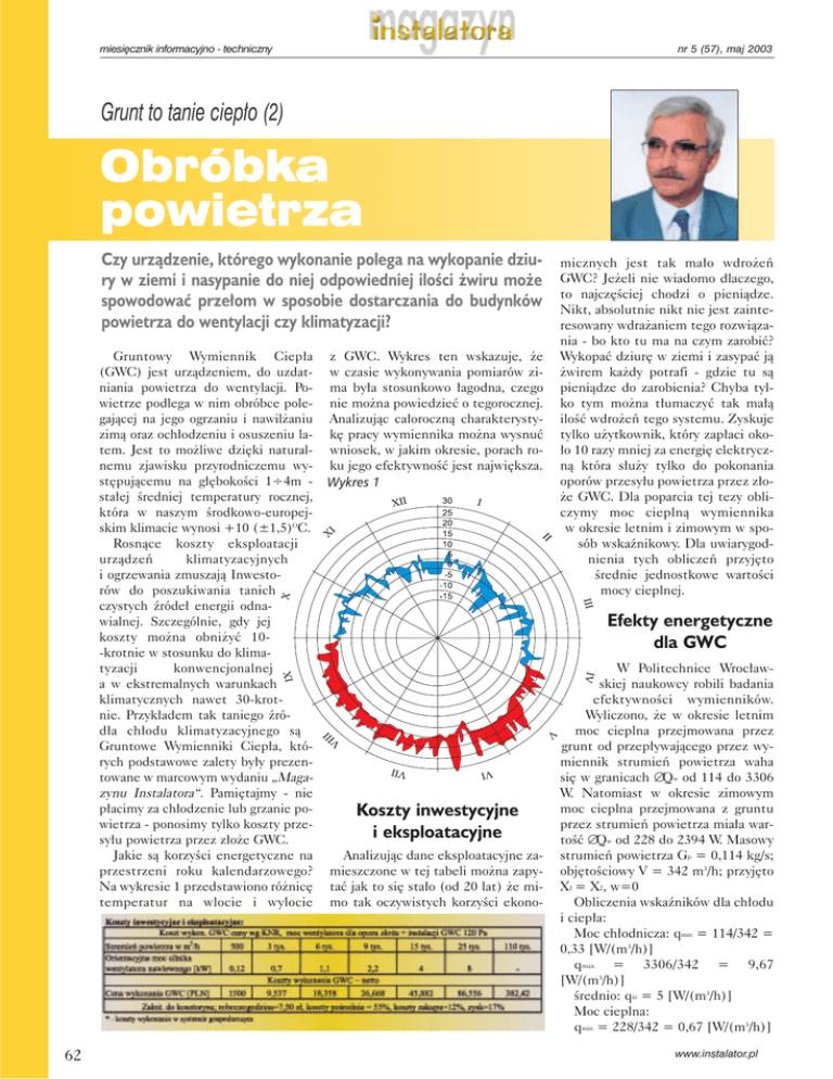 miesi´cznik informacyjno - techniczny nr 5 (57), maj 2003 Grunt to tanie ciep∏o (2) Obróbka powietrza Czy urzàdzenie, którego wykonanie polega na wykopanie dziury w ziemi i nasypanie do niej odpowiedniej iloÊci ˝wiru mo˝e spowodowaç prze∏om w sposobie dostarczania do budynków powietrza do wentylacji czy klimatyzacji? Gruntowy Wymiennik Ciep∏a (GWC) jest urzàdzeniem, do uzdatniania powietrza do wentylacji. Powietrze podlega w nim obróbce polegajàcej na jego ogrzaniu i nawil˝aniu zimà oraz och∏odzeniu i osuszeniu latem. Jest to mo˝liwe dzi´ki naturalnemu zjawisku przyrodniczemu wyst´pujàcemu na g∏´bokoÊci 1÷4m sta∏ej Êredniej temperatury rocznej, która w naszym Êrodkowo-europejskim klimacie wynosi +10 (±1,5)OC. Rosnàce koszty eksploatacji urzàdzeƒ klimatyzacyjnych i ogrzewania zmuszajà Inwestorów do poszukiwania tanich czystych êróde∏ energii odnawialnej. Szczególnie, gdy jej koszty mo˝na obni˝yç 10-krotnie w stosunku do klimatyzacji konwencjonalnej a w ekstremalnych warunkach klimatycznych nawet 30-krotnie. Przyk∏adem tak taniego êród∏a ch∏odu klimatyzacyjnego sà Gruntowe Wymienniki Ciep∏a, których podstawowe zalety by∏y prezentowane w marcowym wydaniu „Magazynu Instalatora“. Pami´tajmy - nie p∏acimy za ch∏odzenie lub grzanie powietrza - ponosimy tylko koszty przesy∏u powietrza przez z∏o˝e GWC. Jakie sà korzyÊci energetyczne na przestrzeni roku kalendarzowego? Na wykresie 1 przedstawiono ró˝nic´ temperatur na wlocie i wylocie 62 z GWC. Wykres ten wskazuje, ˝e w czasie wykonywania pomiarów zima by∏a stosunkowo ∏agodna, czego nie mo˝na powiedzieç o tegorocznej. Analizujàc ca∏orocznà charakterystyk´ pracy wymiennika mo˝na wysnuç wniosek, w jakim okresie, porach roku jego efektywnoÊç jest najwi´ksza. Wykres 1 micznych jest tak ma∏o wdro˝eƒ GWC? Je˝eli nie wiadomo dlaczego, to najcz´Êciej chodzi o pieniàdze. Nikt, absolutnie nikt nie jest zainteresowany wdra˝aniem tego rozwiàzania - bo kto tu ma na czym zarobiç? Wykopaç dziur´ w ziemi i zasypaç jà ˝wirem ka˝dy potrafi - gdzie tu sà pieniàdze do zarobienia? Chyba tylko tym mo˝na t∏umaczyç tak ma∏à iloÊç wdro˝eƒ tego systemu. Zyskuje tylko u˝ytkownik, który zap∏aci oko∏o 10 razy mniej za energi´ elektrycznà która s∏u˝y tylko do pokonania oporów przesy∏u powietrza przez z∏o˝e GWC. Dla poparcia tej tezy obliczymy moc cieplnà wymiennika w okresie letnim i zimowym w sposób wskaênikowy. Dla uwiarygodnienia tych obliczeƒ przyj´to Êrednie jednostkowe wartoÊci mocy cieplnej. Efekty energetyczne dla GWC Koszty inwestycyjne i eksploatacyjne Analizujàc dane eksploatacyjne zamieszczone w tej tabeli mo˝na zapytaç jak to si´ sta∏o (od 20 lat) ˝e mimo tak oczywistych korzyÊci ekono- W Politechnice Wroc∏awskiej naukowcy robili badania efektywnoÊci wymienników. Wyliczono, ˝e w okresie letnim moc cieplna przejmowana przez grunt od przep∏ywajàcego przez wymiennik strumieƒ powietrza waha si´ w granicach ∆Qw od 114 do 3306 W. Natomiast w okresie zimowym moc cieplna przejmowana z gruntu przez strumieƒ powietrza mia∏a wartoÊç ∆Qw od 228 do 2394 W. Masowy strumieƒ powietrza Gp = 0,114 kg/s; obj´toÊciowy V = 342 m3/h; przyj´to X1 = X2, w=0 Obliczenia wskaêników dla ch∏odu i ciep∏a: Moc ch∏odnicza: qmin = 114/342 = 0,33 [W/(m3/h)] qmax = 3306/342 = 9,67 [W/(m3/h)] Êrednio: qÊr = 5 [W/(m3/h)] Moc cieplna: qmin = 228/342 = 0,67 [W/(m3/h)] www.instalator.pl