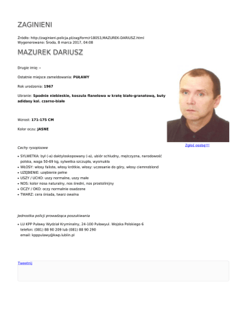 ZAGINIENI Źródło: http://zaginieni.policja.pl/zag/form/r18053,MAZUREK-DARIUSZ.html Wygenerowano: Środa, 8 marca 2017, 04:08 MAZUREK DARIUSZ Drugie imię: Ostatnie miejsce zameldowania: PUŁAWY Rok urodzenia: 1967 Ubranie: Spodnie niebieskie, koszula flanelowa w kratę biało-granatową, buty adidasy kol. czarno-białe Wzrost: 171-175 CM Kolor oczu: JASNE Cechy rysopisowe ● SYLWETKA: był (-a) daktyloskopowany (-a), ubiór schludny, mężczyzna, narodowość polska, waga 50-69 kg, sylwetka szczupła, wysmukła ● WŁOSY: włosy faliste, włosy krótkie, włosy: uczesanie do góry, włosy ciemnoblond ● UZĘBIENIE: uzębienie pełne ● USZY / UCHO: uszy normalne, uszy małe ● NOS: kolor nosa naturalny, nos średni, nos prostolinijny ● OCZY / OKO: oczy normalnie osadzone ● TWARZ: cera śniada, twarz owalna Jednostka policji prowadząca poszukiwania ● LU KPP Puławy Wydział Kryminalny, 24-100 Puławyul. Wojska Polskiego 6 telefon: (081) 88 90 209 lub (081) 88 90 290 email: [email protected] Tweetnij Zgłoś osobę!!!