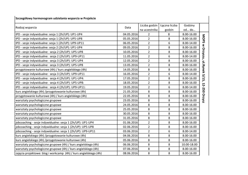 SzczegółowyharmonogramudzielaniawsparciawProjekcie Rodzajwsparcia 04.05.2016 05.05.2016 06.05.2016 09.05.2016 10.05.2016 11.05.2016 12.05.2016 13.05.2016 14.05.2016 16.05.2016 17.05.2016 18.05.2016 19.05.2016 21.05.2016 22.05.2016 23.05.2016 24.05.2016 25.05.2016 30.05.2016 31.05.2016 01.06.2016 02.06.2016 03.06.2016 04.06.2016 05.06.2016 06.06.2016 07.06.2016 08.06.2016 Liczbagodzin Łącznaliczba nauczestnika godzin 2 8 2 8 2 6 2 8 2 8 2 6 2 8 2 8 8 8 2 6 2 8 2 8 2 6 8 8 8 8 8 8 8 8 8 8 8 8 8 8 2 8 2 8 2 6 8 8 8 8 8 8 8 8 8 8 Godziny od…do… 8.00-16.00 8.00-16.00 8.00-14.00 8.00-16.00 8.00-16.00 8.00-14.00 8.00-16.00 8.00-16.00 8.00-16.00 8.00-14.00 8.00-16.00 8.00-16.00 8.00-14.00 8.00-16.00 8.00-16.00 8.00-16.00 8.00-16.00 8.00-16.00 8.00-16.00 8.00-16.00 8.00-16.00 8.00-16.00 8.00-14.00 8.00-16.00 8.00-16.00 10.00-18.00 8.00-16.00 8.00-16.00 MOPSwOrzyszu,ul.Rynek5/15,12-250Orzysz IPD-sesjeindywidualne:sesja1(2h/UP):UP1-UP4 IPD-sesjeindywidualne:sesja1(2h/UP):UP5-UP8 IPD-sesjeindywidualne:sesja1(2h/UP):UP9-UP11 IPD-sesjeindywidualne:sesja2(2h/UP):UP1-UP4 IPD-sesjeindywidualne:sesja2(2h/UP):UP5-UP8 IPD-sesjeindywidualne:sesja2(2h/UP):UP9-UP11 IPD-sesjeindywidualne:sesja3(2h/UP):UP1-UP4 IPD-sesjeindywidualne:sesja3(2h/UP):UP5-UP8 przygotowaniekulturowe(4h)/kursangielskiego(4h) IPD-sesjeindywidualne:sesja3(2h/UP):UP9-UP11 IPD-sesjeindywidualne:sesja4(2h/UP):UP1-UP4: IPD-sesjeindywidualne:sesja4(2h/UP):UP5-UP8: IPD-sesjeindywidualne:sesja4(2h/UP):UP9-UP11: kursangielskiego(4h)/przygotowaniekulturowe(4h) przygotowaniekulturowe(4h)/kursangielskiego(4h) warsztatypsychologicznegrupowe warsztatypsychologicznegrupowe warsztatypsychologicznegrupowe warsztatypsychologicznegrupowe warsztatypsychologicznegrupowe jobcoaching-sesjeindywidualne:sesja1(2h/UP):UP1-UP4 jobcoaching-sesjeindywidualne:sesja1(2h/UP):UP5-UP8 jobcoaching-sesjeindywidualne:sesja1(2h/UP):UP9-UP11 kursangielskiego(4h)/przygotowaniekulturowe(4h) kursangielskiego(4h)/przygotowaniekulturowe(4h) warsztatypsychologicznegrupowe(4h)/kursangielskiego(4h) warsztatypsychologicznegrupowe(4h)/kursangielskiego(4h) zajęciaprojektowe:blogiworkcamp(4h)/kursangielskiego(4h) Data zajęciaprojektowe:blogiworkcamp(4h)/kursangielskiego(4h) jobcoaching-sesjeindywidualne:sesja2(2h/UP):UP1-UP4 warsztatypsychologicznegrupowe(4h)/kursangielskiego(4h) warsztatypsychologicznegrupowe(4h)/kursangielskiego(4h) zajęciaprojektowe:blogiworkcamp(4h)/kursangielskiego(4h) zajęciaprojektowe:blogiworkcamp(4h)/kursangielskiego(4h) jobcoaching-sesjeindywidualne:sesja2(2h/UP):UP5-UP8 warsztatypsychologicznegrupowe(4h)/kursangielskiego(4h) zajęciaprojektowe:blogiworkcamp(4h)/kursangielskiego(4h) zajęciaprojektowe:blogiworkcamp(4h)/kursangielskiego(4h) zajęciaprojektowe:blogiworkcamp(4h)/kursangielskiego(4h) jobcoaching-sesjeindywidualne:sesja2(2h/UP):UP9-UP11 zajęciaprojektowe:blogiworkcamp(4h)/kursangielskiego(4h) zajęciaprojektowe:blogiworkcamp(4h)/kursangielskiego(4h) zajęciaprojektowe:blogiworkcamp(4h)/kursangielskiego(4h) Lekarzmedycynypracy jobcoaching-sesjeindywidualne:sesja3(2h/UP):UP1-UP4 jobcoaching-sesjeindywidualne:sesja3(2h/UP):UP5-UP8 jobcoaching-sesjeindywidualne:sesja3(2h/UP):UP9-UP11 kurszawodowy:kelner kurszawodowy:kelner kurszawodowy:kelner kurszawodowy:kelner kurszawodowy:kelner jobcoaching-sesjeindywidualne:sesja4(2h/UP):UP1-UP4 jobcoaching-sesjeindywidualne:sesja4(2h/UP):UP5-UP8 jobcoaching-sesjeindywidualne:sesja4(2h/UP):UP9-UP11 przygotowaniedowyjazdu przygotowaniedowyjazdu przygotowaniedowyjazdu Wylot:GRUPAplusMENTORPOLSKI 09.06.2016 10.06.2016 13.06.2016 14.06.2016 15.06.2016 16.06.2016 17.06.2016 20.06.2016 21.06.2016 22.06.2016 23.06.2016 24.06.2016 27.06.2016 28.06.2016 29.06.2016 30.06.2016 01.07.2016 04.07.2016 05.07.2016 11.07.2016 12.07.2016 13.07.2016 14.07.2016 15.07.2016 19.07.2016 20.07.2016 21.07.2016 25.07.2016 27.07.2016 28.07.2016 29.07.2016 8 2 8 8 8 8 2 8 8 8 8 2 8 8 8 niedotyczy 2 2 2 8 8 8 8 8 2 2 2 1 1 1 8 8 8 8 8 8 8 8 8 8 8 6 8 8 8 niedotyczy 8 8 6 8 8 8 8 8 8 8 6 1 1 1 10.00-18.00 8.00-16.00 10.00-18.00 8.00-16.00 8.00-16.00 10.00-18.00 8.00-16.00 10.00-18.00 8.00-16.00 8.00-16.00 10.00-18.00 8.00-14.00 10.00-18.00 8.00-16.00 8.00-16.00 niedotyczy 8.00-16.00 8.00-16.00 8.00-14.00 8.00-16.00 8.00-16.00 8.00-16.00 8.00-16.00 8.00-16.00 8.00-16.00 8.00-16.00 8.00-14.00 8.00-9.00 8.00-9.00 8.00-9.00