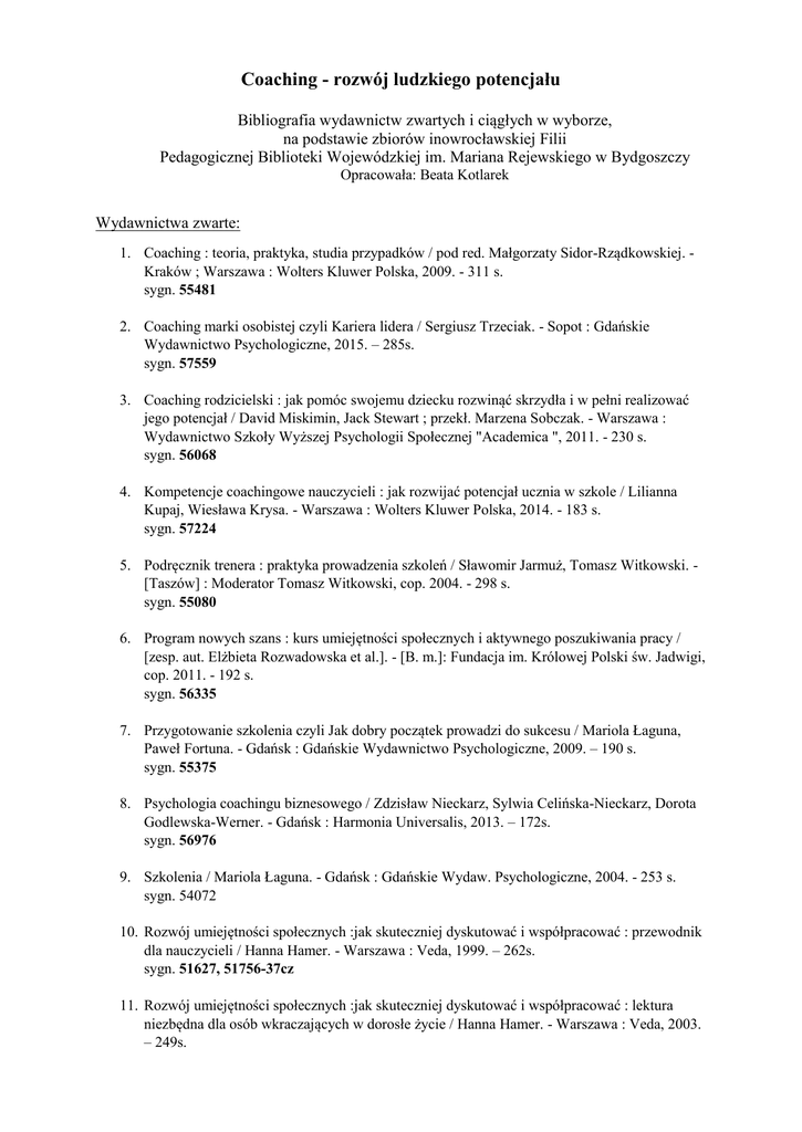 Coaching - rozwój ludzkiego potencjału Bibliografia wydawnictw zwartych i ciągłych w wyborze, na podstawie zbiorów inowrocławskiej Filii Pedagogicznej Biblioteki Wojewódzkiej im. Mariana Rejewskiego w Bydgoszczy Opracowała: Beata Kotlarek Wydawnictwa zwarte: 1. Coaching : teoria, praktyka, studia przypadków / pod red. Małgorzaty Sidor-Rządkowskiej. Kraków ; Warszawa : Wolters Kluwer Polska, 2009. - 311 s. sygn. 55481 2. Coaching marki osobistej czyli Kariera lidera / Sergiusz Trzeciak. - Sopot : Gdańskie Wydawnictwo Psychologiczne, 2015. – 285s. sygn. 57559 3. Coaching rodzicielski : jak pomóc swojemu dziecku rozwinąć skrzydła i w pełni realizować jego potencjał / David Miskimin, Jack Stewart ; przekł. Marzena Sobczak. - Warszawa : Wydawnictwo Szkoły Wyższej Psychologii Społecznej "Academica ", 2011. - 230 s. sygn. 56068 4. Kompetencje coachingowe nauczycieli : jak rozwijać potencjał ucznia w szkole / Lilianna Kupaj, Wiesława Krysa. - Warszawa : Wolters Kluwer Polska, 2014. - 183 s. sygn. 57224 5. Podręcznik trenera : praktyka prowadzenia szkoleń / Sławomir Jarmuż, Tomasz Witkowski. [Taszów] : Moderator Tomasz Witkowski, cop. 2004. - 298 s. sygn. 55080 6. Program nowych szans : kurs umiejętności społecznych i aktywnego poszukiwania pracy / [zesp. aut. Elżbieta Rozwadowska et al.]. - [B. m.]: Fundacja im. Królowej Polski św. Jadwigi, cop. 2011. - 192 s. sygn. 56335 7. Przygotowanie szkolenia czyli Jak dobry początek prowadzi do sukcesu / Mariola Łaguna, Paweł Fortuna. - Gdańsk : Gdańskie Wydawnictwo Psychologiczne, 2009. – 190 s. sygn. 55375 8. Psychologia coachingu biznesowego / Zdzisław Nieckarz, Sylwia Celińska-Nieckarz, Dorota Godlewska-Werner. - Gdańsk : Harmonia Universalis, 2013. – 172s. sygn. 56976 9. Szkolenia / Mariola Łaguna. - Gdańsk : Gdańskie Wydaw. Psychologiczne, 2004. - 253 s. sygn. 54072 10. Rozwój umiejętności społecznych :jak skuteczniej dyskutować i współpracować : przewodnik dla nauczycieli / Hanna Hamer. - Warszawa : Veda, 1999. – 262s. sygn. 51627, 51756-37cz 11. Rozwój umiejętności społecznych :jak skuteczniej dyskutować i współpracować : lektura niezbędna dla osób wkraczających w dorosłe życie / Hanna Hamer. - Warszawa : Veda, 2003. – 249s. sygn. 52829 12. Trener bez maski : o coachingu biznesowym w prostych słowach / David Taylor ; przeł. Agata Piskorska. - Warszawa : Wolters Kluwer Polska : International Publishing Service, 2010. 263 s. sygn. 55499 Artykuły, rozprawy i fragmenty w wydawnictwach zwartych: 1. Coaching rodzinny szansą zawodową dla pedagogów / Emilia Lipińska // W: Wychowanie, profilaktyka, terapia : szanse i zagrożenia / pod red. nauk. Magdaleny Boczkowskiej, Eweliny Tymoszuk, Patrycji Zielińskiej. - Kraków : Oficyna Wydawnicza "Impuls", 2012. – S. 175184 sygn. 56470 2. Psychologia twórczości grupowej : jak moderować zespoły twórcze i zadaniowe / Aneta Chybicka. - Kraków : Oficyna Wydawnicza "Impuls", 2006. – S. 155-197: Twórcze szkolenie sygn. 54182 Wydawnictwa ciągłe: 1. Coaching a psychoterapia – podobieństwa i różnice / Benedykt K. Peczko // Remedium . – 2011, nr 2, s. 22-23 2. Coaching – jako alternatywna technika pracy socjalnej / Katarzyna WasilewskaOstrowska // Praca Socjalna . – 2013, nr 4, s. 34-42 3. Coaching jako proces skierowany na rozwój uzdolnień do gry / Eugeniusz Piotrowski // Wychowanie na co Dzień . – 2008, nr 10-11, s. 50 4. Coaching – nowe słowo na określenie znanej metody / Justyna Parzeniowska, Wiesława Serkowska // Edukacja i Dialog . – 2005, nr 8, s. 62-66 5. Coaching rodziny / Mirosława Britzkow // Problemy Opiekuńczo-Wychowawcze . – 2008, nr 7, s. 47-52 6. Coaching społeczny w pracy z młodzieżą zagrożoną nieprzystosowaniem / Karol Konaszewski, Anna Chańko // Problemy Opiekuńczo-Wychowawcze . – 2014, nr 3, s. 24-28 7. Coaching – trzeba umieć się uczyć / Artur Brzeziński // Nowa Szkoła . – 2013, nr 9, s. 35-36 8. Coaching w pracy nauczyciela / Lidia Pokrzycka // Nowa Szkoła . – 2012, nr 10, s. 46-49 9. Coaching w szkole / Iwona Werner, Justyna Deręgowska // Głos Nauczycielski. - 2013, nr 15, s. 18 10. Dialog w mentoringu / Wioletta Junik // Kwartalnik Pedagogiczny . – 2012, nr 4, s. 95106 11. Halt coaching – możliwości wykorzystania coachingu w opiece medycznej / Konrad Kulikowski // Niepełnosprawność i Rehabilitacja . – 2014, nr 1, s. 44-55 12. Interakcje rówieśnicze – zjawisku tutoringu dziecięcego / Agnieszka Pawlak // Nowa Szkoła . – 2006, nr 3, s. 41-47 13. Jak wykorzystać zjawisko tutoringu dziecięcego ? / Agnieszka Pawlak // Nowa Szkoła . – 2007, nr 3, s. 29-34 14. Mentoring formalny jako narzędzie rozwijania synergii w środowisku szkolnym / Eliza Czerkaska-Fortuna // Edukacja i Dialog . – 2011, nr 11/12, s. 44-47 15. Mistrz i przewodnik / Rafał Ryszka // Wychowawca . – 2007, nr 6, s. 5-7 16. Na marginesie zarządzania – mentoring i coaching w praktyce bibliotecznej / Jadwiga Sadowska // Bibliotekarz . – 2009, nr 10, s. 5-8 17. Nauczanie nieformalne : tutoring jako jedna z form strategii edukacyjnej nauczyciela / Jolanta Sajdera // Nowa Szkoła . – 2005, nr 4, s. 23-26 18. Niewidzialna ręka / Anna Raczyńska // Edukacja i Dialog . – 2012, nr 7/8, s. 38-41 19. O metodach wewnątrzszkolnego doskonalenia nauczycieli / Bożena Nowak-Justyna // Wszystko dla Szkoły . – 2001, nr 3, s. 3, 5 20. Perspektywy w zawodach – związanych z aktywnością fizyczną / Michał Bronikowski // Wychowanie Fizyczne i Zdrowotne . – 2012, nr 4, s. 8-11 21. Rodzina „patchworkowa” / Monika Pawłowska // Wychowanie w Przedszkolu . – 2013, nr 2, s. 18-21 22. Rozwój talentów metodą tutoringu / Agnieszka Rowicka // Problemy OpiekuńczoWychowawcze . – 2015, nr 4, s. 28-40 23. Tutoring szansą dla systemu edukacji / Maria Sitko // Problemy OpiekuńczoWychowawcze . – 2011, nr 4, s. 27-32 24. Tutoring w pracy nauczyciela tematem konferencj