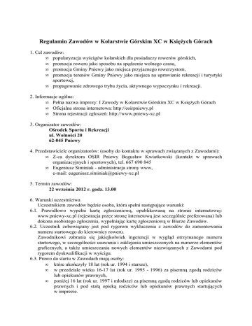 Regulamin Zawodów w Kolarstwie Górskim XC w Księżych Górach 1. Cel zawodów: • popularyzacja wyścigów kolarskich dla posiadaczy rowerów górskich, • promocja roweru jako sposobu na spędzenie wolnego czasu, • promocja Gminy Pniewy jako miejsca przyjaznego rowerzystom, • promocja terenów Gminy Pniewy jako miejsca na uprawianie rekreacji i turystyki sportowej, • propagowanie zdrowego trybu życia, aktywnego wypoczynku i rekreacji. 2. Informacje ogólne: • Pełna nazwa imprezy: I Zawody w Kolarstwie Górskim XC w Księżych Górach • Oficjalna strona internetowa: http://osirpniewy.pl • Strona rejestracji zgłoszeń: http://www.pniewy-xc.pl 3. Organizator zawodów: Ośrodek Sportu i Rekreacji ul. Wolności 20 62-045 Pniewy 4. Przedstawiciele organizatorów: (osoby do kontaktu w sprawach związanych z Zawodami): • Z-ca dyrektora OSIR Pniewy Bogusław Kwiatkowski (kontakt w sprawach organizacyjnych i sportowych), tel. 667 690 845 • Eugeniusz Siminiak - administracja strony www, e-mail: [email protected] 5. Termin zawodów: 22 września 2012 r. godz. 13.00 6. Warunki uczestnictwa Uczestnikiem zawodów będzie osoba, która spełni następujące warunki: 6.1. Prawidłowo wypełni kartę zgłoszeniową, opublikowaną na stronie internetowej: www.pniewy-xc.pl (rejestracja przez stronę internetową jest szczególnie preferowana) lub dokona osobistego zgłoszenia, wypełniając kartę zgłoszeniową w Biurze Zawodów. 6.2. Uczestnik zobowiązany jest pod rygorem wykluczenia z zawodów do zamontowania numeru startowego do kierownicy roweru. Zawodnikowi zabrania się jakiejkolwiek ingerencji w wygląd otrzymanego numeru startowego, w szczególności usuwania i zaklejania umieszczonych na numerze elementów graficznych, a także umieszczania nowych elementów niezwiązanych z Zawodami pod rygorem dyskwalifikacji w wyścigu. 6.3. Prawo do startu w Zawodach mają osoby: • które ukończyły 18 lat (rok ur. 1994 i starsze), • w przedziale wieku 16-17 lat (rok ur. 1995 - 1996) za pisemną zgodą rodziców lub opiekunów prawnych, • poniżej 16 lat (rok ur. 1997 i młodsze) za pisemną zgodą rodziców lub opiekunów prawnych i pod stałą opieką rodziców lub opiekunów prawnych startujących w imprezie. 6.4. Każdy uczestnik startuje na własną odpowiedzialność (w przypadku zawodników niepełnoletnich na odpowiedzialność rodziców lub prawnych opiekunów). Każdy uczestnik ponosi pełną odpowiedzialność wobec organizatora, innych uczestników Zawodów lub osób trzecich za naruszenie postanowień niniejszego Regulaminu, zasad bezpieczeństwa obowiązujących na trasie, a także innych zarządzeń, instrukcji i wytycznych wydanych przez organizatorów lub udzielanych uczestnikom na bieżąco w trakcie trwania imprezy. 6.5. Dokonując zgłoszenia zgodnie z pkt. 6.1. niniejszego Regulaminu, uczestnik akceptuje poniższą klauzulę: Organizator, wszystkie osoby z nim współpracujące, a także osoby związane z przeprowadzeniem i organizacją wyścigu nie ponoszą odpowiedzialności względem uczestników za szkody osobowe, rzeczowe i majątkowe, które wystąpią przed, w trakcie lub po wyścigu. Uczestnicy startują na własną odpowiedzialność. Uczestnicy ponoszą odpowiedzialność cywilną i prawną za wszystkie szkody. Uczestnicy zrzekają się prawa dochodzenia prawnego lub zwrotnego od organizatora lub jego zleceniobiorców w razie wypadku lub szkody związanej z zawodami. Przyjmuję do wiadomości, że w razie wypadku nie mogę wnosić żadnych roszczeń w stosunku do organizatora i sponsorów. Przyjmuję do wiadomości, że należy przestrzegać zarządzeń służb porządkowych oraz warunków regulaminu Zawodów. Zgadzam się z warunkami uczestnictwa i zgłaszam swoje uczestnictwo w wyżej wymienionych zawodach. W przypadku startu młodzieży poniżej 18 lat wymagana jest zgoda rodzica lub opiekuna prawnego, poprzez złożenie podpisu. Zdjęcia, nagrania filmowe oraz wywiady z moją osobą, a także wyniki z moimi danymi osobowymi mogą być wykorzystane przez organizatora oraz współpracujące z nimi media (prasa, portale internetowe, itp.) w celach związanych z publikowaniem wyników, promocją i reklamą. Swoim podpisem zapewniam, że zapoznałem się z wszystkimi warunkami regulaminu zawodów i dokonałem rejestracji podając moje dane osobowe zgodnie z prawdą oraz kompletne. Wyrażam zgodę na przetwarzanie moich danych osobowych, zgodnie z ustawą z dnia 29 sierpnia 1997 r. o ochronie danych osobowych (Dz.U.Nr 133, poz.883) z późniejszymi zmianami. 6.6. Każdy uczestnik Zawodów jest zobowiązany do jazdy w kasku sztywnym. Zawodnicy poruszający się po trasie Zawodów bez wymaganego kasku będą dyskwalifikowani. 6.7. W zawodach nie mogą brać udziału zawodnicy odbywający karę zawieszenia/dyskwalifikacji za używanie środków dopingujących. 6.8. Zawodnik, dokonując zgłoszenia zgodnie z pkt. 6.1. niniejszego Regulaminu, potwierdza, że zna i akceptuje niniejszy regulamin. 7. Kategorie wiekowe: Zawody mają charakter otwarty. Prawo startu mają kobiety oraz mężczyźni w następujących kategoriach : kategoria wiek rocznik Dzieci • żak do 11 lat ( 2001 – i młodsze) • młodzik/młodziczka 12 – 13 lat (1999 – 2000 ) Mężczyźni • junior młodszy 14 – 16 lat (1996 – 1998) • junior 17 – 19 lat (1993 – 1995) • elita 20 – 30 lat (1982 – 1992) • Masters I 31 – 39 lat (1973 – 1981) • Masters II 40 – 49 lat (1963 – 1972) • Masters III 50 – 56 lat (1956 – 1962) • Masters IV 57 lat i więcej (1955 i starsi) • Kategoria BMI dla zawodników o współczynniku BMI większym niż 30. Wielkość BMI jest opisana wzorem: masa człowieka w kilogramach podzielona przez kwadrat jego wzrostu w metrach. Tabela kwalifikująca do kategorii BMI znajduje się na stronie www.pniewy-xc.pl Kobiety • juniorka młodsza 14 – 16 lat (1996 – 1998) • juniorka 17 – 19 lat (1993 – 1995) • elita 20 – 3