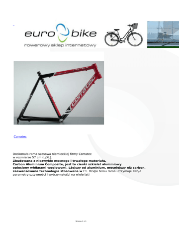 Corratec Doskonała rama szosowa niemieckiej firmy Corratec w rozmiarze 57 cm (L/XL). Zbudowana z niezwykle mocnego i trwałego materiału, Carbon Aluminium Composite, jest to cienki szkielet aluminiowy opleciony włóknami węglowymi. Lżejszy od aluminium, mocniejszy niż carbon, zaawansowana technologia stosowana w F1. Dzięki temu rama utrzymuje swoje parametry sztywności i wytrzymałości na wiele lat! Strona 1 z 1
