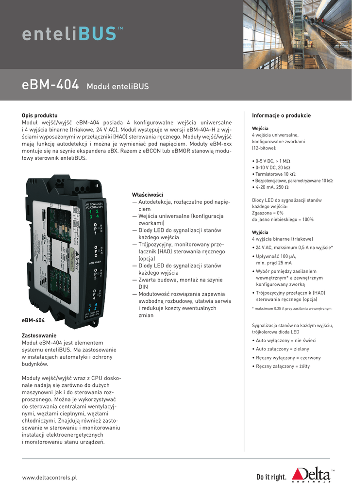 enteliBUS eBM-404 ™ Moduł enteliBUS Opis produktu Moduł wejść/wyjść eBM-404 posiada 4 konfigurowalne wejścia uniwersalne i 4 wyjścia binarne (triakowe, 24 V AC). Moduł występuje w wersji eBM-404-H z wyjściami wyposażonymi w przełączniki (HAO) sterowania ręcznego. Moduły wejść/wyjść mają funkcję autodetekcji i można je wymieniać pod napięciem. Moduły eBM-xxx montuje się na szynie ekspandera eBX. Razem z eBCON lub eBMGR stanowią modułowy sterownik enteliBUS. eBM-404 Zastosowanie Moduł eBM-404 jest elementem systemu enteliBUS. Ma zastosowanie w instalacjach automatyki i ochrony budynków. Moduły wejść/wyjść wraz z CPU doskonale nadają się zarówno do dużych maszynowni jak i do sterowania rozproszonego. Można je wykorzystywać do sterowania centralami wentylacyjnymi, węzłami cieplnymi, węzłami chłodniczymi. Znajdują również zastosowanie w sterowaniu i monitorowaniu instalacji elektroenergetycznych i monitorowaniu stanu urządzeń. www.deltacontrols.pl Właściwości —Autodetekcja, rozłączalne pod napięciem —Wejścia uniwersalne (konfiguracja zworkami) —Diody LED do sygnalizacji stanów każdego wejścia —Trójpozycyjny, monitorowany przełącznik (HAO) sterowania ręcznego (opcja) —Diody LED do sygnalizacji stanów każdego wyjścia —Zwarta budowa, montaż na szynie DIN —Modułowość rozwiązania zapewnia swobodną rozbudowę, ułatwia serwis i redukuje koszty ewentualnych zmian Informacje o produkcie Wejścia 4 wejścia uniwersalne, konfigurowalne zworkami (12-bitowe): • 0-5 V DC, > 1 MΩ • 0-10 V DC, 20 kΩ • Termistorowe 10 kΩ • Bezpotencjałowe, parametryzowane 10 kΩ • 4-20 mA, 250 Ω Diody LED do sygnalizacji stanów każdego wejścia: Zgaszona = 0% do jasno niebieskiego = 100% Wyjścia 4 wyjścia binarne (triakowe) • 24 V AC, maksimum 0,5 A na wyjście* • Upływność 100 μA, min. prąd 25 mA • Wybór pomiędzy zasilaniem wewnętrznym* a zewnętrznym konfigurowany zworką • Trójpozycyjny przełącznik (HAO) sterowania ręcznego (opcja) * maksimum 0,25 A przy zasilaniu wewnętrznym Sygnalizacja stanów na każdym wyjściu, trójkolorowa dioda LED • Auto wyłączony = nie świeci • Auto załączony = zielony • Ręczny wyłączony = czerwony • Ręczny załączony = żółty enteliBUS ™ Rozmieszczenie podstawowych elementów Informacje o produkcie (ciąg dalszy) Złącza Listwy zaciskowe rozłączne Złącza wyjść Klasa okablowania Klasa 2 / SELV LED stany wyjść Zworki konfiguracji wyjść Zworki konfiguracji wejść Przełącznik sterowania ręcznego Zasilanie Napięcie zasilania: 24 V AC Pobór mocy samego modułu: 5 VA Pobór mocy przy maksymalnym obciążeniu wyjść: 27 VA Środowisko pracy (montaż poziomy) 0-55°C 10-95% RH (bez kondensacji) Wymiary 12,6 x 2,3 x 10,0 cm (wys. x szer. x gł.) Montaż Szyna DIN 35 mm Obudowa Stopień ochrony IP30 Certyfikaty / Normy CE; FCC; UL916 Złącza wejść LED stanu wejść Złącze szyny przyłączeniowej Sposób zamawiania eBM-404 Moduł enteliBUS, 4UI, 4BO (triak) eBM-404-H Moduł enteliBUS, 4UI, 4BO (triak), przełączniki HAO Elementy powiązane (Pełna lista w karcie: Modułowy sterownik enteliBUS. Zestawienie elementów.) eBX-04 Ekspander enteliBUS z szyną przyłączeniową dla 4 modułów wejść/wyjść eBX-08 Ekspander enteliBUS z szyną przyłączeniową dla 8 modułów wejść/wyjść eBCON Sterownik enteliBUS z szyną przyłączeniową dla 4 modułów wejść/wyjść Copyright © 2012 Delta Controls. Wszystkie prawa zastrzeżone. www.deltacontrols.pl