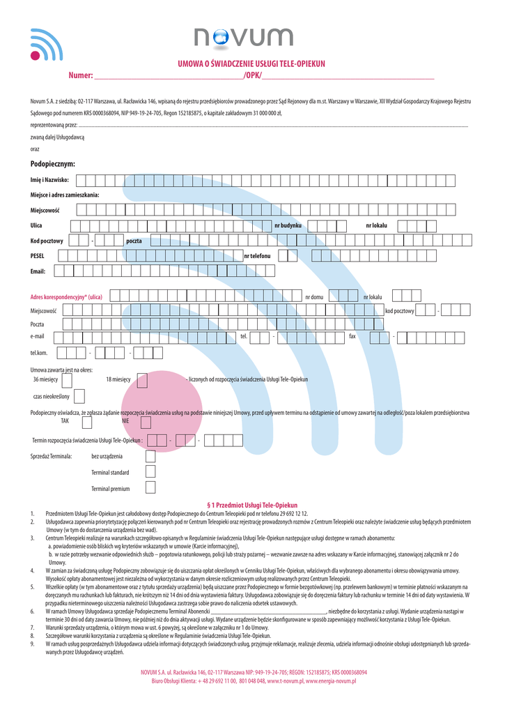UMOWA O ŚWIADCZENIE USŁUGI TELE-OPIEKUN Numer: ________________________________/OPK/_____________________________________ Novum S.A. z siedzibą: 02-117 Warszawa, ul. Racławicka 146, wpisaną do rejestru przedsiębiorców prowadzonego przez Sąd Rejonowy dla m.st. Warszawy w Warszawie, XII Wydział Gospodarczy Krajowego Rejestru Sądowego pod numerem KRS 0000368094, NIP 949-19-24-705, Regon 152185875, o kapitale zakładowym 31 000 000 zł, reprezentowaną przez: ........................................................................................................................................................................................................................................................................................................ zwaną dalej Usługodawcą oraz Podopiecznym: Imię i Nazwisko: Miejsce i adres zamieszkania: Miejscowość Ulicanr budynkunr lokalu Kod pocztowy - poczta PESELnr telefonu Email: Adres korespondencyjny* (ulica) nr domu Miejscowość nr lokalu kod pocztowy - Poczta e-mail tel.kom. - tel. - fax - - Umowa zawarta jest na okres: 36 miesięcy 18 miesięcy - liczonych od rozpoczęcia świadczenia Usługi Tele-Opiekun czas nieokreślony Podopieczny oświadcza, że zgłasza żądanie rozpoczęcia świadczenia usług na podstawie niniejszej Umowy, przed upływem terminu na odstąpienie od umowy zawartej na odległość/poza lokalem przedsiębiorstwa TAK NIE Termin rozpoczęcia świadczenia Usługi Tele-Opiekun : Sprzedaż Terminala: - - bez urządzenia Terminal standard Terminal premium 1. 2. 3. 4. 5. 6. 7. 8. 9. § 1 Przedmiot Usługi Tele-Opiekun Przedmiotem Usługi Tele-Opiekun jest całodobowy dostęp Podopiecznego do Centrum Teleopieki pod nr telefonu 29 692 12 12. Usługodawca zapewnia priorytetyzację połączeń kierowanych pod nr Centrum Teleopieki oraz rejestrację prowadzonych rozmów z Centrum Teleopieki oraz należyte świadczenie usług będących przedmiotem Umowy (w tym do dostarczenia urządzenia bez wad). Centrum Teleopieki realizuje na warunkach szczegółowo opisanych w Regulaminie świadczenia Usługi Tele-Opiekun następujące usługi dostępne w ramach abonamentu: a. powiadomienie osób bliskich wg kryteriów wskazanych w umowie (Karcie informacyjnej), b. w razie potrzeby wezwanie odpowiednich służb – pogotowia ratunkowego, policji lub straży pożarnej – wezwanie zawsze na adres wskazany w Karcie informacyjnej, stanowiącej załącznik nr 2 do Umowy. W zamian za świadczoną usługę Podopieczny zobowiązuje się do uiszczania opłat określonych w Cenniku Usługi Tele-Opiekun, właściwych dla wybranego abonamentu i okresu obowiązywania umowy. Wysokość opłaty abonamentowej jest niezależna od wykorzystania w danym okresie rozliczeniowym usług realizowanych przez Centrum Teleopieki. Wszelkie opłaty (w tym abonamentowe oraz z tytułu sprzedaży urządzenia) będą uiszczane przez Podopiecznego w formie bezgotówkowej (np. przelewem bankowym) w terminie płatności wskazanym na doręczanych mu rachunkach lub fakturach, nie krótszym niż 14 dni od dnia wystawienia faktury. Usługodawca zobowiązuje się do doręczenia faktury lub rachunku w terminie 14 dni od daty wystawienia. W przypadku nieterminowego uiszczenia należności Usługodawca zastrzega sobie prawo do naliczenia odsetek ustawowych. W ramach Umowy Usługodawca sprzedaje Podopiecznemu Terminal Abonencki __________________________________, niezbędne do korzystania z usługi. Wydanie urządzenia nastąpi w terminie 30 dni od daty zawarcia Umowy, nie później niż do dnia aktywacji usługi. Wydane urządzenie będzie skonfigurowane w sposób zapewniający możliwość korzystania z Usługi Tele-Opiekun. Warunki sprzedaży urządzenia, o którym mowa w ust. 6 powyżej, są określone w załączniku nr 1 do Umowy. Szczegółowe warunki korzystania z urządzenia są określone w Regulaminie świadczenia Usługi Tele-Opiekun. W ramach usług posprzedażnych Usługodawca udziela informacji dotyczących świadczonych usług, przyjmuje reklamacje, realizuje zlecenia, udziela informacji odnośnie obsługi udostępnianych lub sprzedawanych przez Usługodawcę urządzeń. NOVUM S.A. ul. Racławicka 146, 02-117 Warszawa NIP: 949-19-24-705; REGON: 152185875; KRS 0000368094 Biuro Obsługi Klienta: + 48 29 692 11 00, 801 048 048, www.t-novum.pl, www.energia-novum.pl § 2 Rozpoczęcie świadczenia Usługi Tele-Opiekun i czas trwania Umowy 1. 2. 3. 4. 5. 6. 1. Rozpoczęcie świadczenia Usługi nastąpi w terminie określonym w Umowie. Naliczanie opłat rozpocznie się od daty aktywacji Usługi i (rozpoczęcia świadczenia Usługi Tele-Opiekun). Umowa zawarta na czas określony po upływie okresu, na jaki Umowa została zawarta, ulega przedłużeniu na czas nieokreślony, chyba że najpóźniej na 30 dni przed upływem okresu jej obowiązywania do Usługodawcy wpłynie pisemne oświadczenie o rezygnacji z przedłużenia Umowy. Z chwilą przedłużenia Umowy na czas nieokreślony Podopieczny będzie zobowiązany do dalszego uiszczania opłat abonamentowych określonych w Cenniku oraz warunkach promocji załączonych do Umowy, na warunkach właściwych dla umowy zawartej na czas nieokreślony. Każda ze stron może rozwiązać Umowę z zachowaniem jednomiesięcznego okresu wypowiedzenia, przy czym rozwiązanie Umowy następuje w ostatnim dniu miesiąca, następującego po miesiącu, w którym druga strona otrzymała oświadczenie o wypowiedzeniu Umowy, w taki sposób, że mogła zapoznać się z jego treścią. Usługodawca może rozwiązać Umowę w każdym czasie ze skutkiem natychmiastowym wyłącznie w sytuacjach określonych w Regulaminie. W przypadku umów zawieranych na odległość lub poza lokalem przedsiębiorstwa konsumentowi przysługuje uprawnienie do odstąpienia od Umowy w terminie 14 dni od dnia jej zawarcia. W przypadku wypowiedzenia umowy przez Podopiecznego lub rozwiązania umowy z przyczyn leżących po stronie Podopiecznego, przed upływem okresu, n